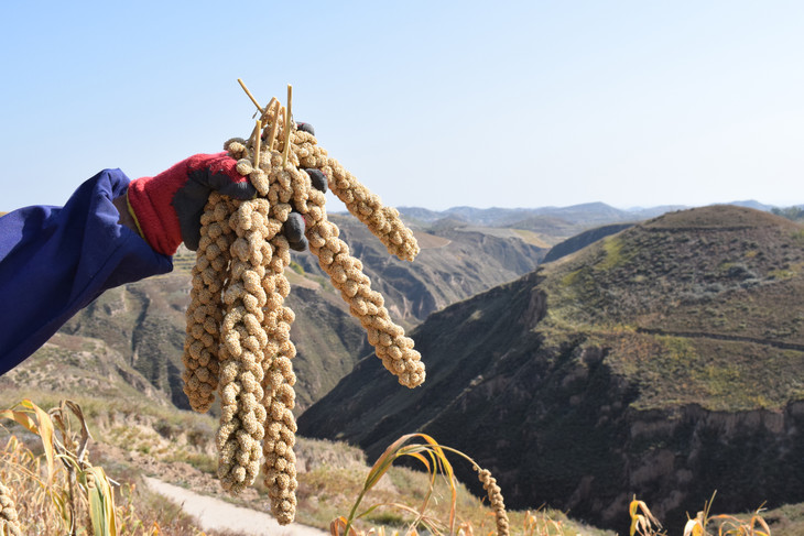 我们在陕北米脂县的山顶上种了一片谷子。