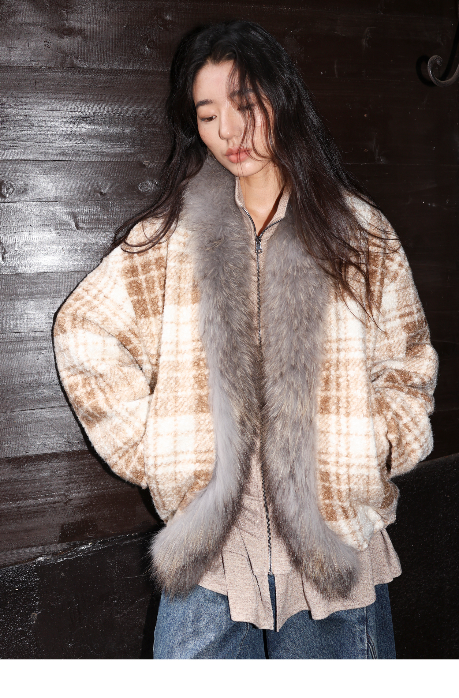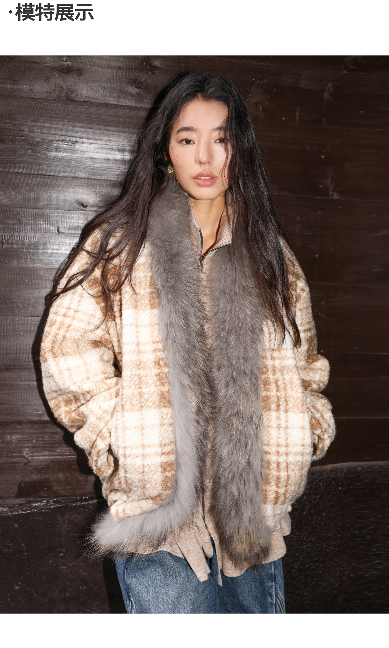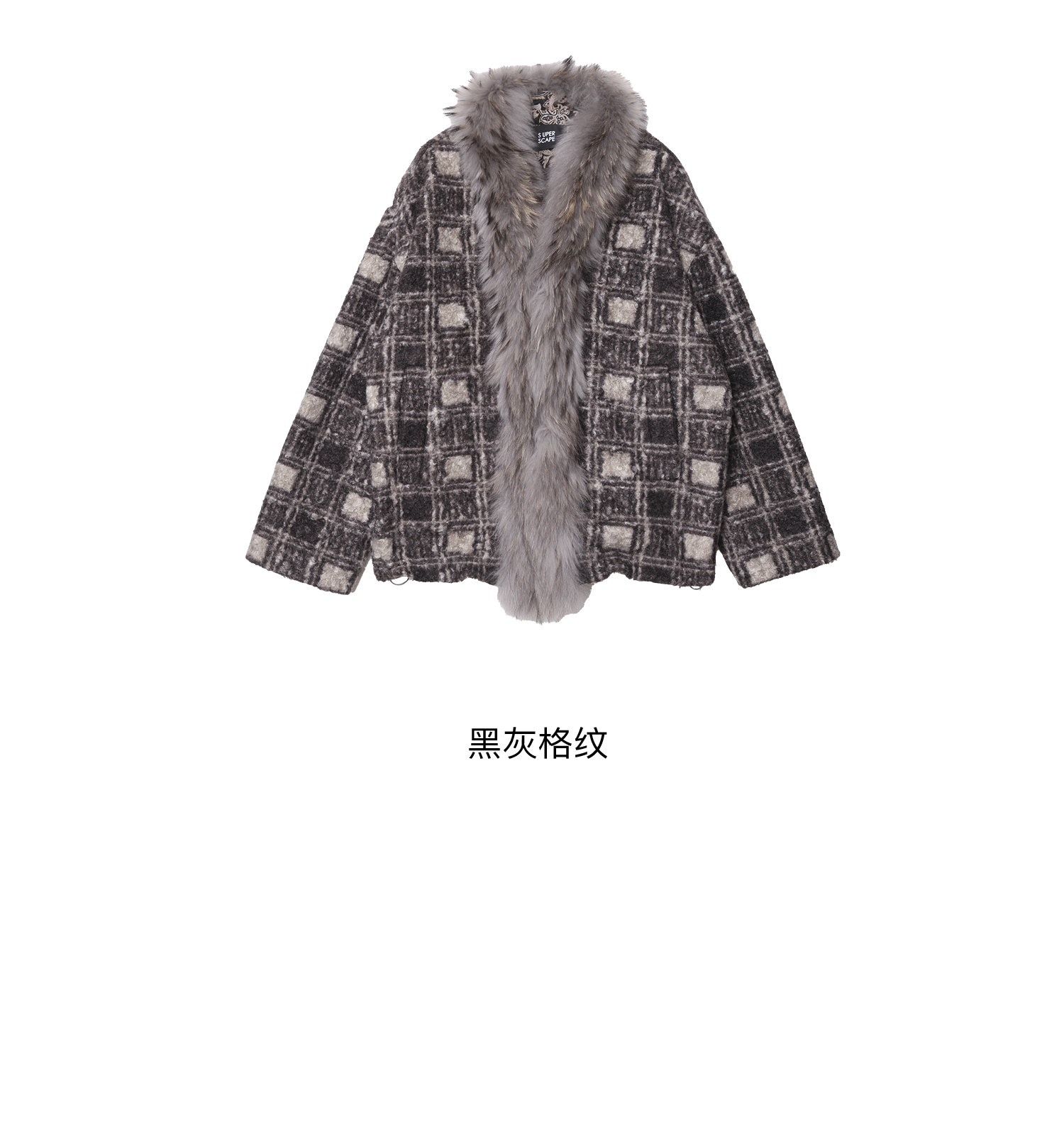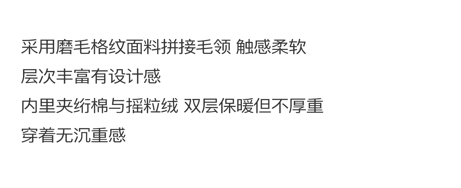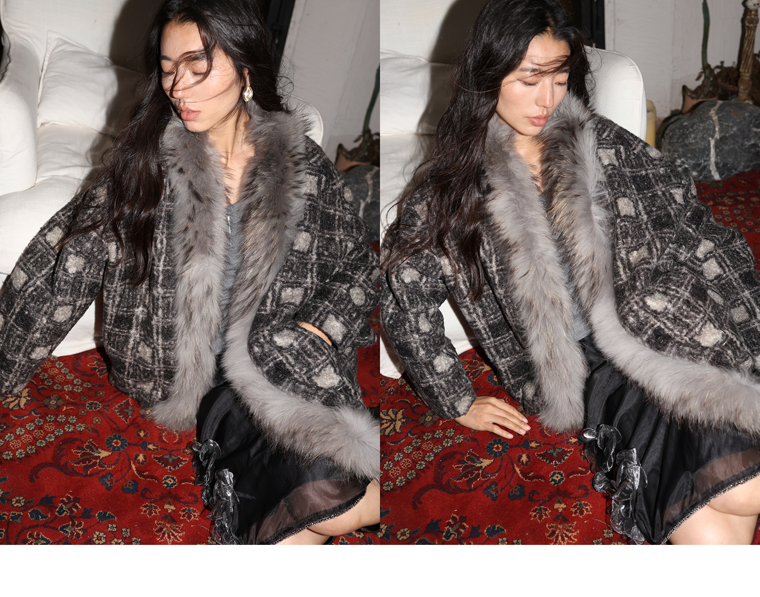 素舶 磨毛格纹拼接貉子毛皮草毛领内里绗棉摇粒绒双重保暖外套