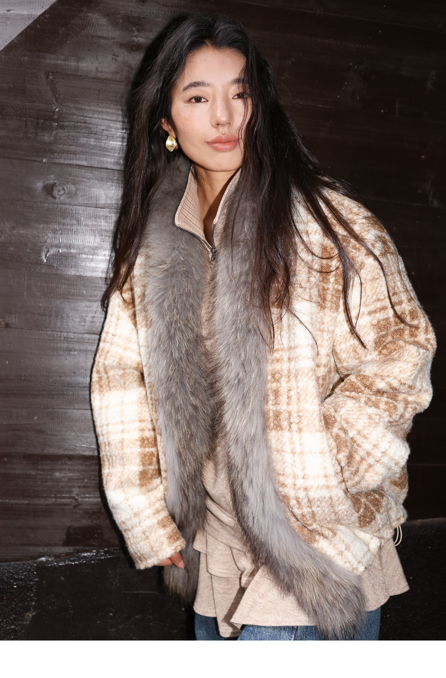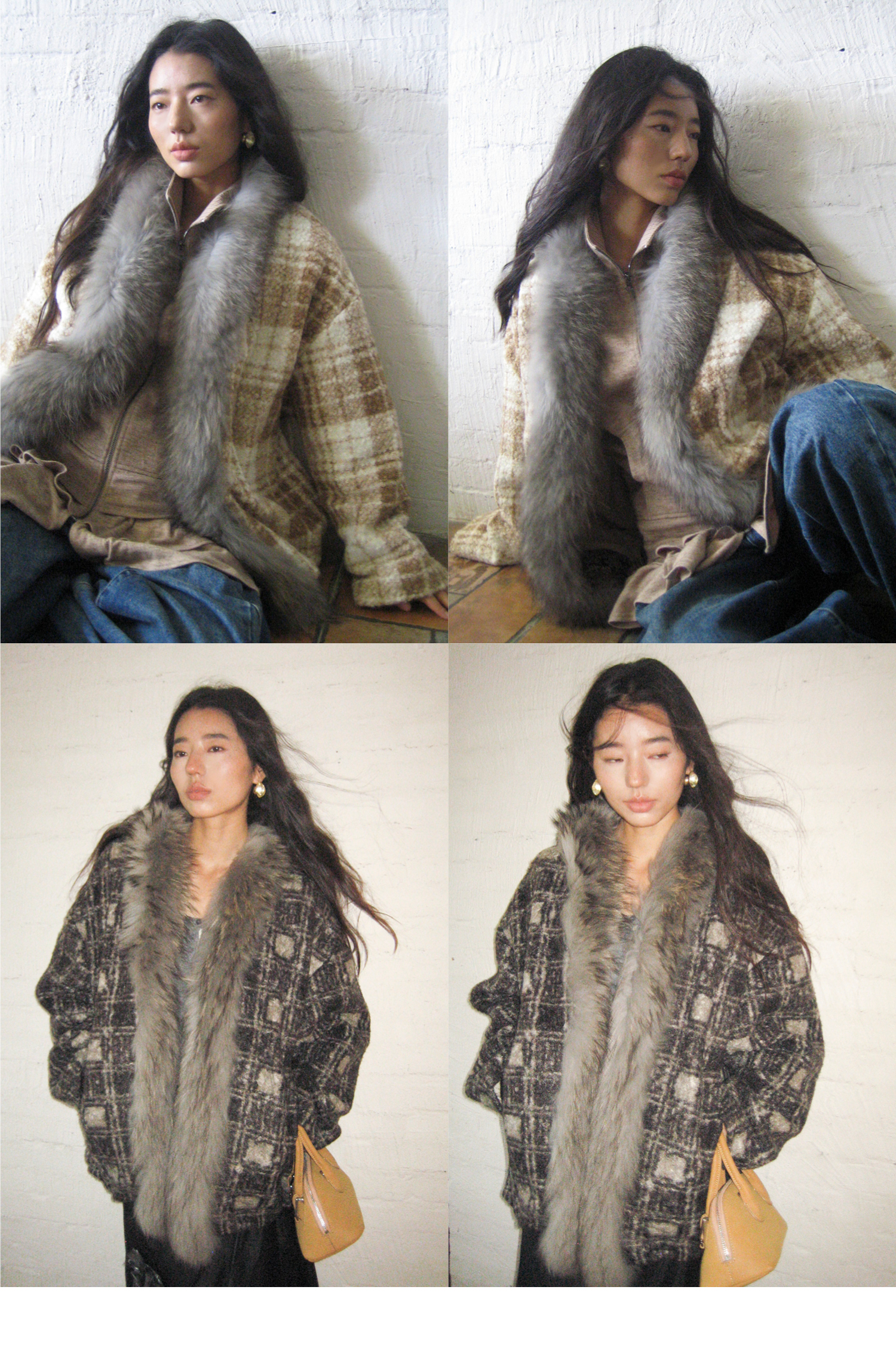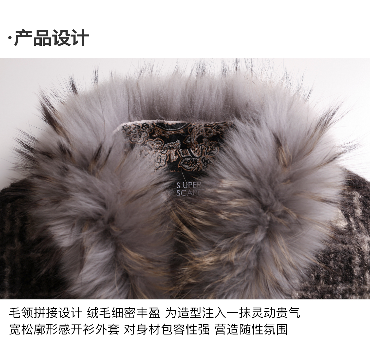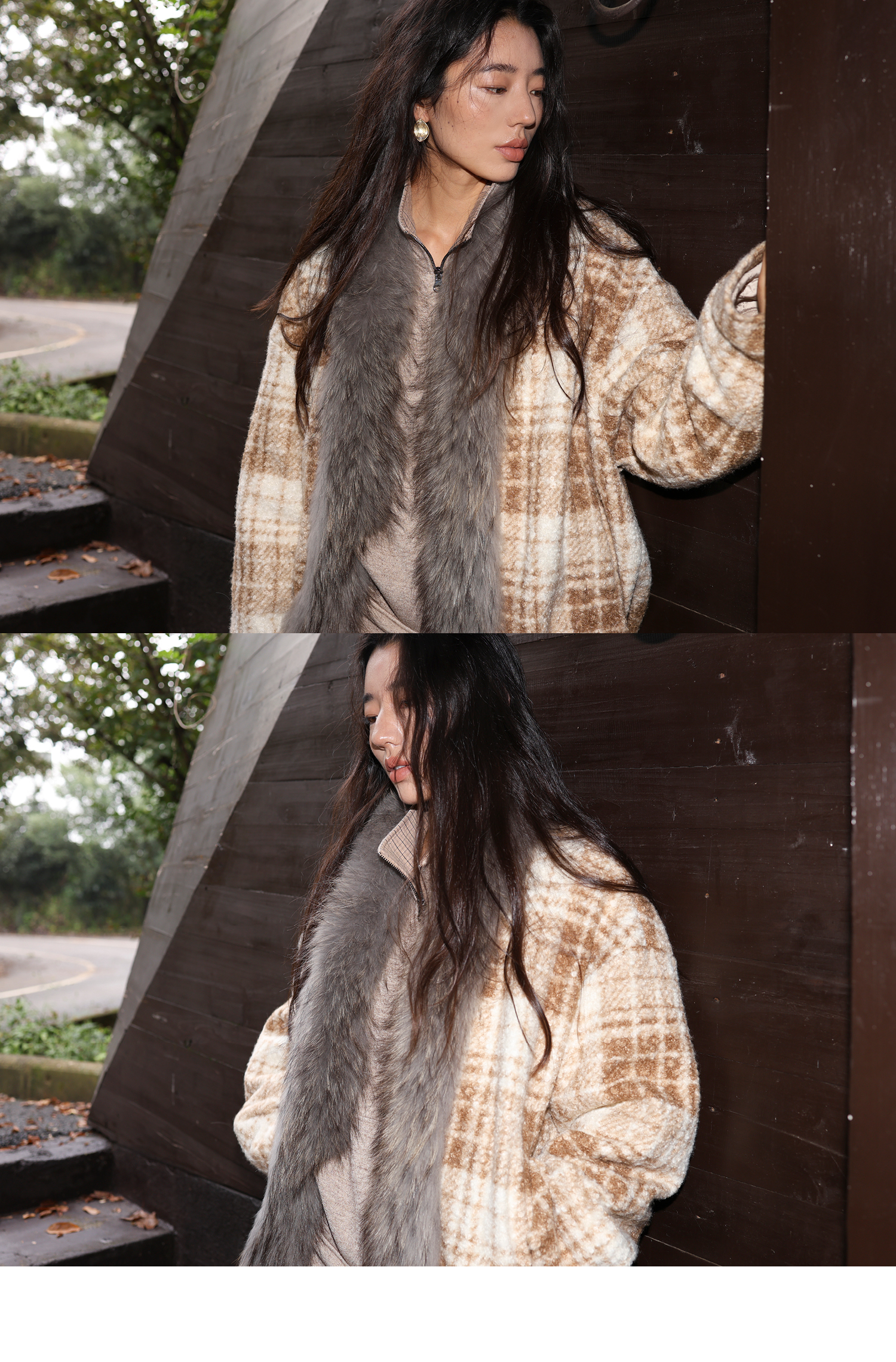 素舶 磨毛格纹拼接貉子毛皮草毛领内里绗棉摇粒绒双重保暖外套