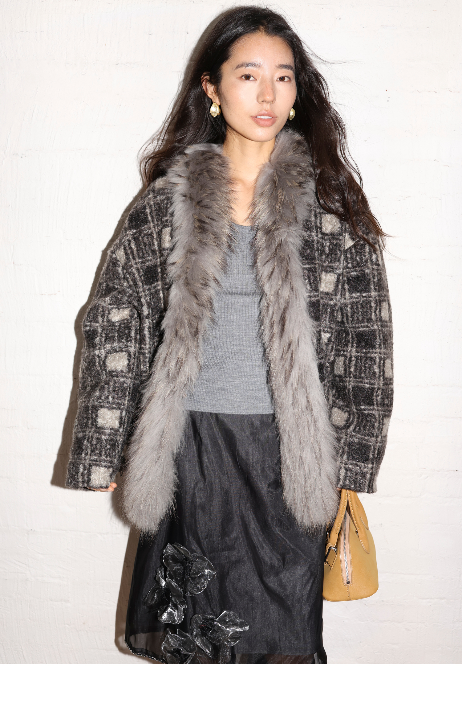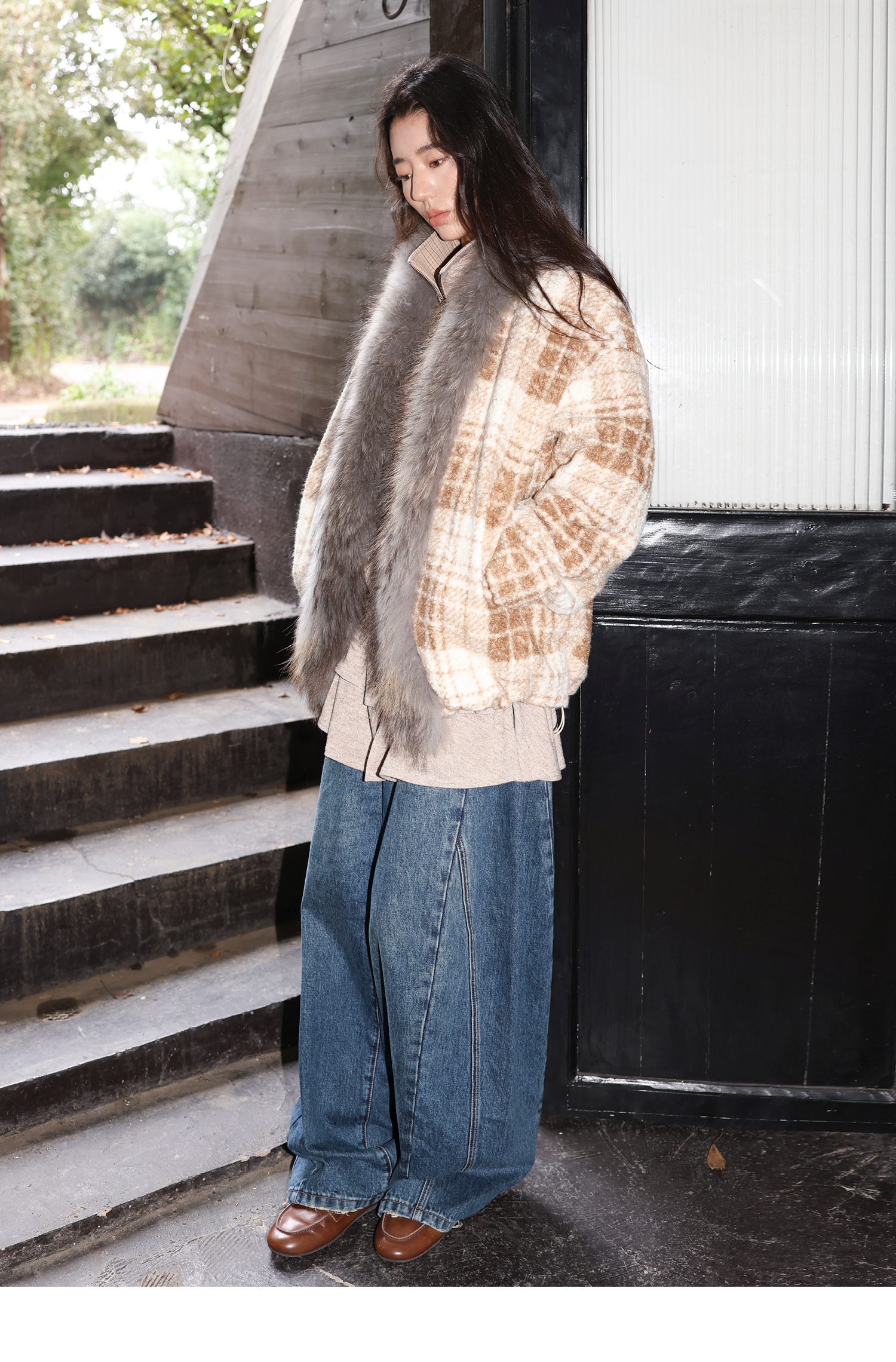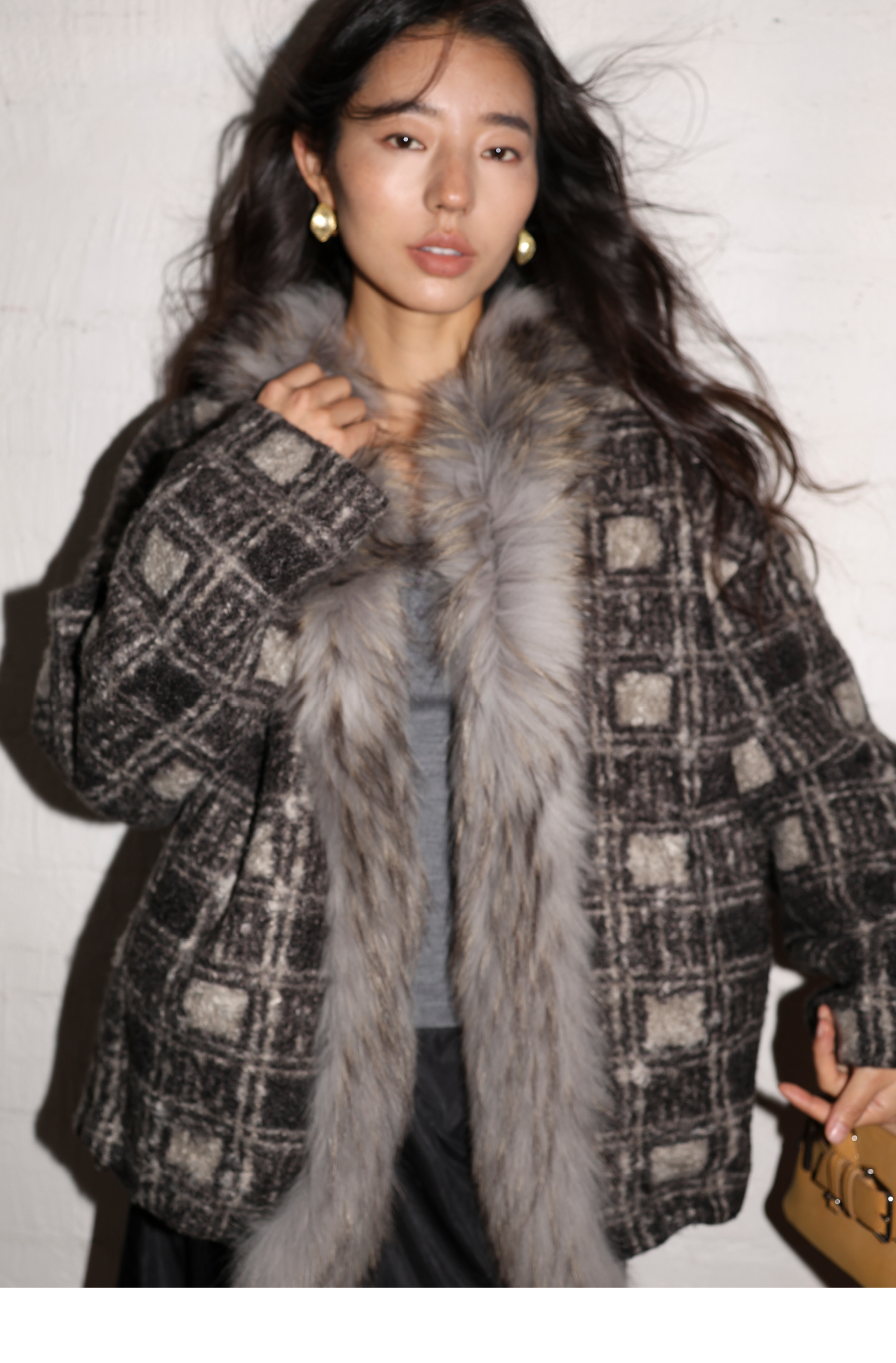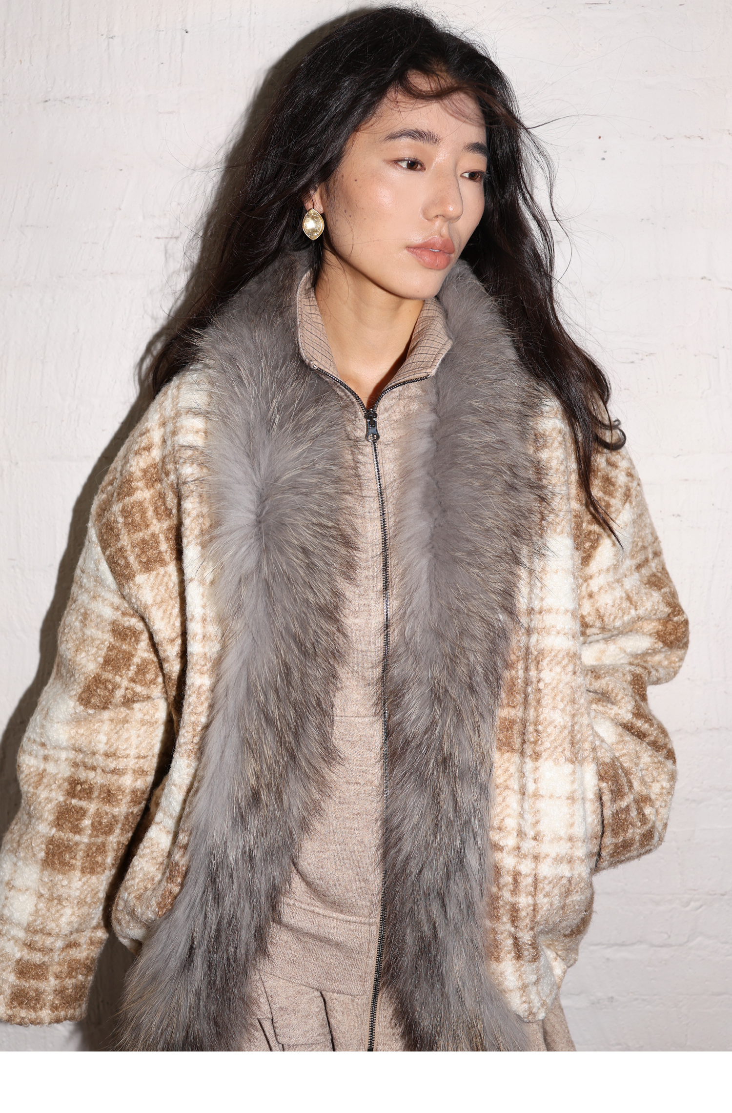 素舶 磨毛格纹拼接貉子毛皮草毛领内里绗棉摇粒绒双重保暖外套