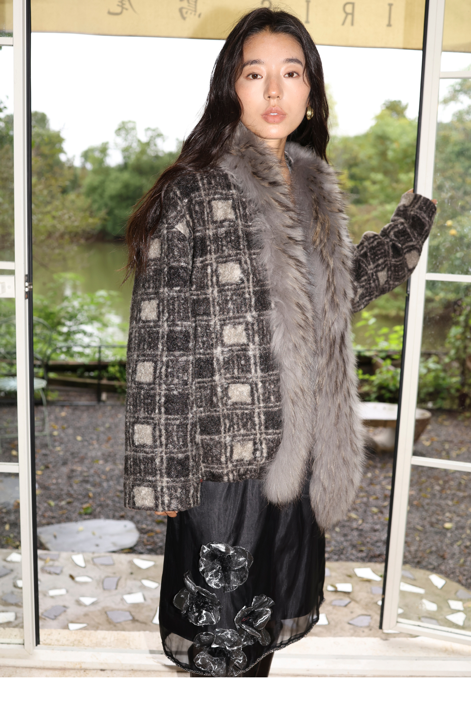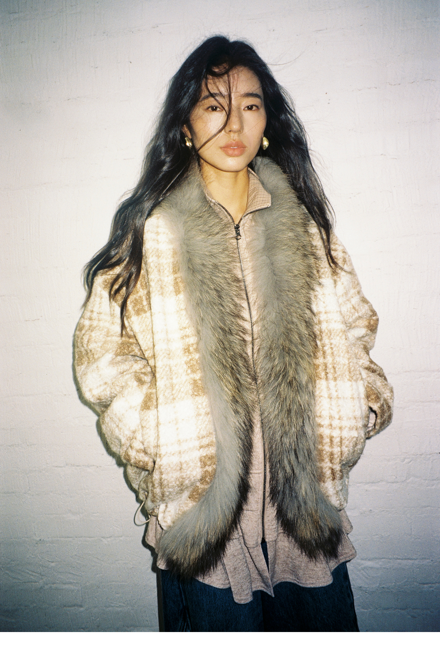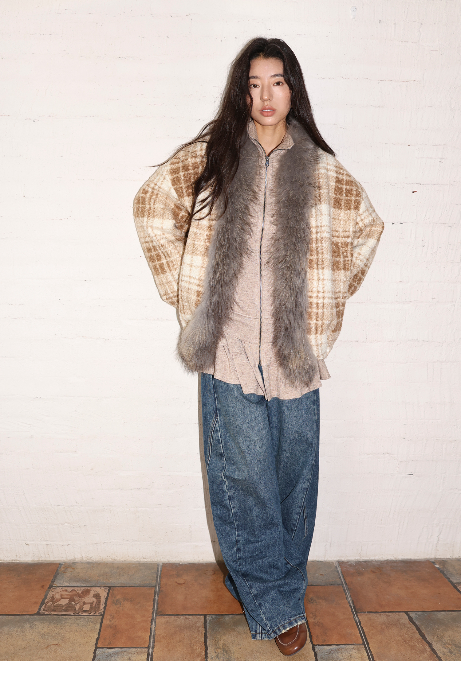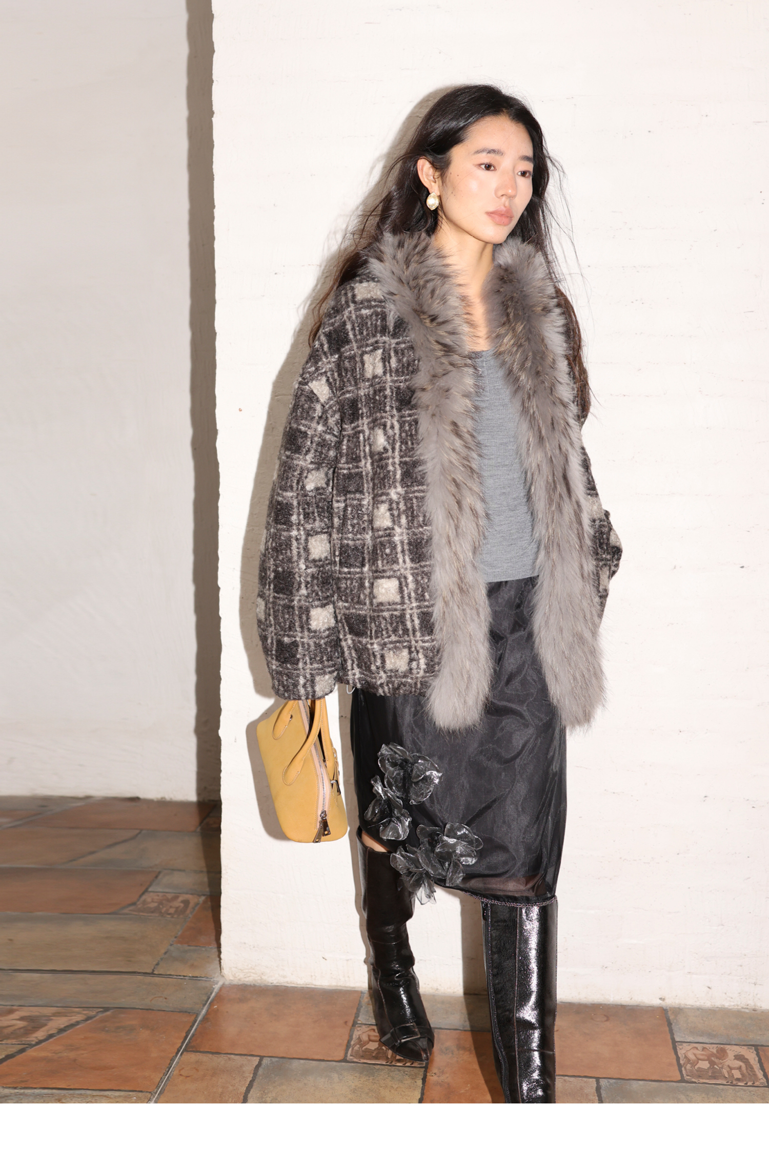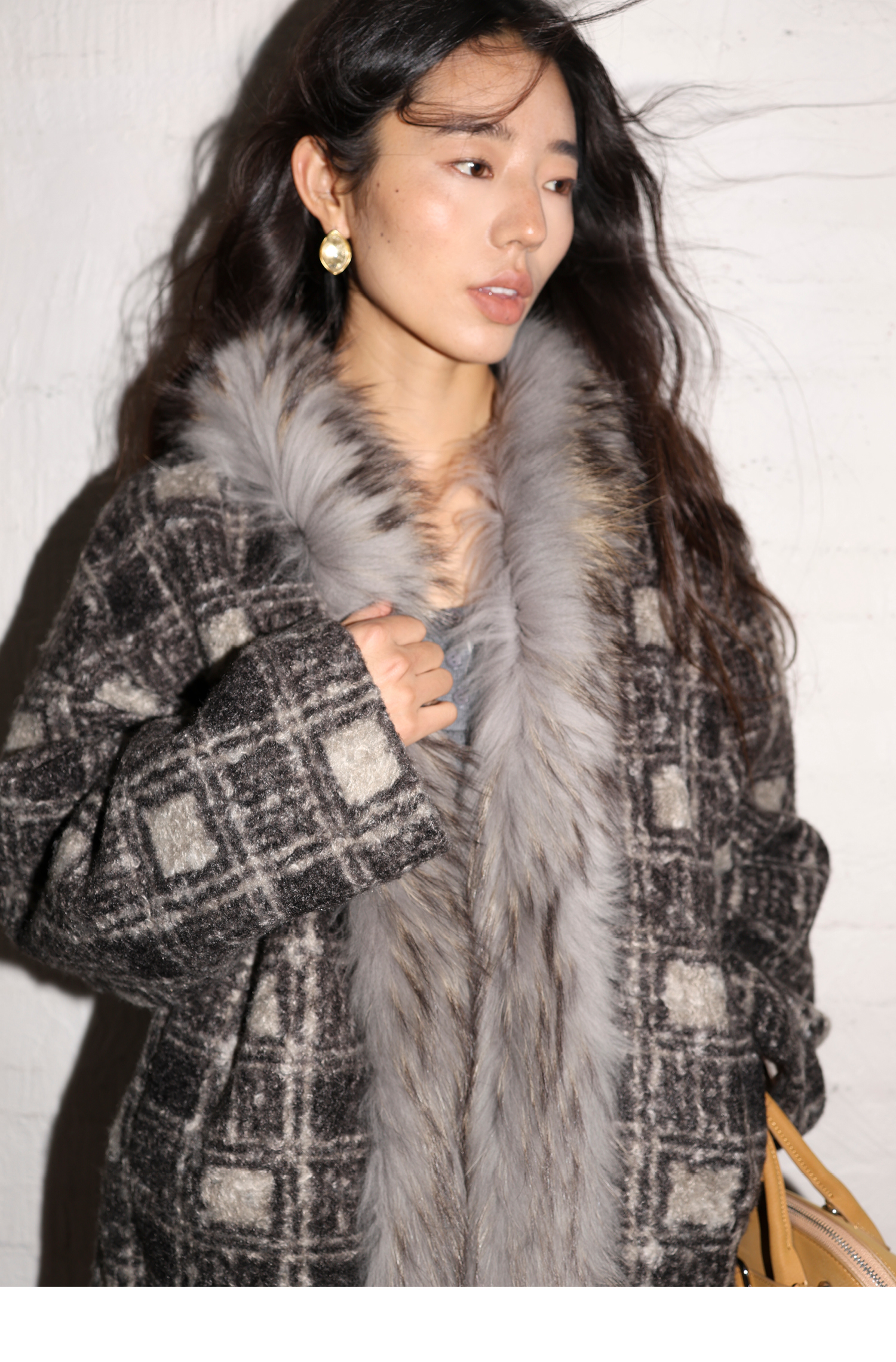素舶 磨毛格纹拼接貉子毛皮草毛领内里绗棉摇粒绒双重保暖外套