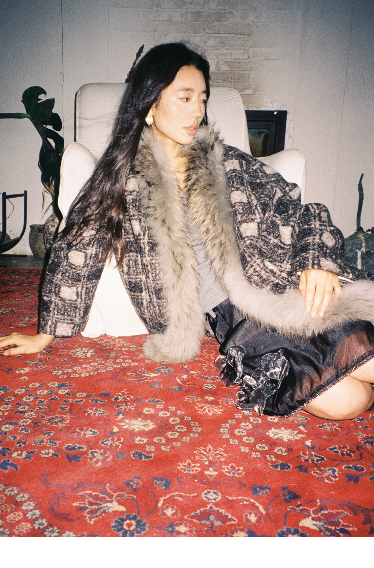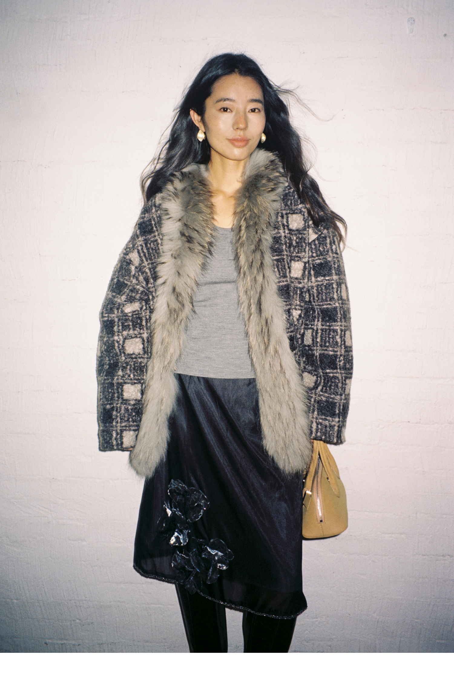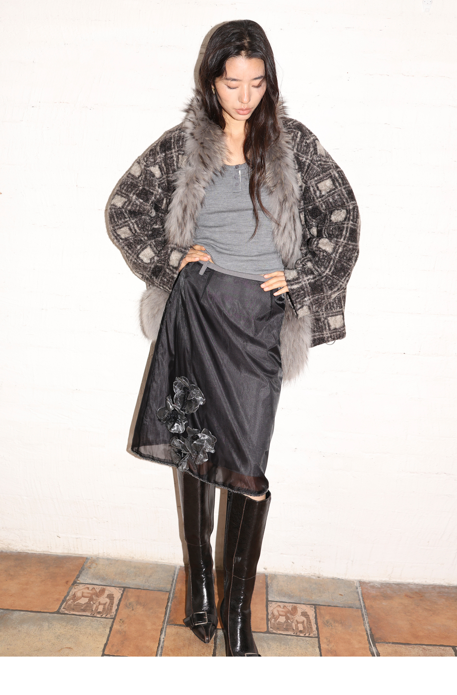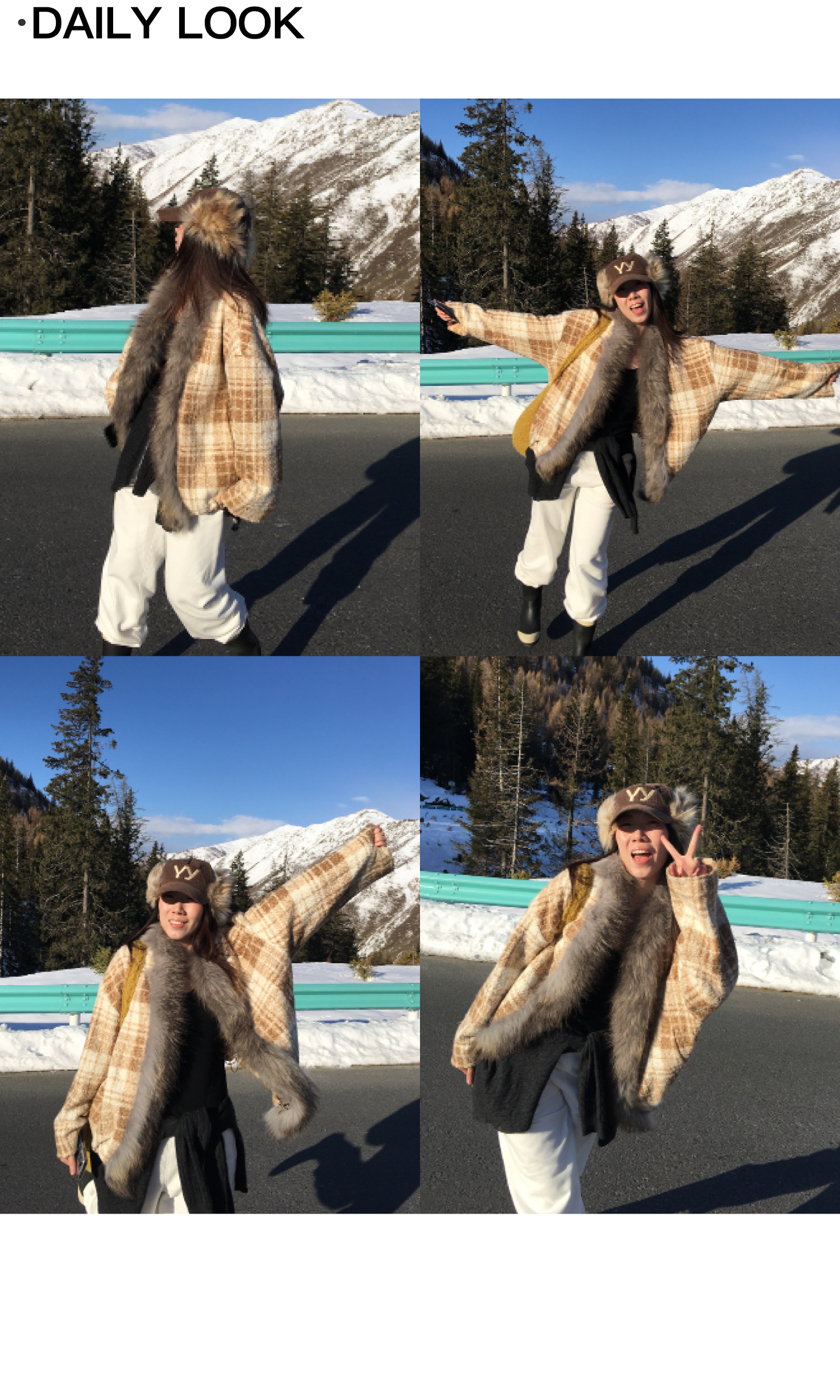 素舶 磨毛格纹拼接貉子毛皮草毛领内里绗棉摇粒绒双重保暖外套