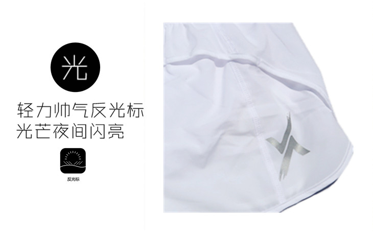 使用进口四面弹面料,轻量、速干、透气。采用冠军跑者多次修改版型,后片前出完美包裹身体,两侧小口袋、后反光标、纯白无瑕元素。里料使用牛奶丝透气网眼弹力布。