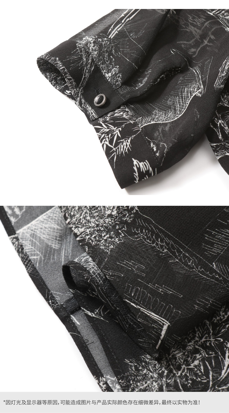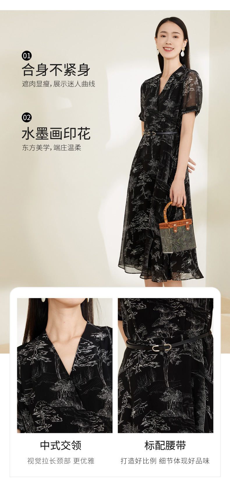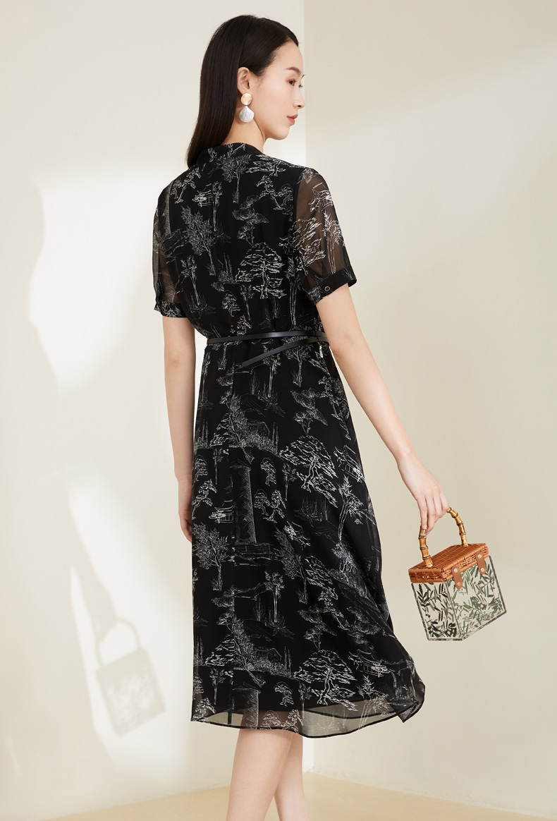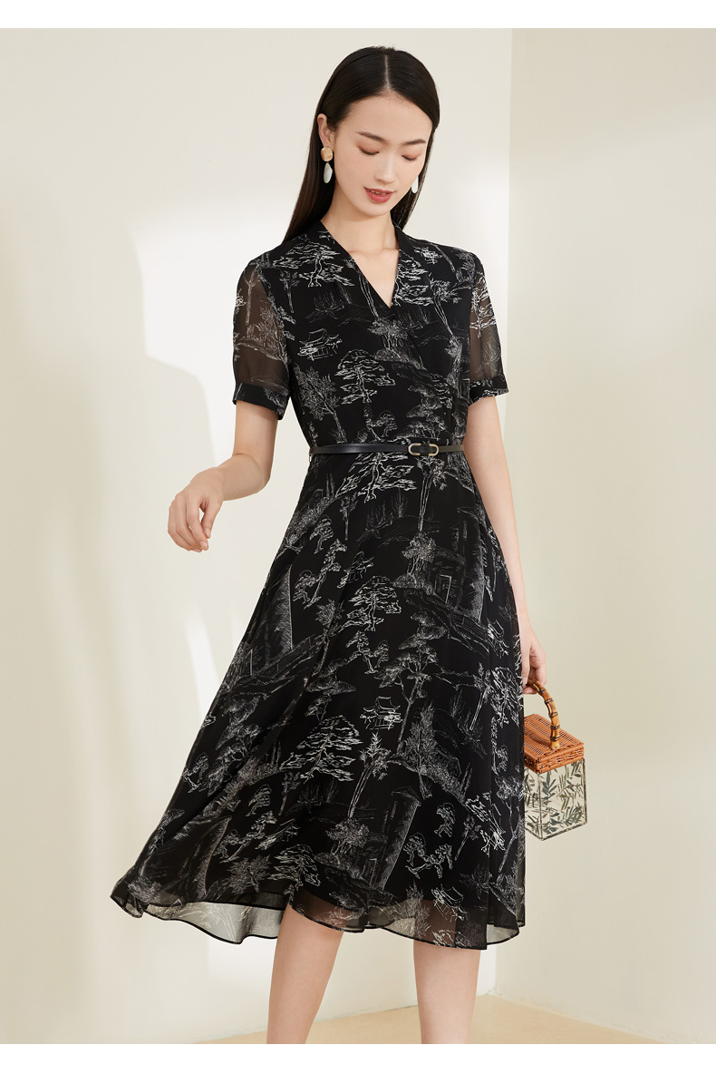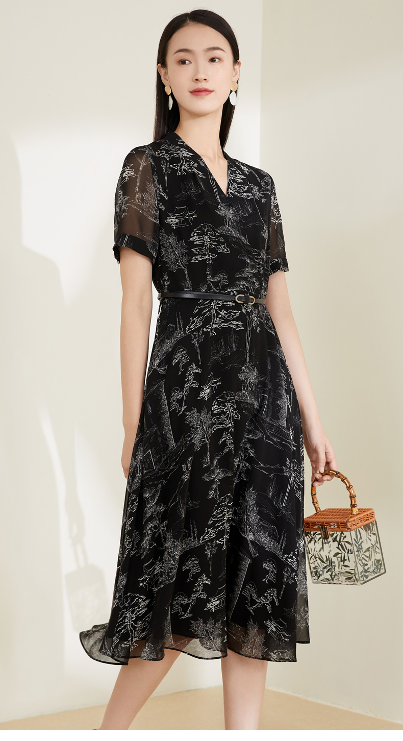 玳莎印花真丝中长款连衣裙2022春夏新款腰带修身复古桑蚕丝茶歇裙 CB35101