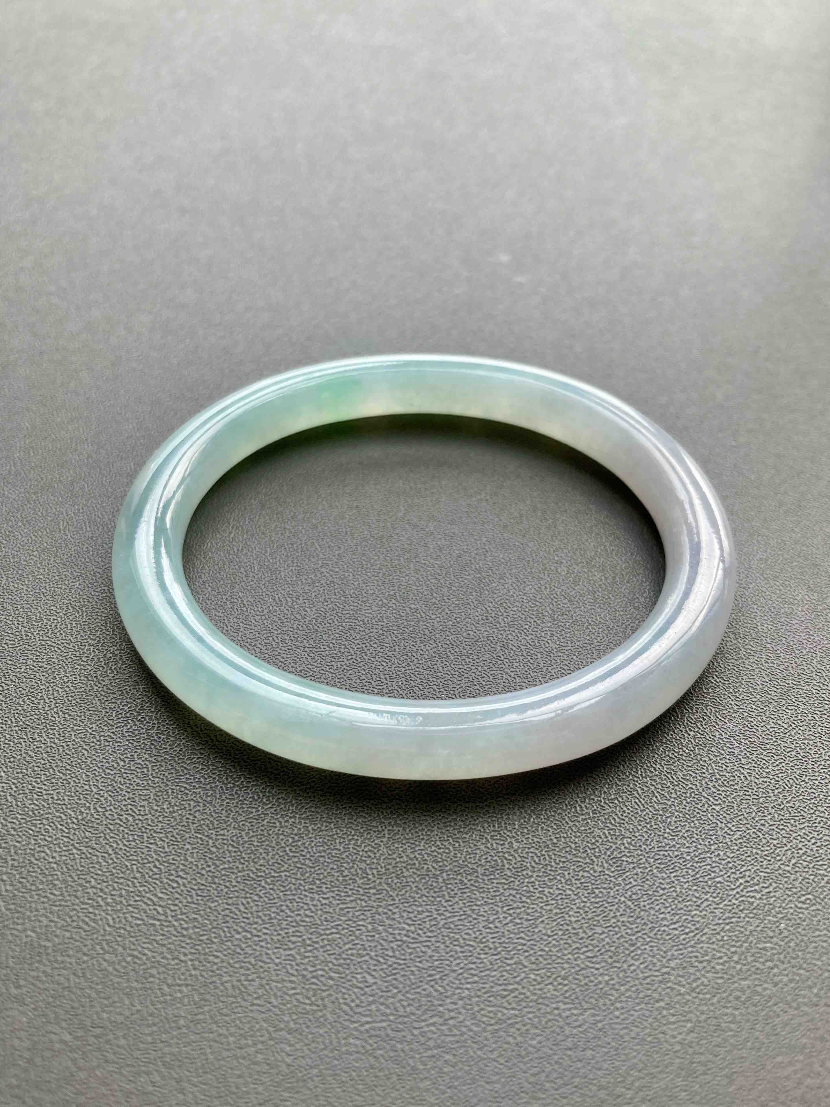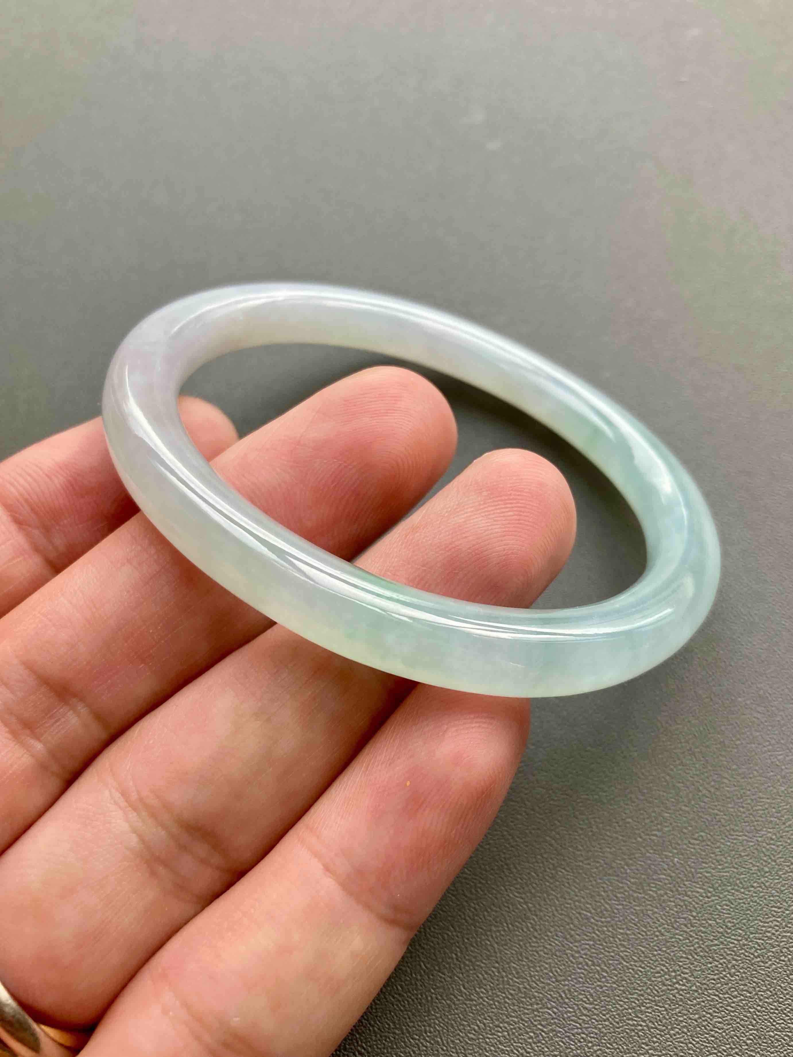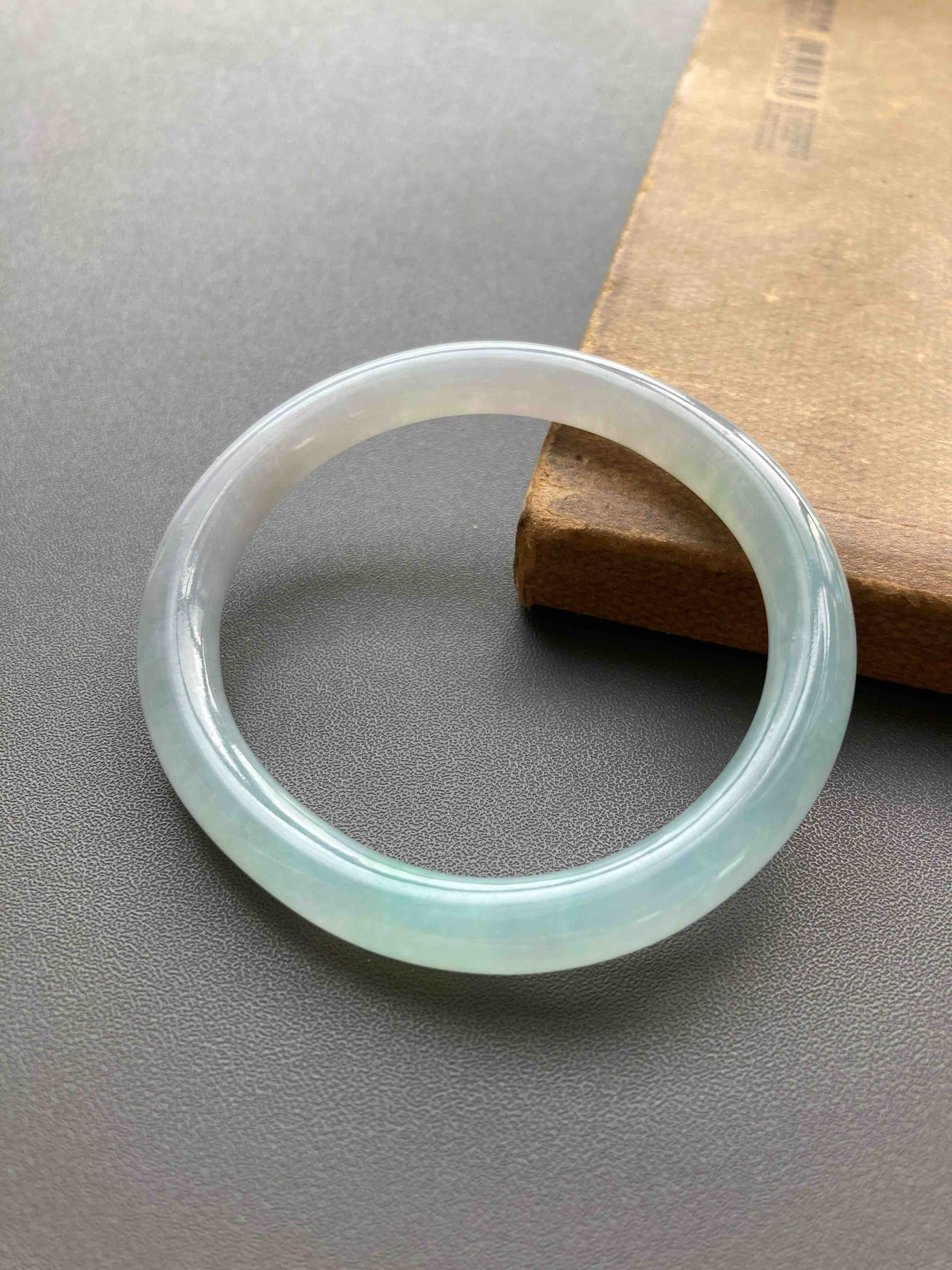 仙物,太美了,冰种飘阳绿翡翠细圆条贵妃镯,除了一小段有点糯,大部分都非常冰啊,晶莹剔透起荧光,飘阳绿,像精灵一样仙气十足,椭圆的细圆条,条宽7.2mm,内径53,适合手寸50-51的小手佩戴,能戴进可太划算了,无纹无裂这么便宜的冰镯