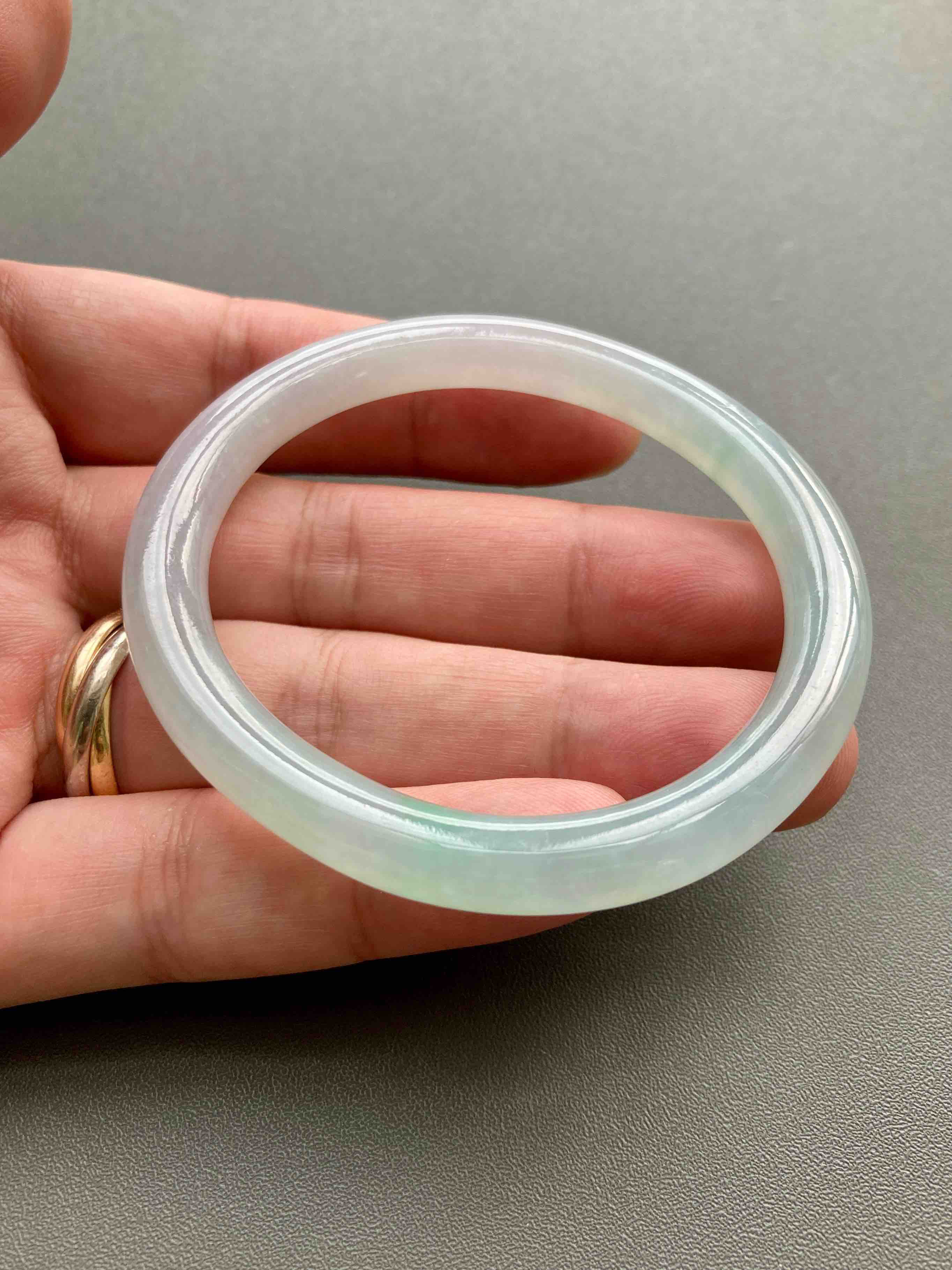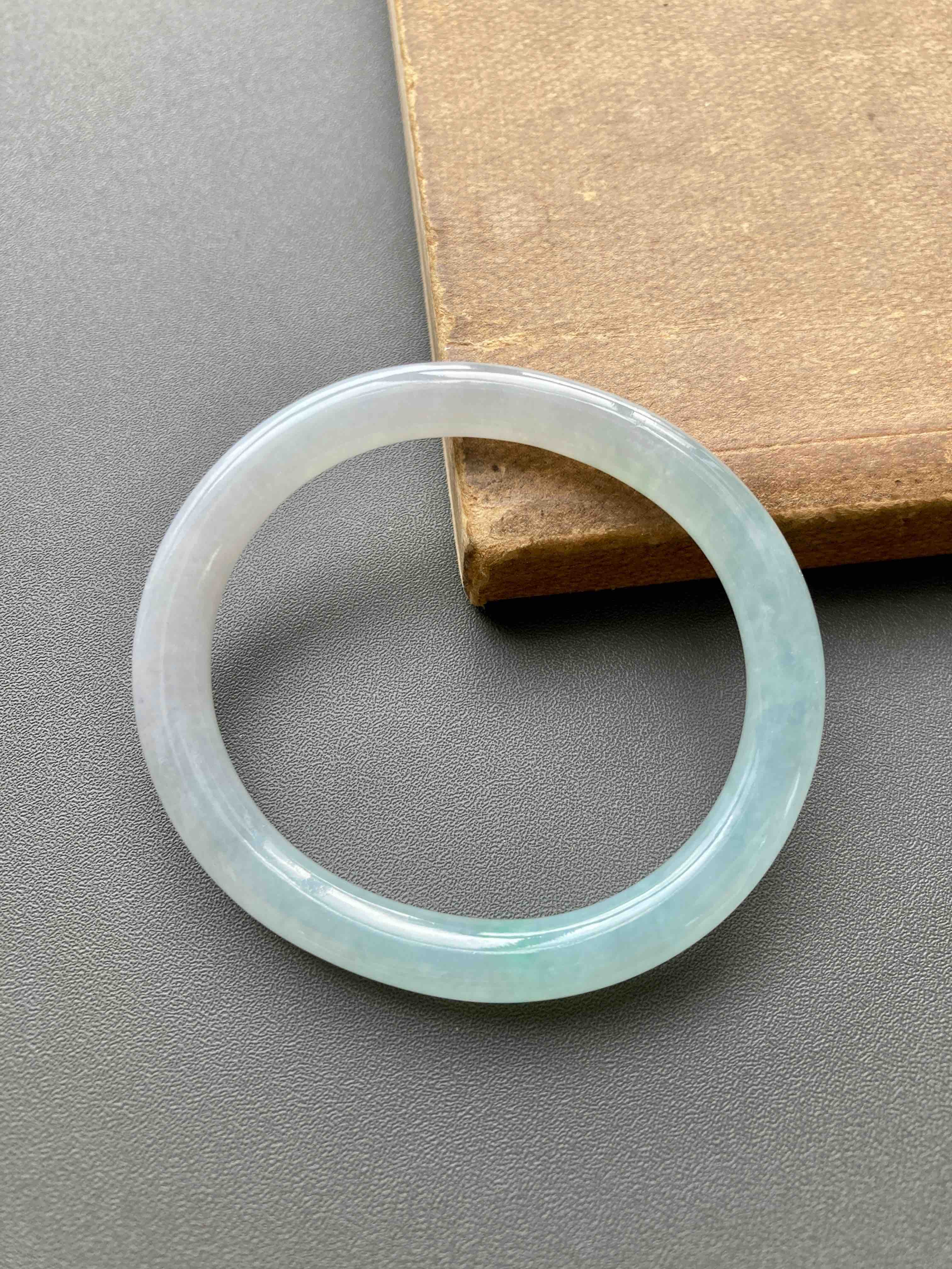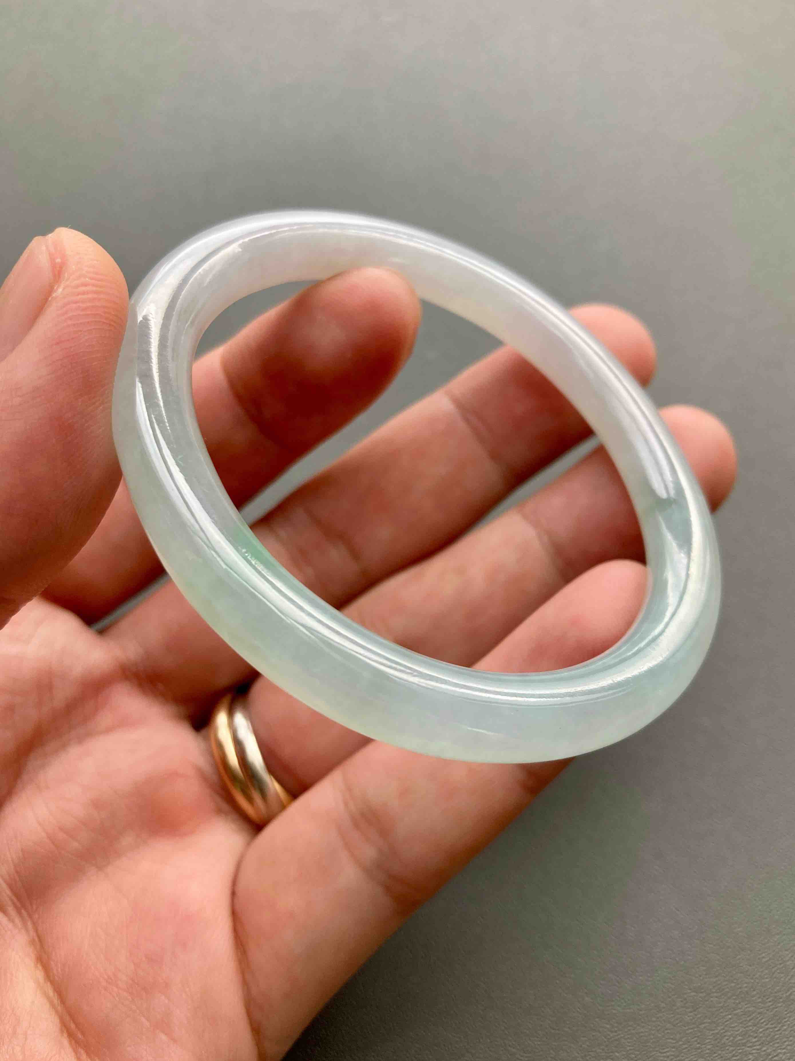 仙物,太美了,冰种飘阳绿翡翠细圆条贵妃镯,除了一小段有点糯,大部分都非常冰啊,晶莹剔透起荧光,飘阳绿,像精灵一样仙气十足,椭圆的细圆条,条宽7.2mm,内径53,适合手寸50-51的小手佩戴,能戴进可太划算了,无纹无裂这么便宜的冰镯