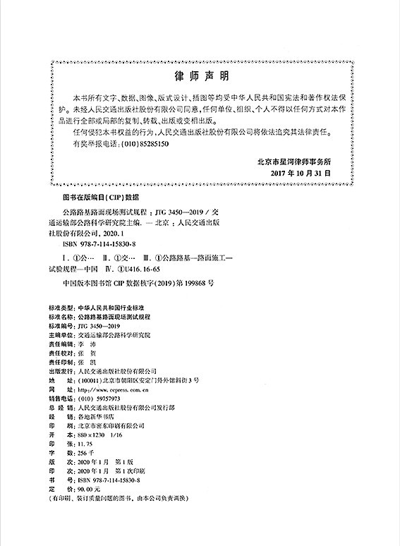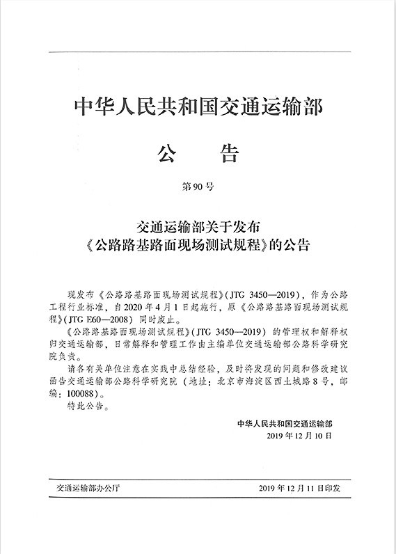 JTG 3450-2019 公路路基路面现场测试规程(代替JTG E60-2008)