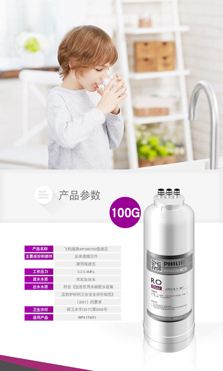 飞利浦(PHILIPS)Aswan系列厨下净水器滤芯WP3987/00(RO)100G 适用:WP4174/01