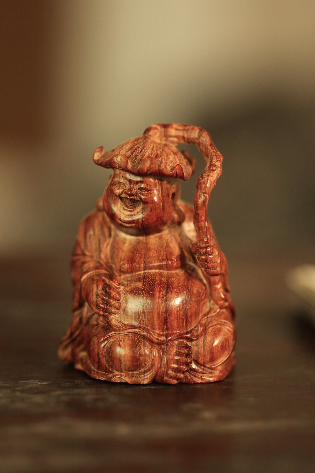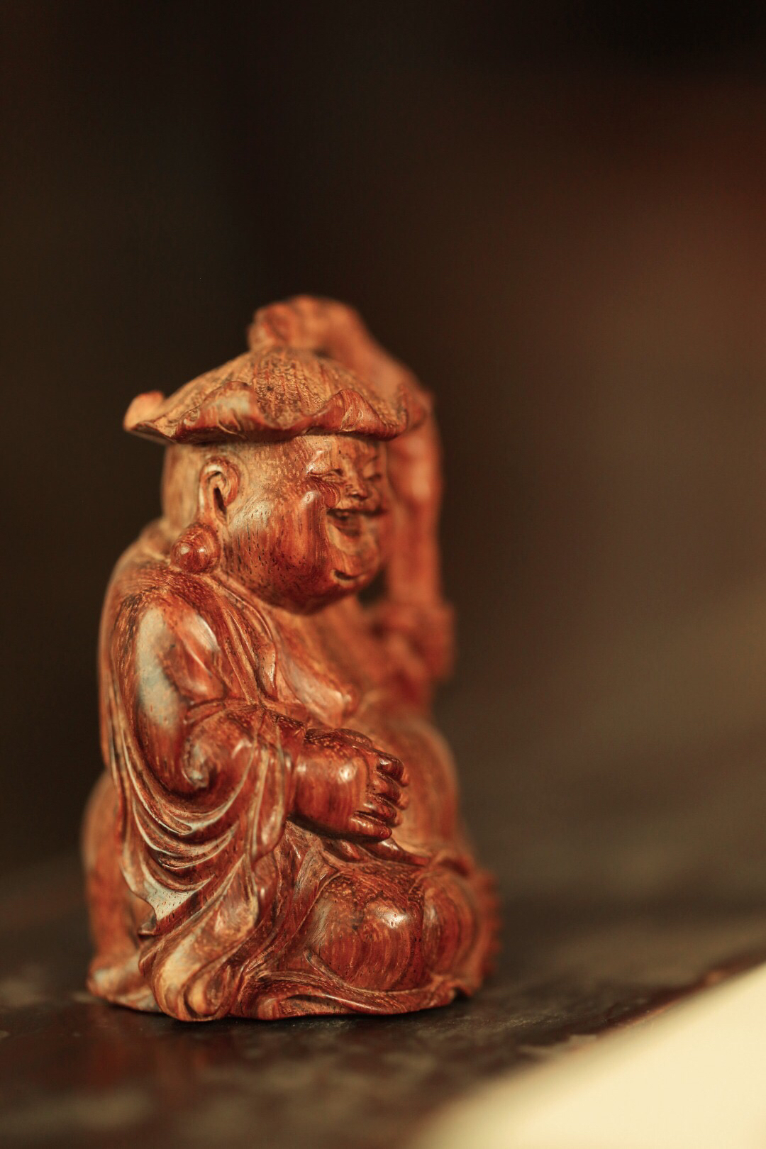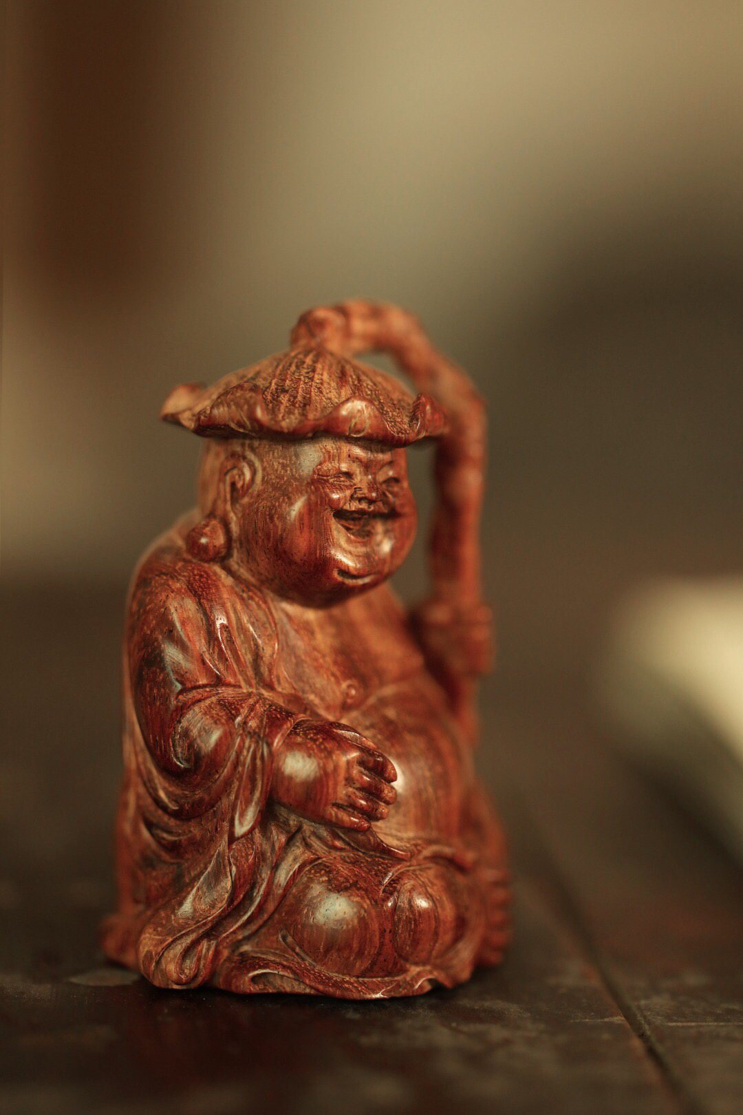 海黄一木雕成,情态生动传神,弥勒禅坐头戴荷叶,喜笑颜开,置案摆放,和气生财,颇增趣味。