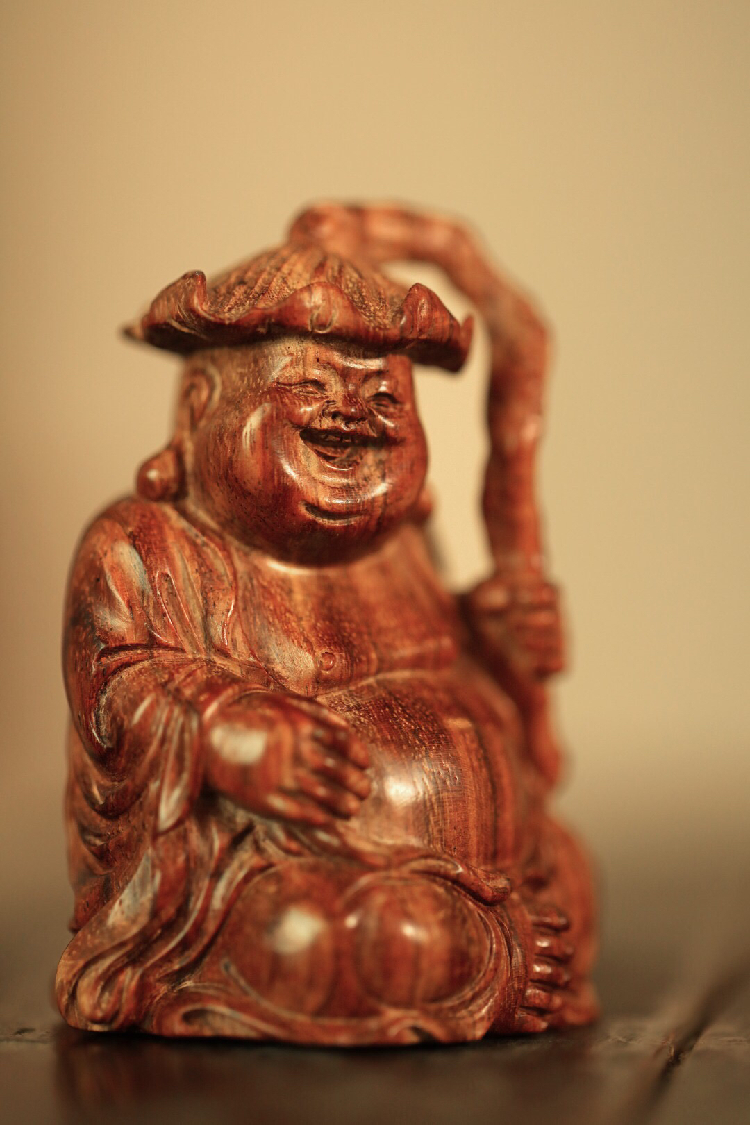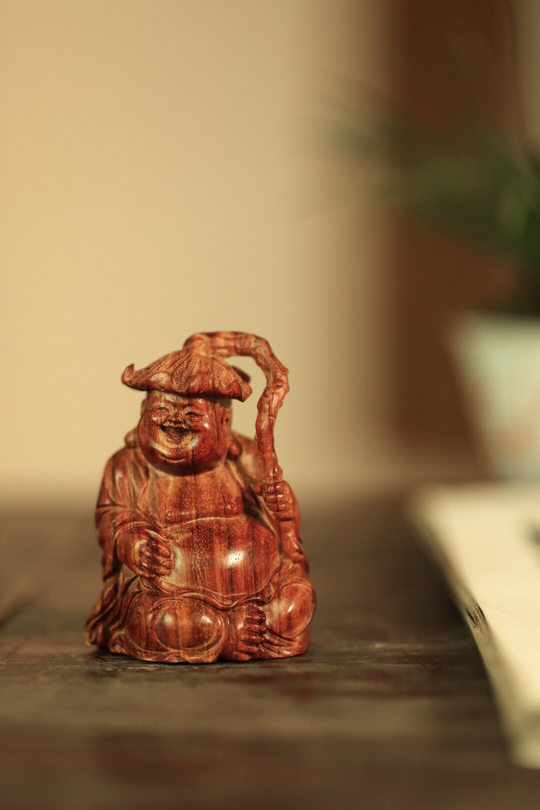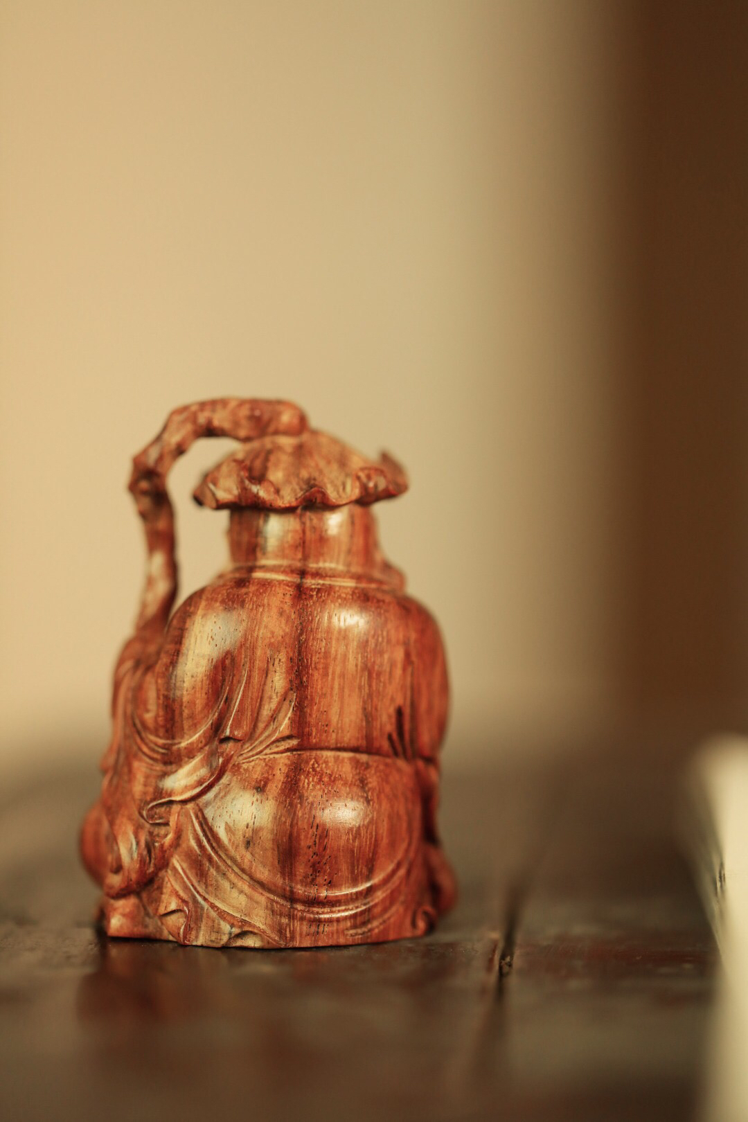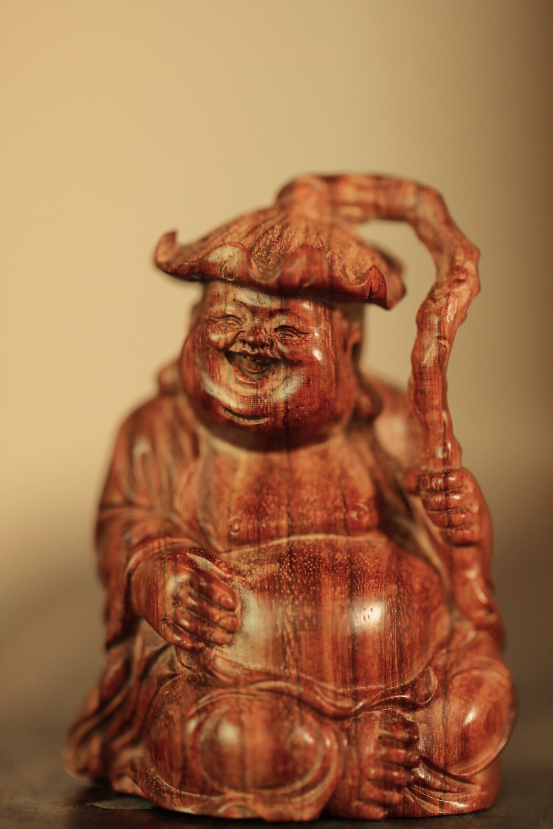 海黄一木雕成,情态生动传神,弥勒禅坐头戴荷叶,喜笑颜开,置案摆放,和气生财,颇增趣味。