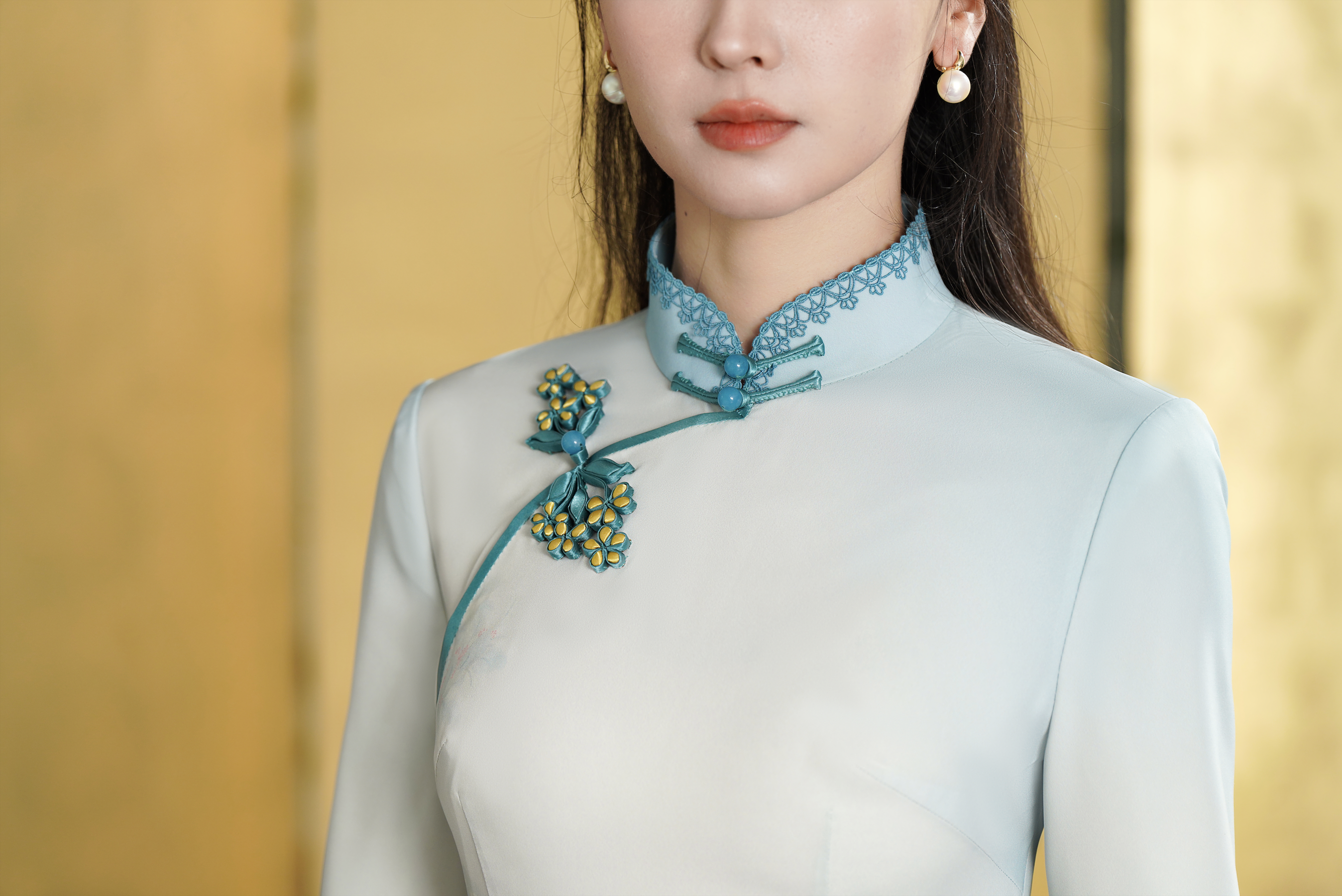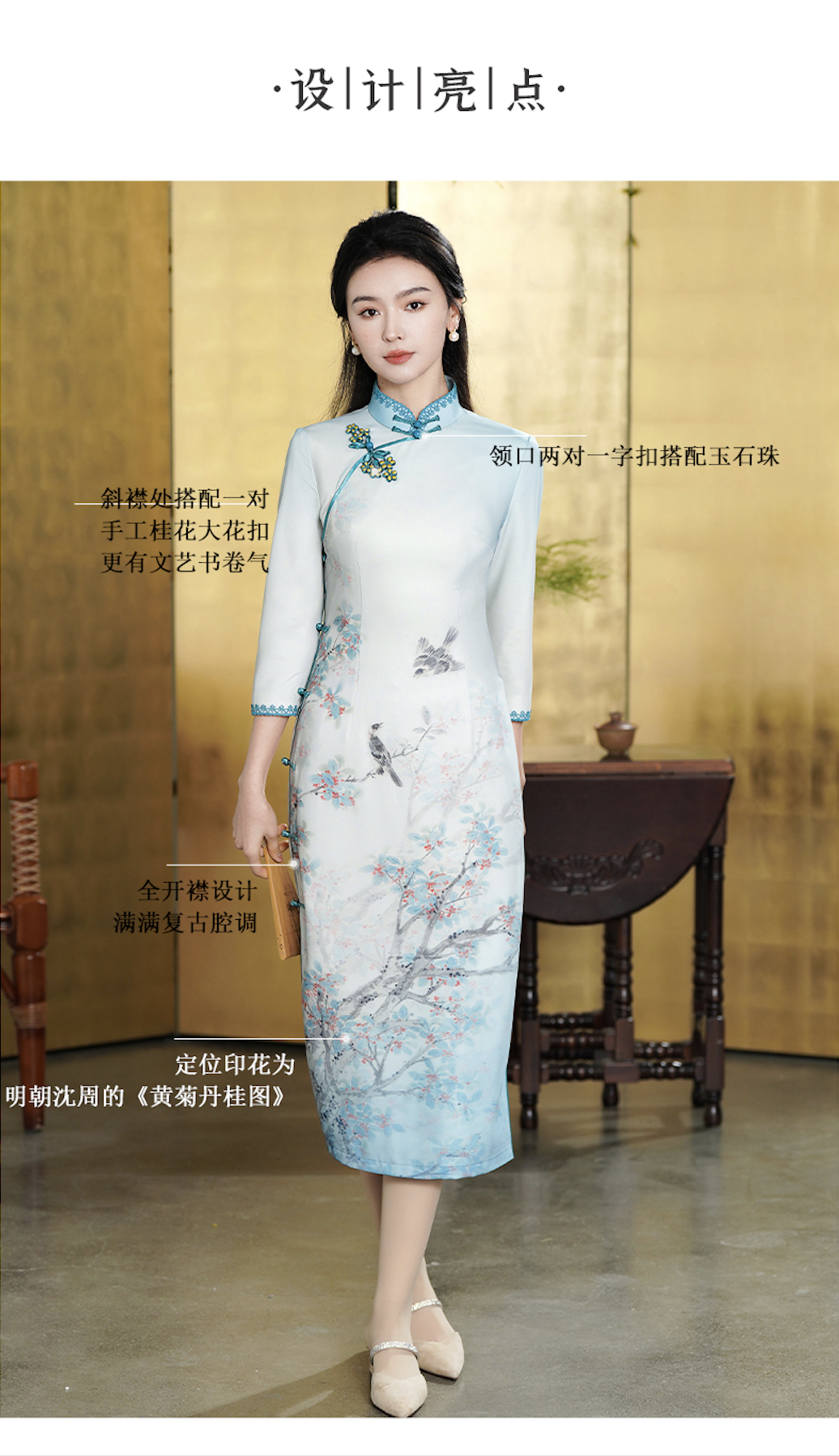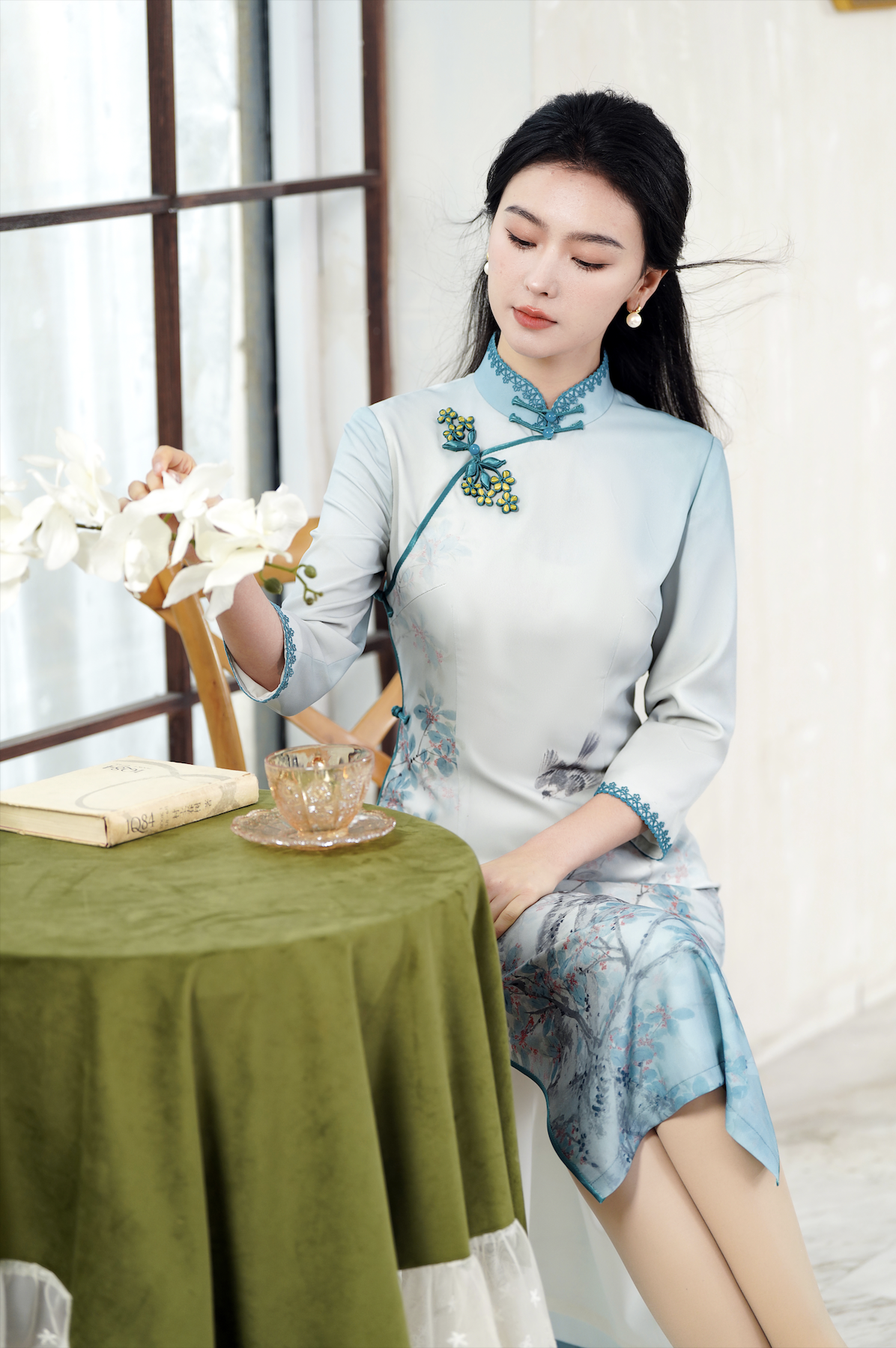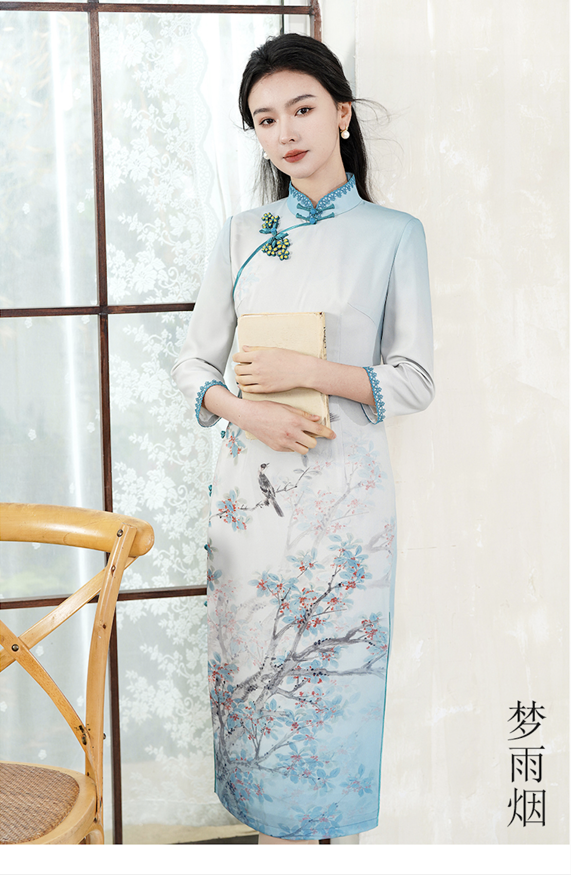 🐟「梦烟雨」适合春秋和初夏,这是一件文艺感十足的传统旗袍,比较适于一些书卷气的场合。读书会、座谈会或是参加旗袍派对等都是很好的选择,独特、不易撞款。
