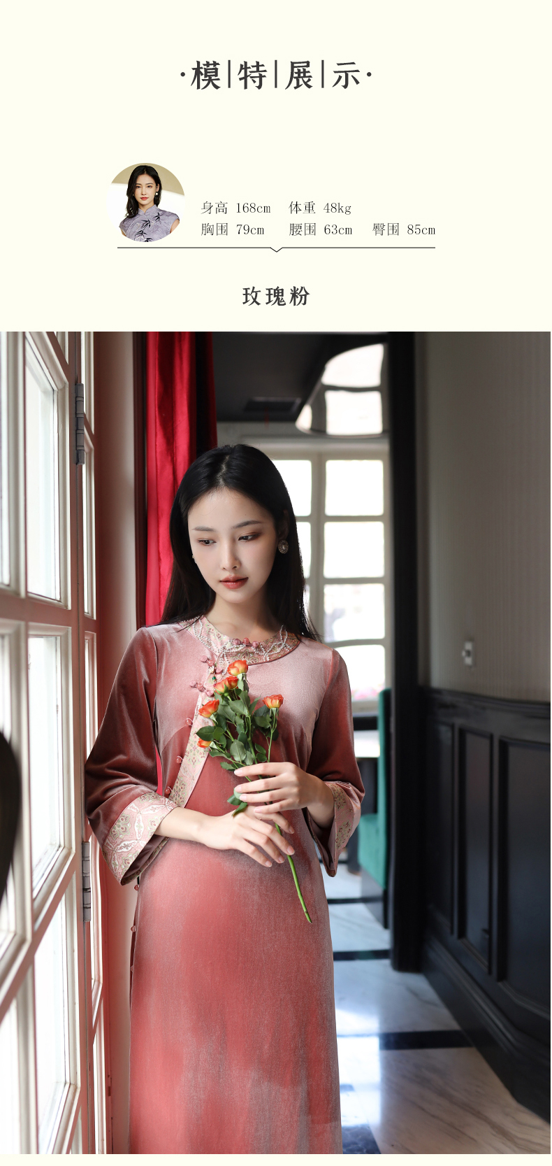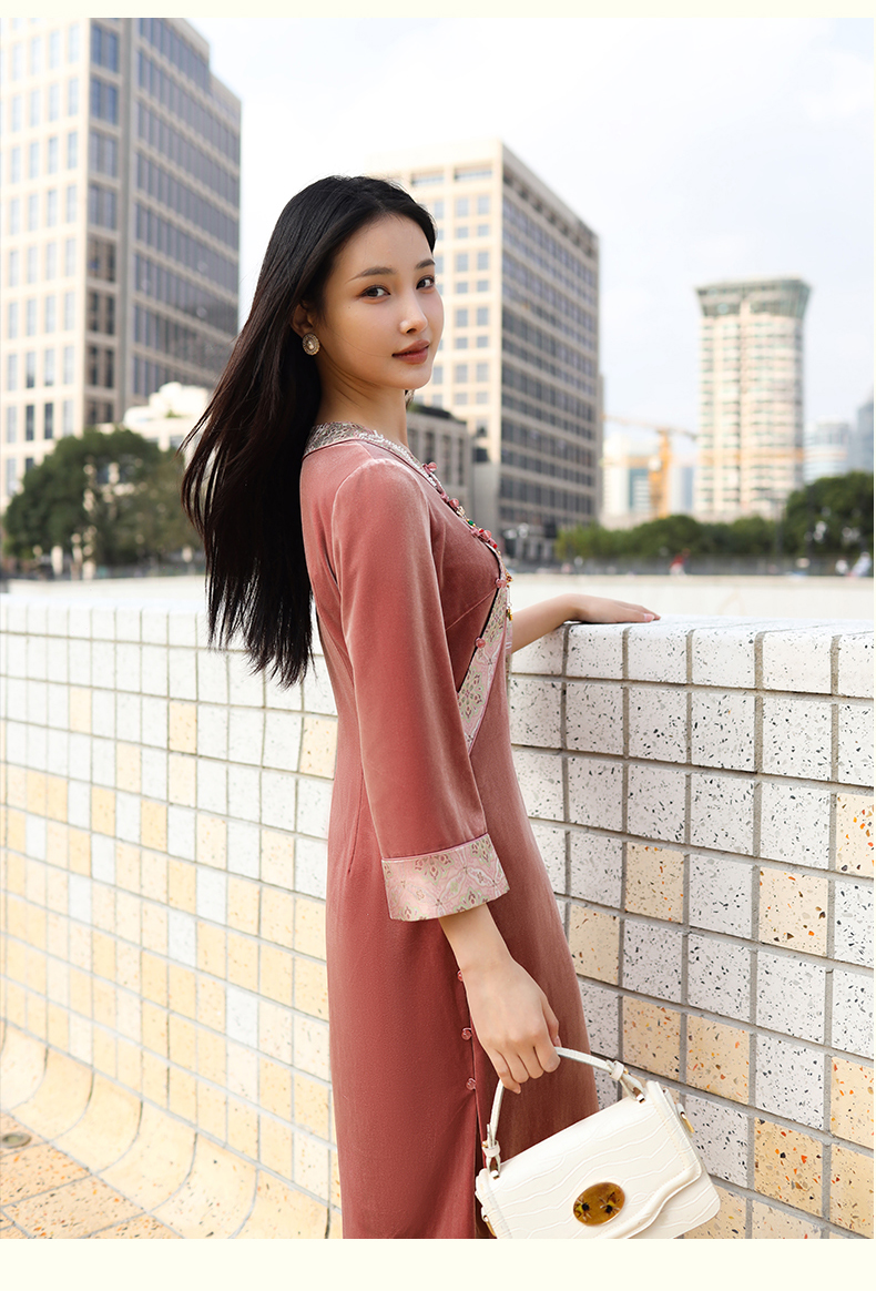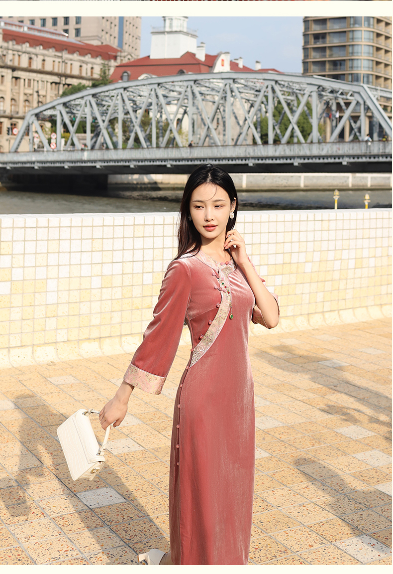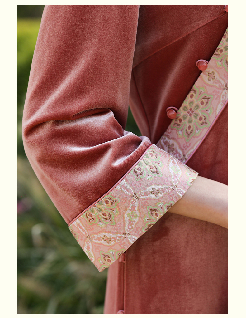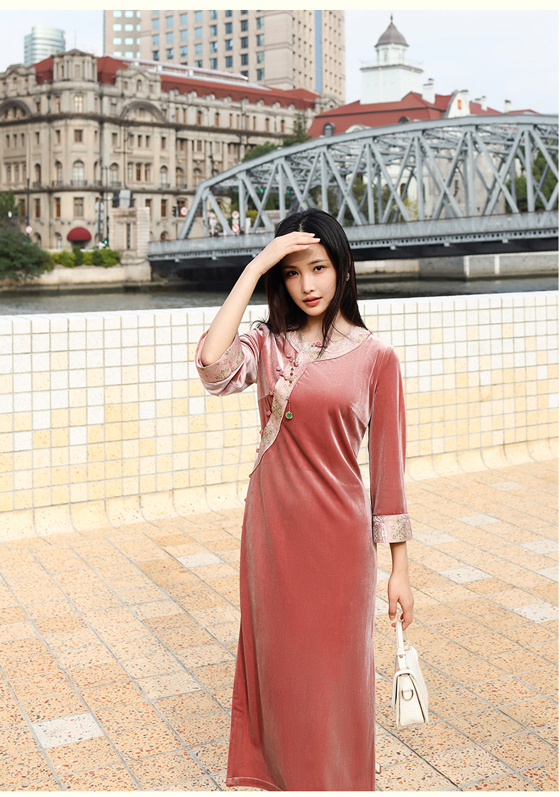 典雅秀丽又带一点小俏皮的丝绒旗袍穿在身上,就像被春天的暖阳温柔地包裹着,每一寸肌肤都被这柔软宠溺着。而且在春日的阳光下,丝绒特有的光泽若隐若现,低调又奢华,和春天的氛围绝配。