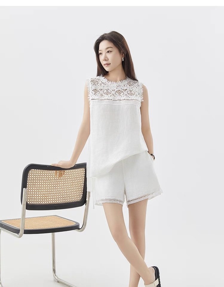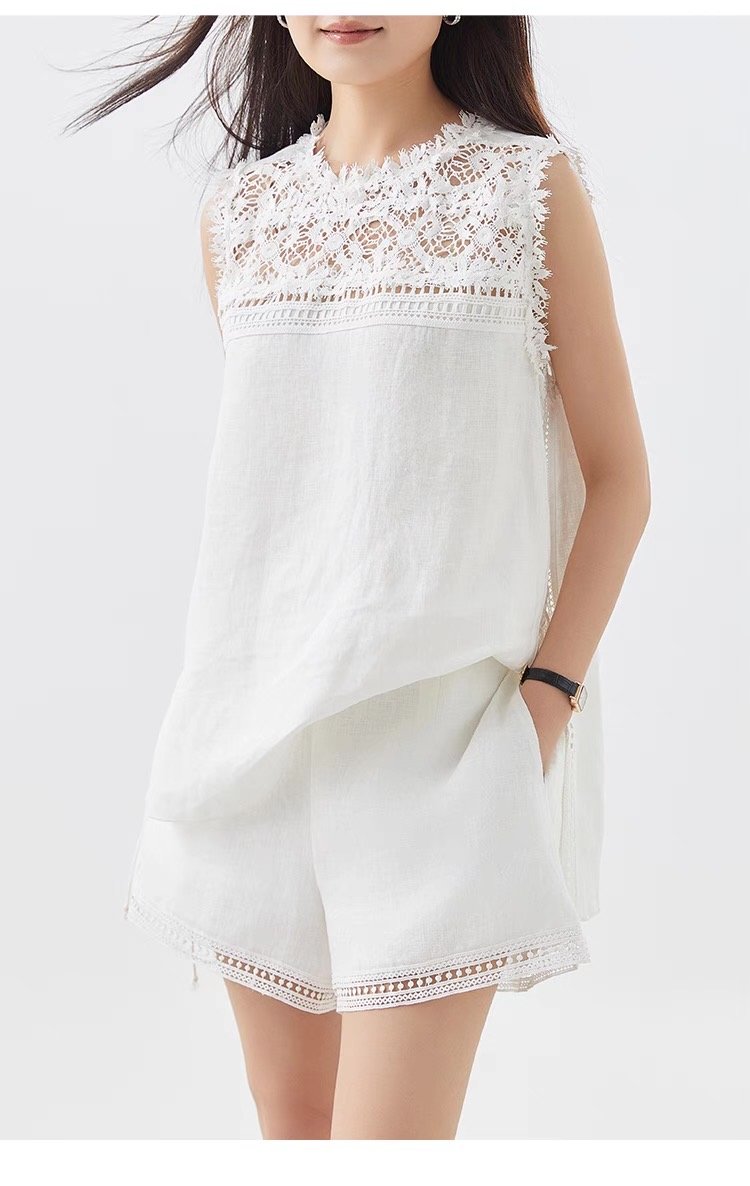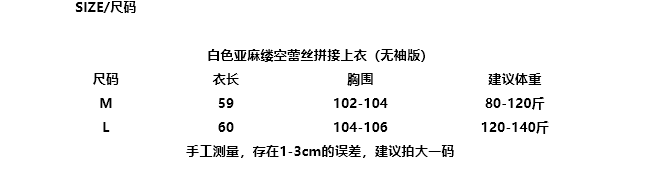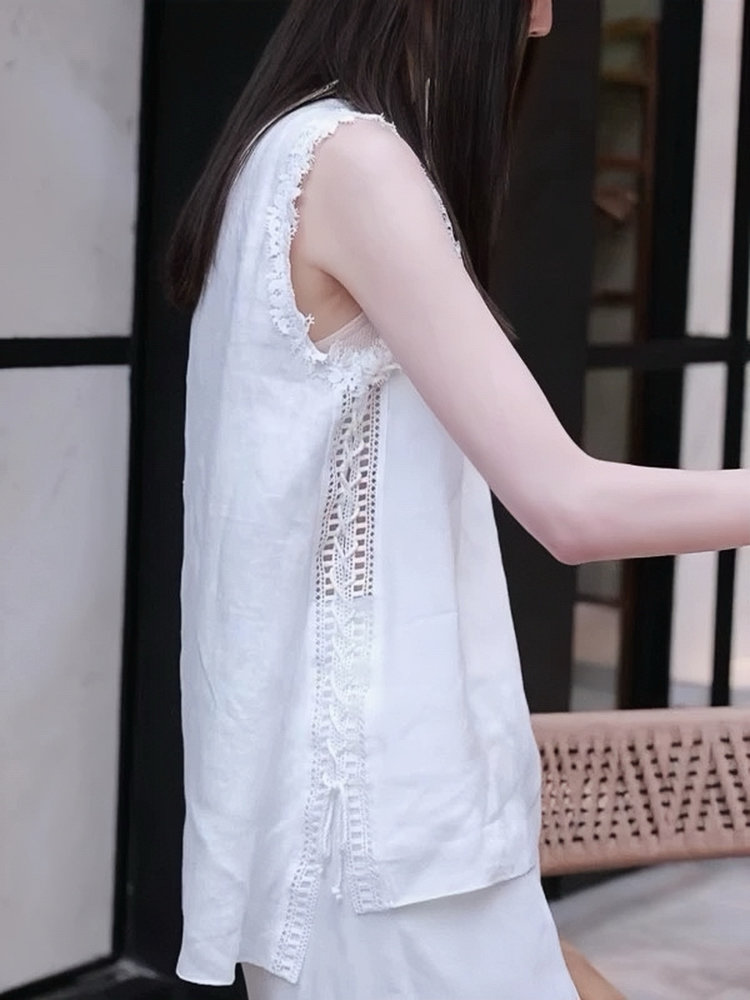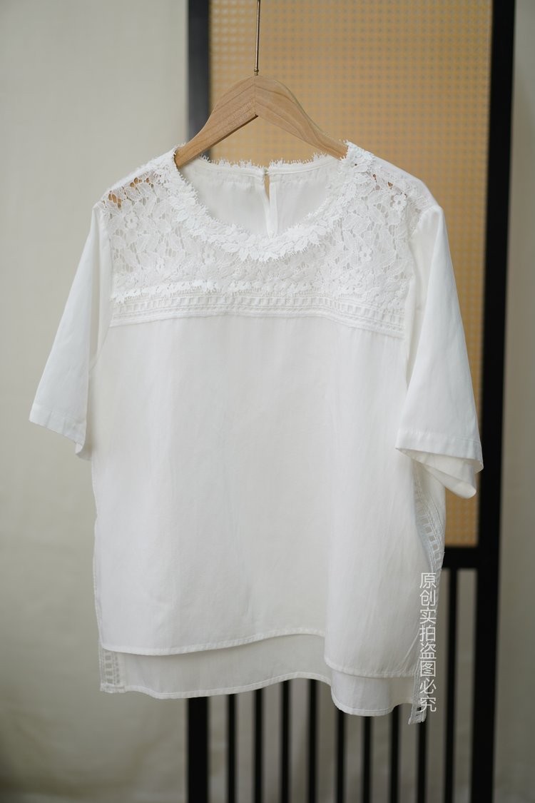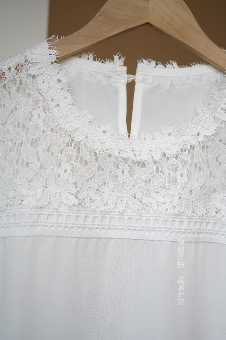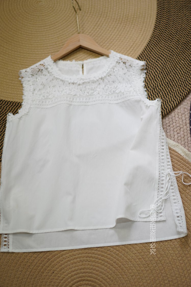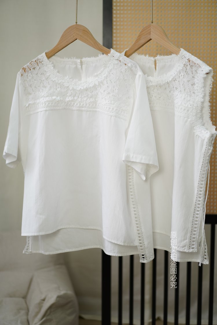 品名:白色亚麻蕾丝拼接上衣【半袖/无袖】