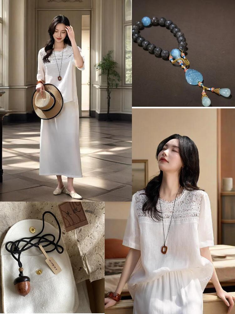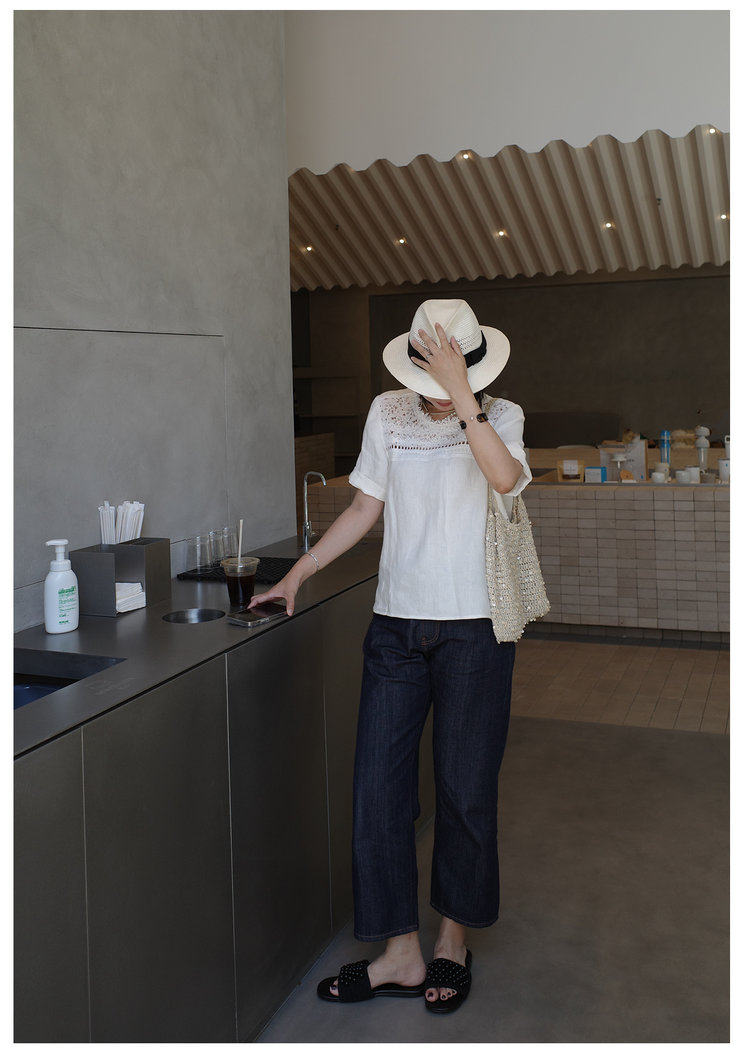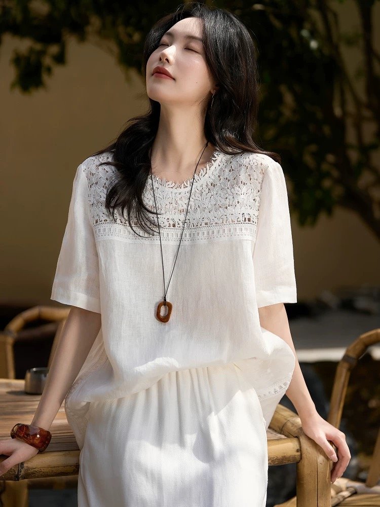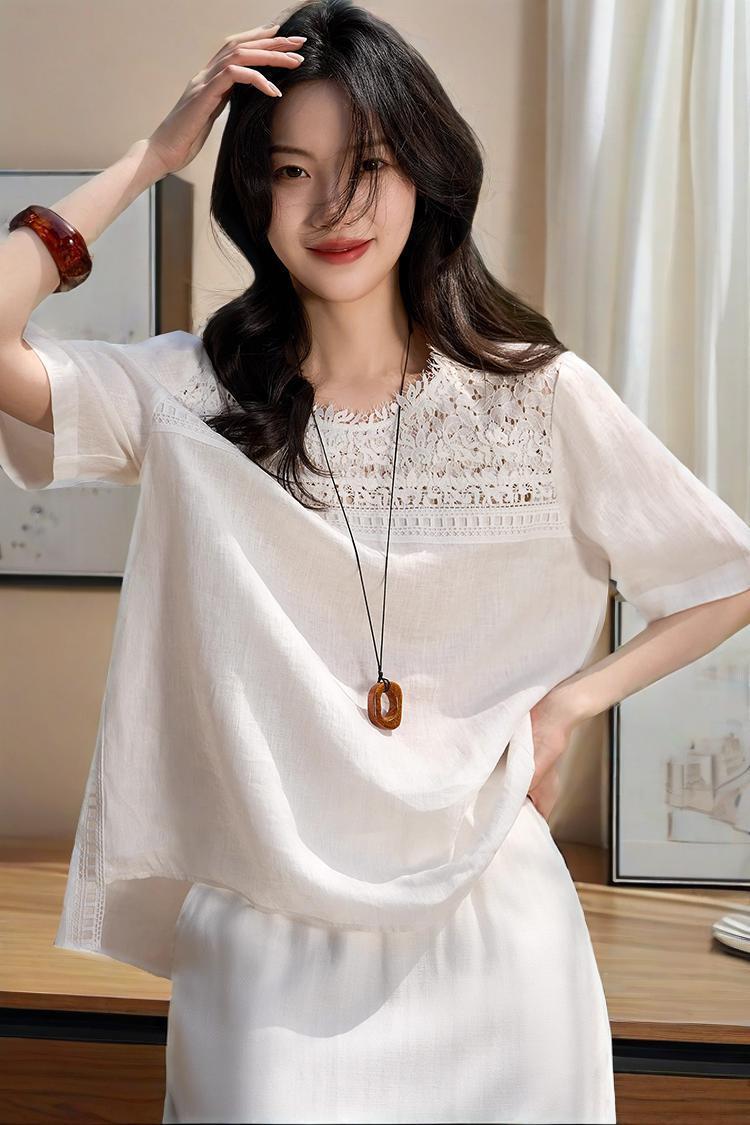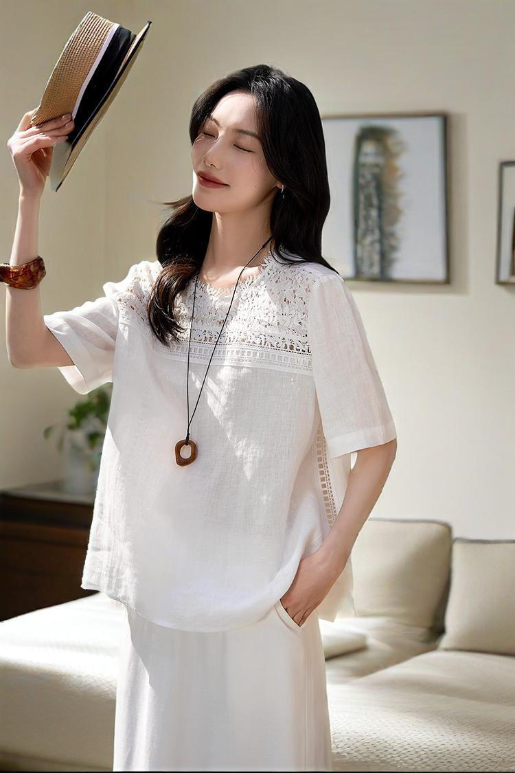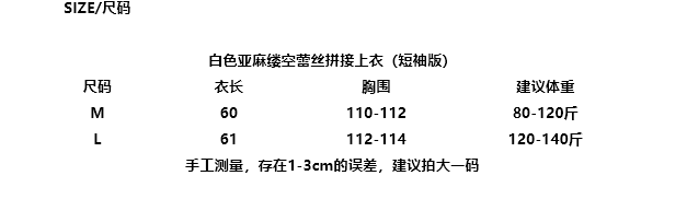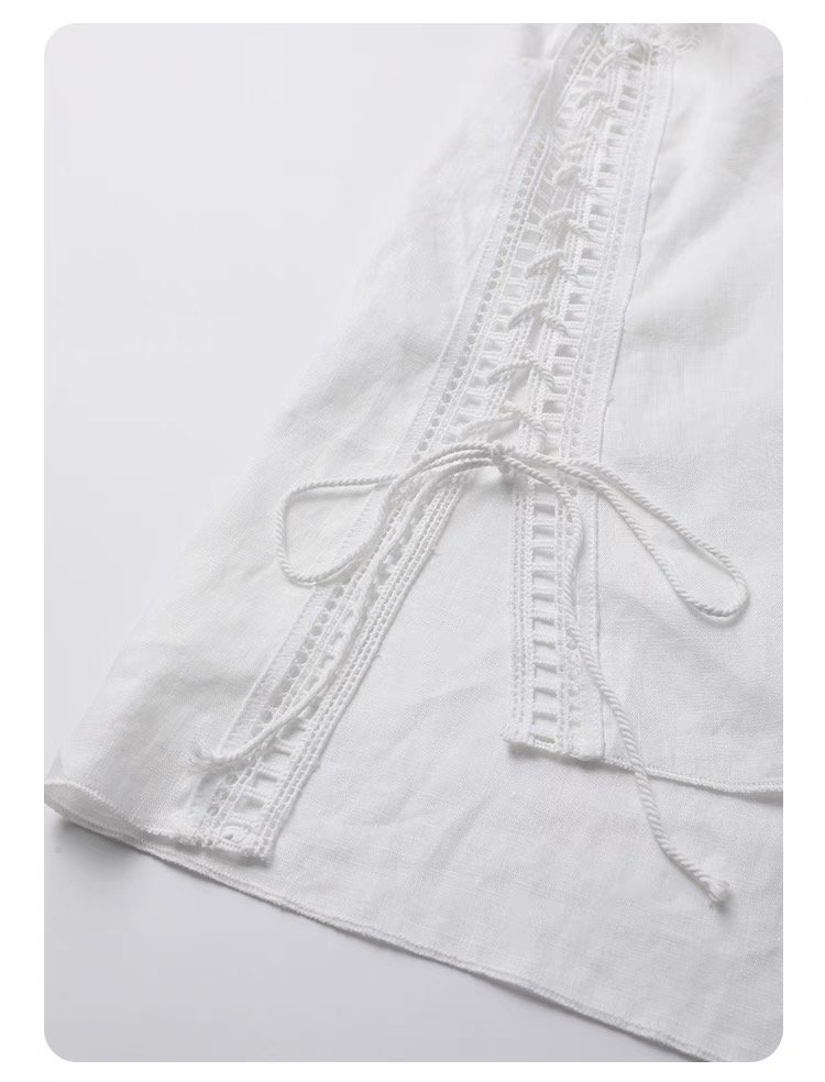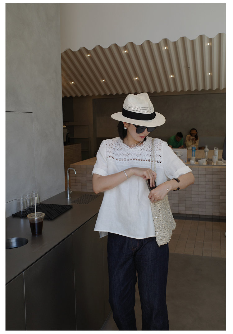 品名:白色亚麻蕾丝拼接上衣【半袖/无袖】