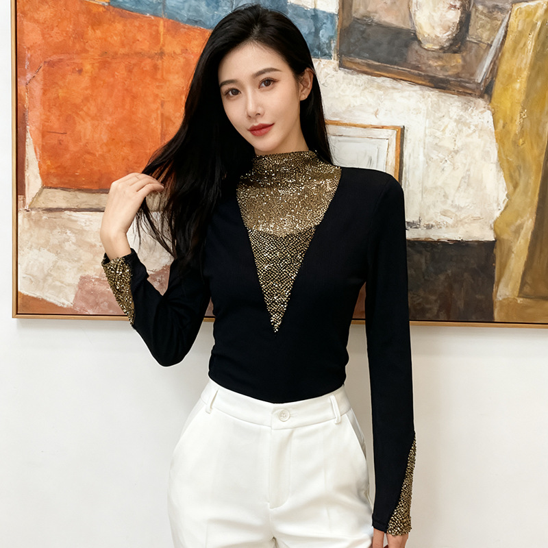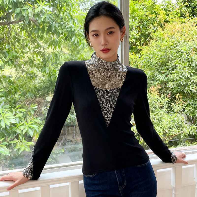 KQL480H6071 秋冬磨毛保暖别致V领镶钻长袖修身显瘦设计感轻奢上衣打底小衫