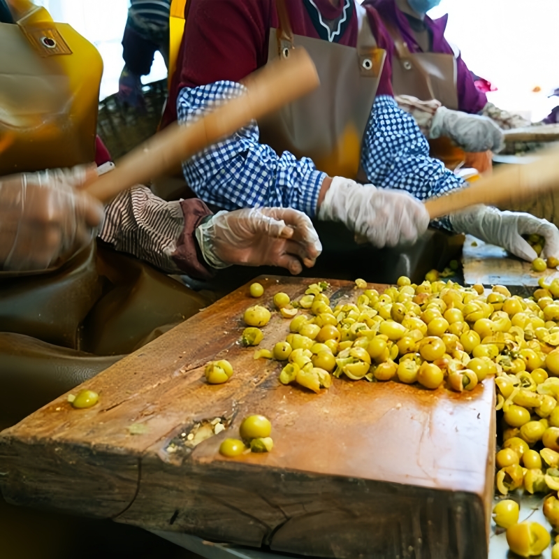 采摘后的野生果子,需要纯手工加工,去掉内核,保留新鲜的果肉。