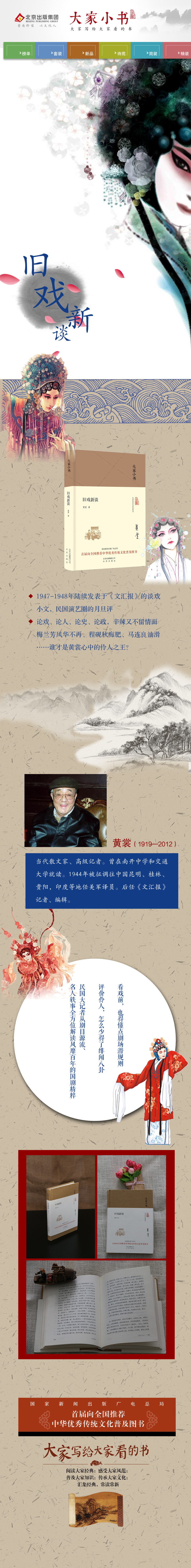 黄裳的 《旧戏新谈》称得上是一本“大师小书”,《旧戏新谈》是他一九四七年到一九四八年间在《文汇报》副刊写的关于戏剧的杂谈的结集。这辑文字笔调轻松诙谐,因此读来不仅通俗易懂,而且还能窥当时社会一斑。在书中,黄裳信笔由之,论戏、论人、论史、论证,每有种种不同的新见。 读者无须苟同,亦无须苟异,尤其是月旦人物之笔,求同存异可也。