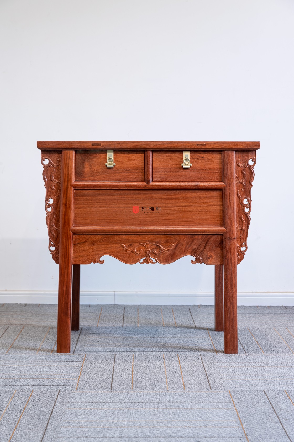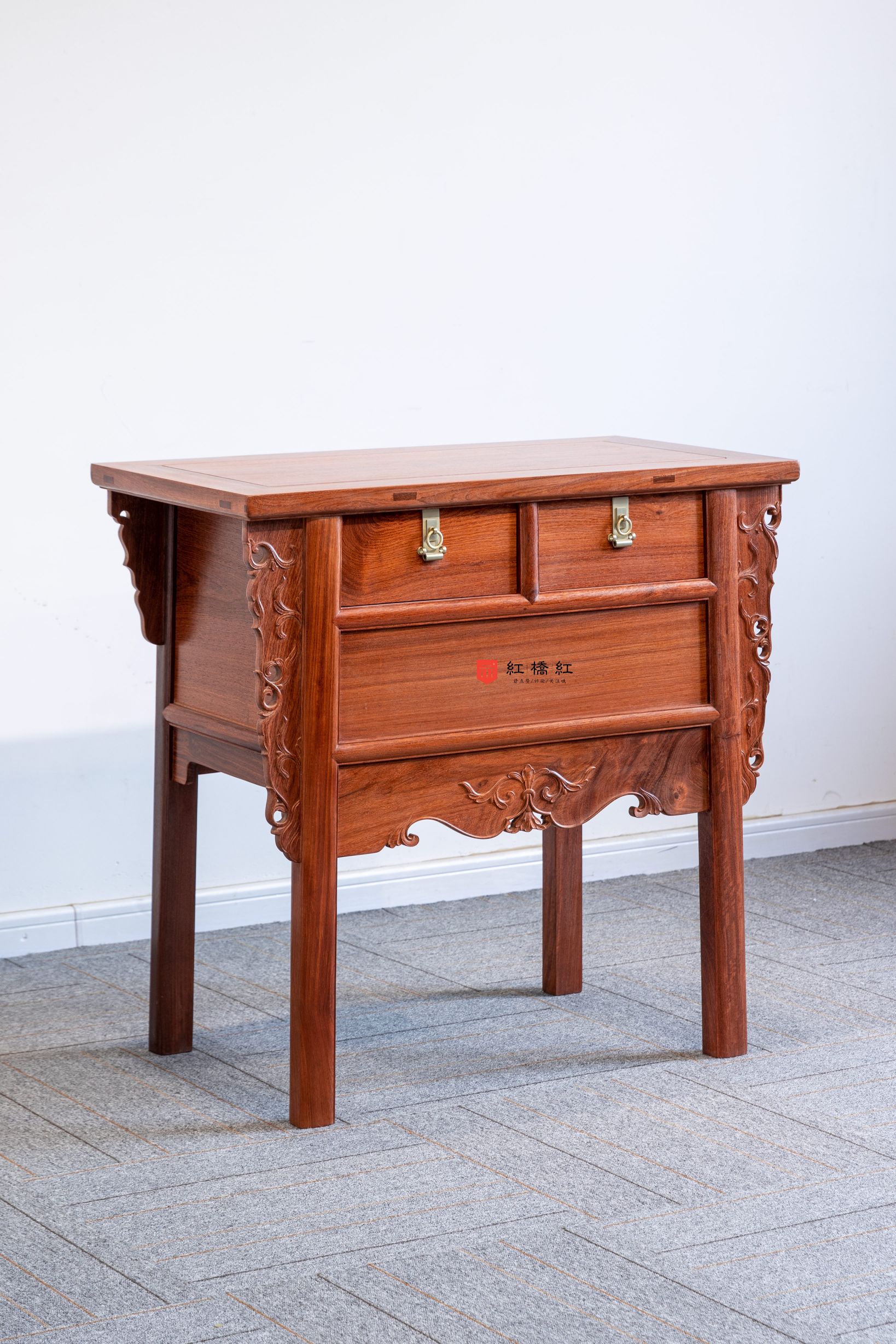 整体淳朴涵秀,攒框镶面心,大边出半透榫,冰盘沿舒敛洗练,侧面框下如暗槽,搬动趁手,设抽屉两具,安铜活,屉下有闷仓,将抽屉完全拉开后可纳藏私人珍罕;前脸壸门式牙条,凤凰点头姿态的卷草纹托角牙子,线条柔和,华丽贵气,打破了屉面及立墙的沉闷感;四足方材外撇,两侧枨下安素刀牙,缅花复刻循原物做法,原汁原味,韵真型实。