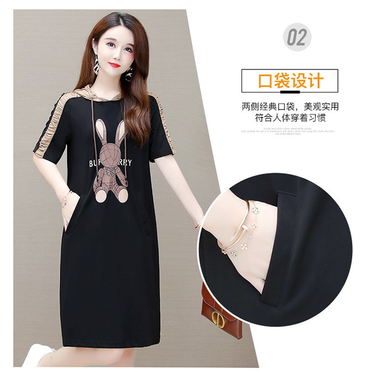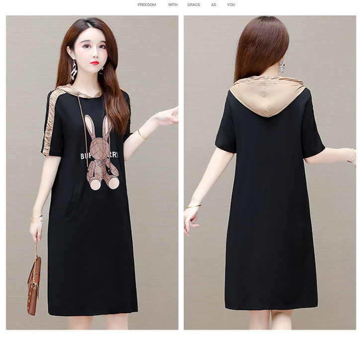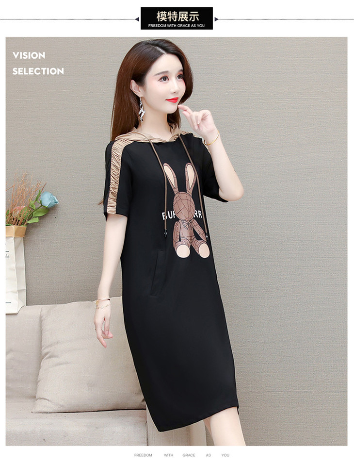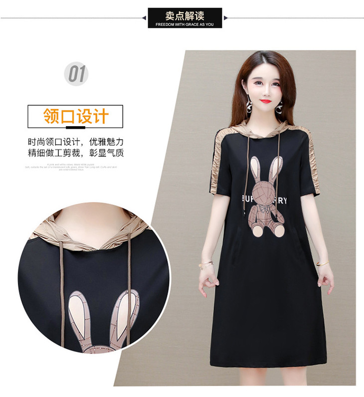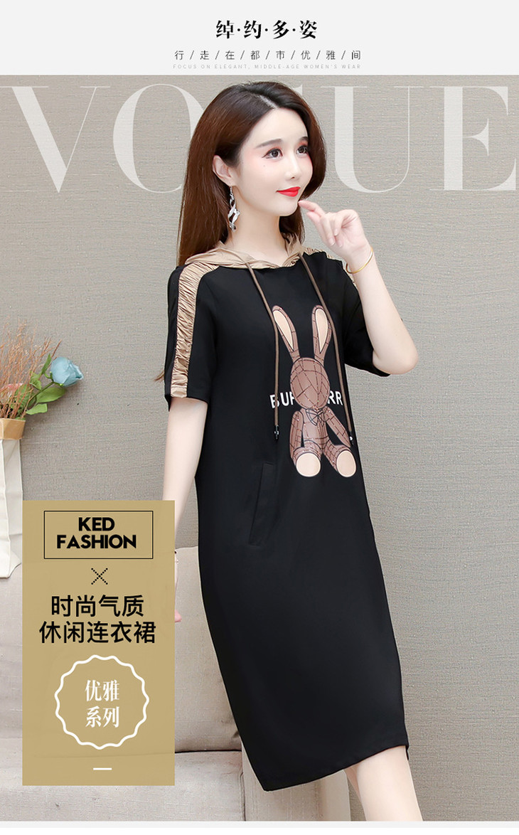 YWE-KED18066新款时尚气质连帽短袖中长款印花连衣裙