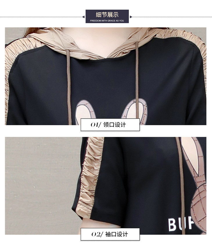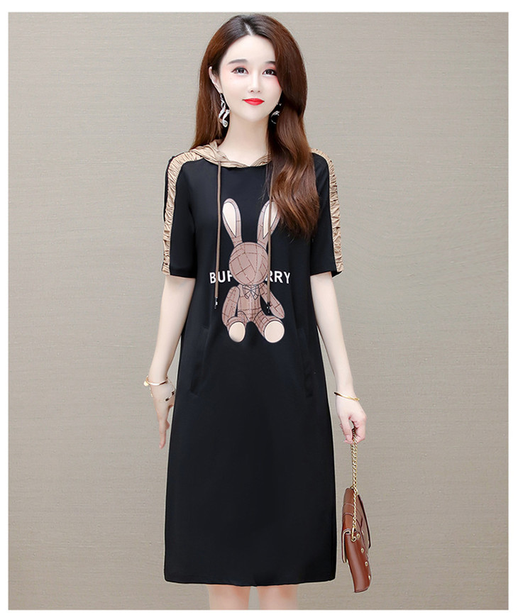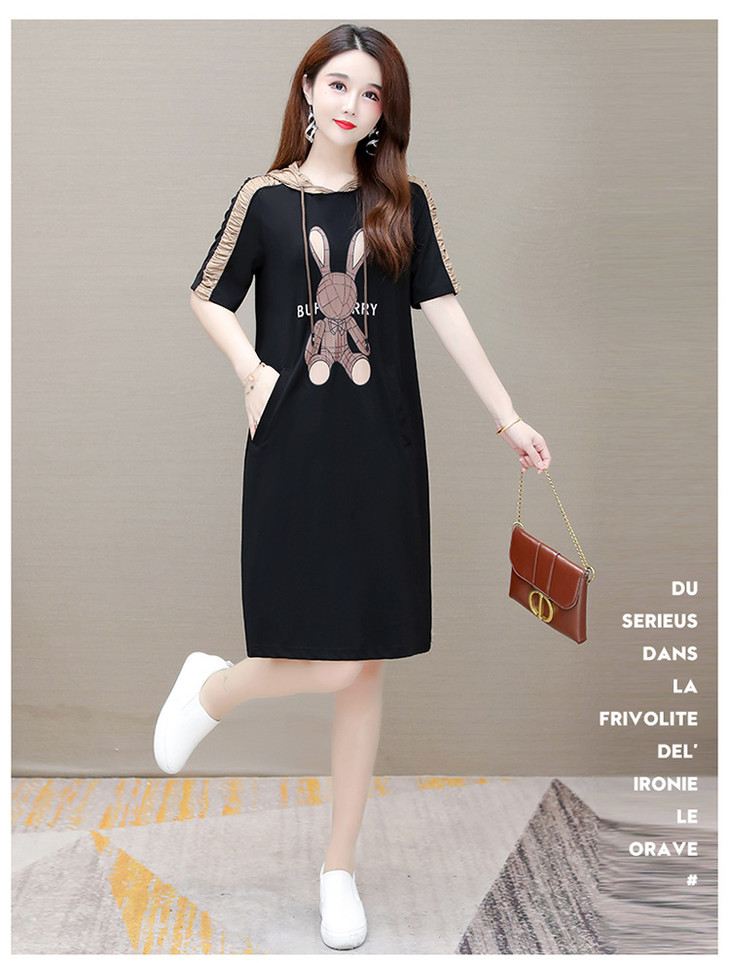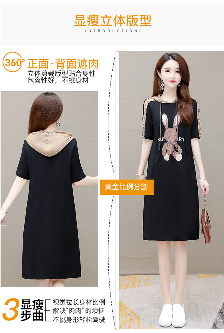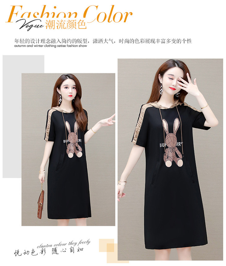 YWE-KED18066新款时尚气质连帽短袖中长款印花连衣裙