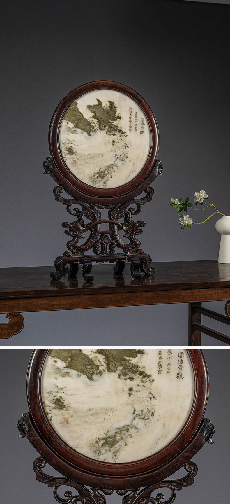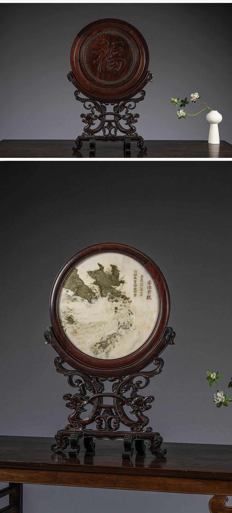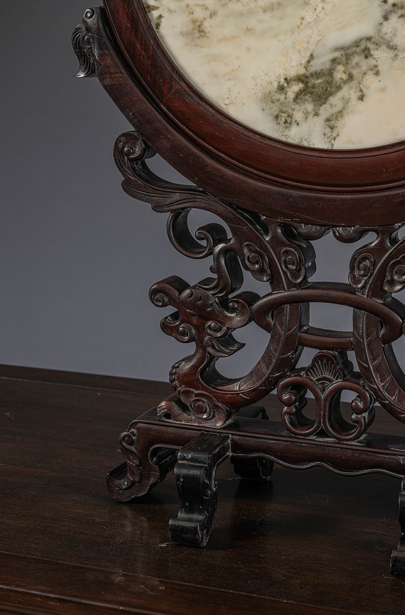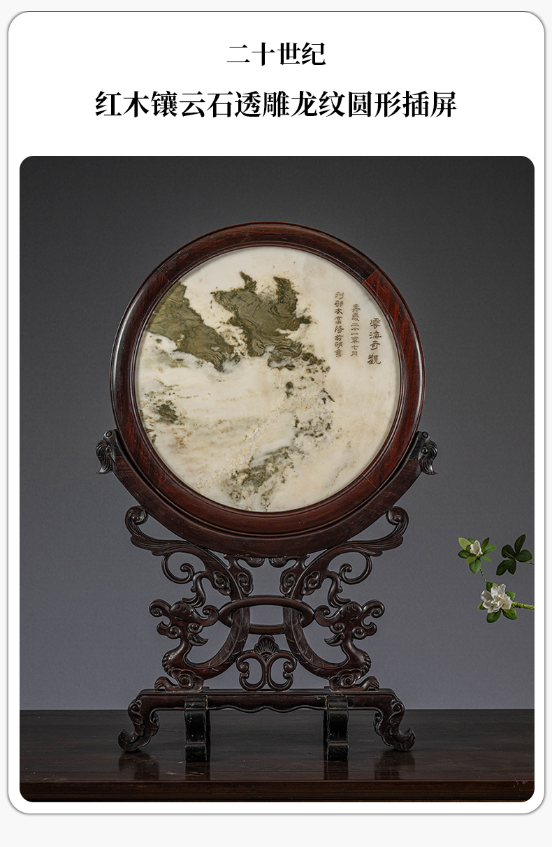 二十世纪 红木镶云石透雕龙纹圆形插屏