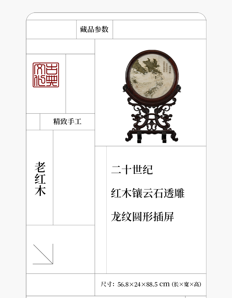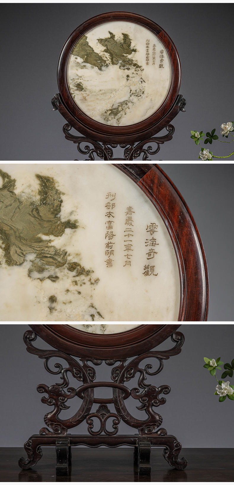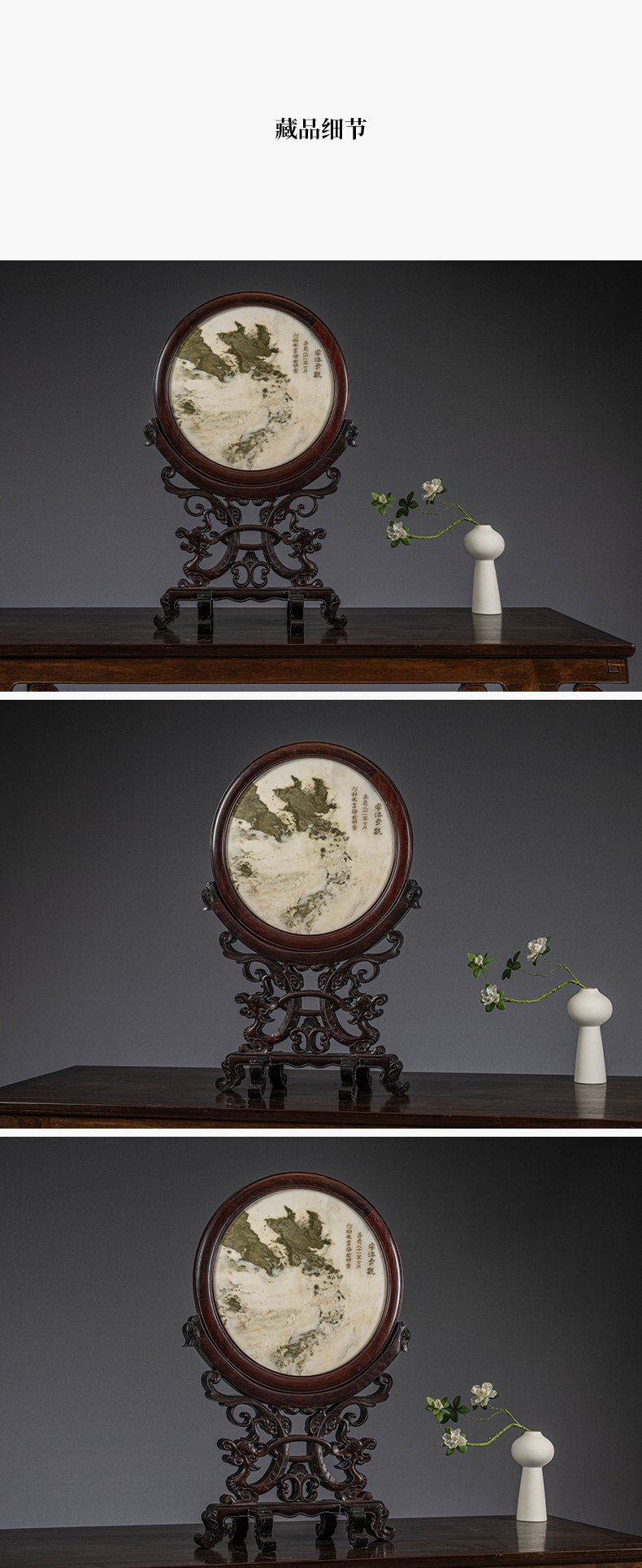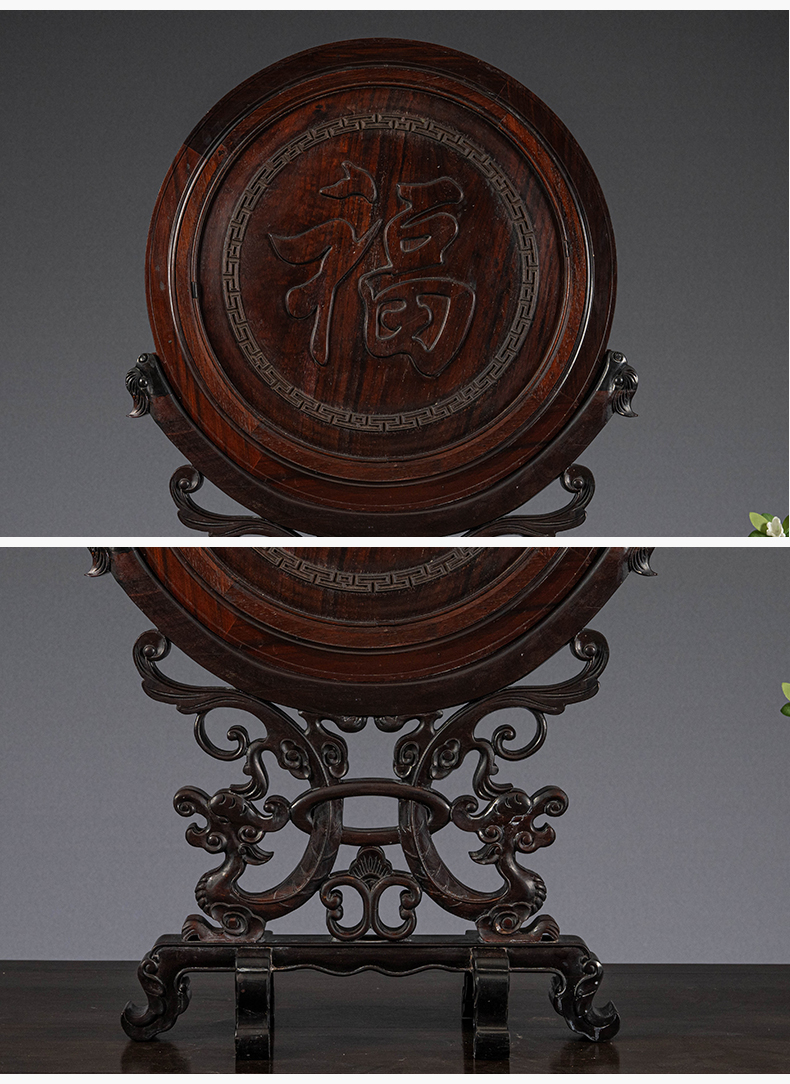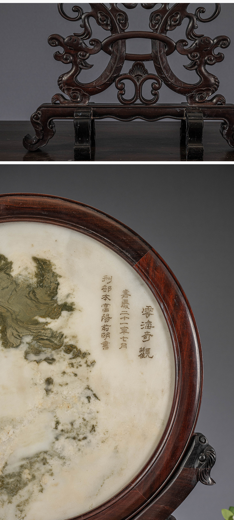 二十世纪 红木镶云石透雕龙纹圆形插屏