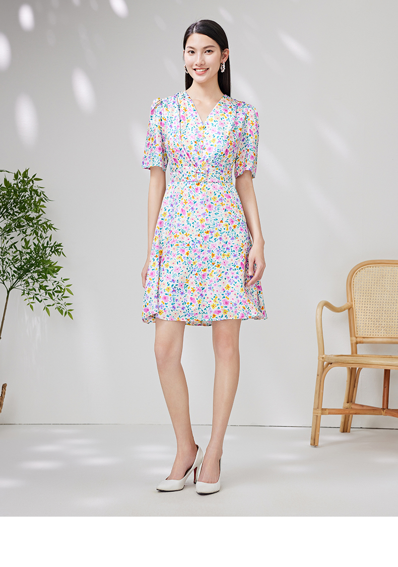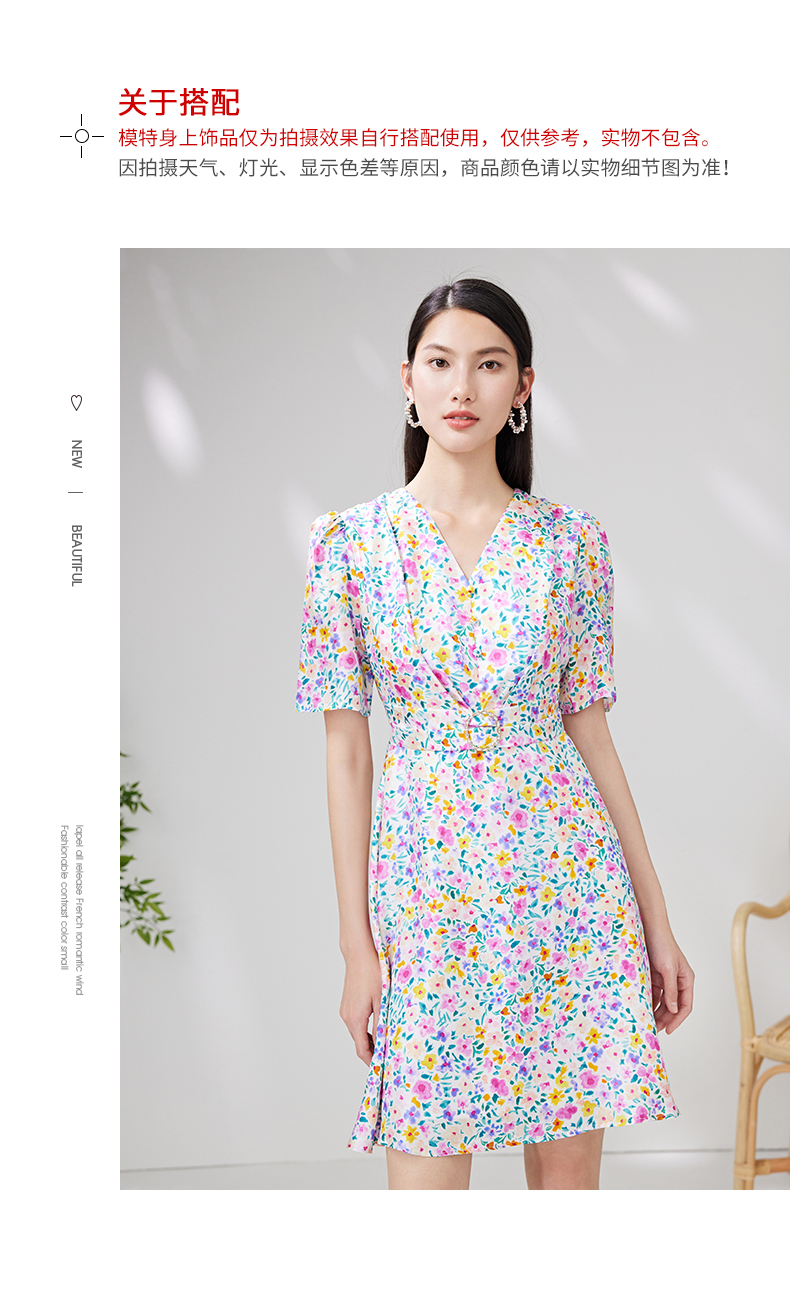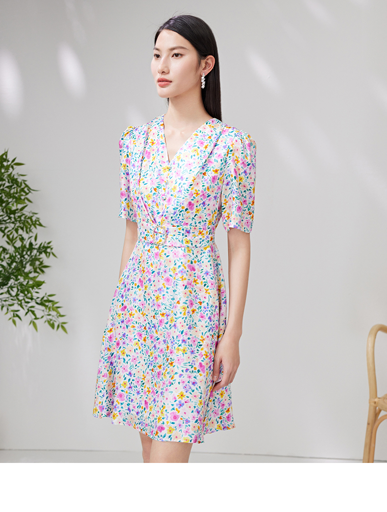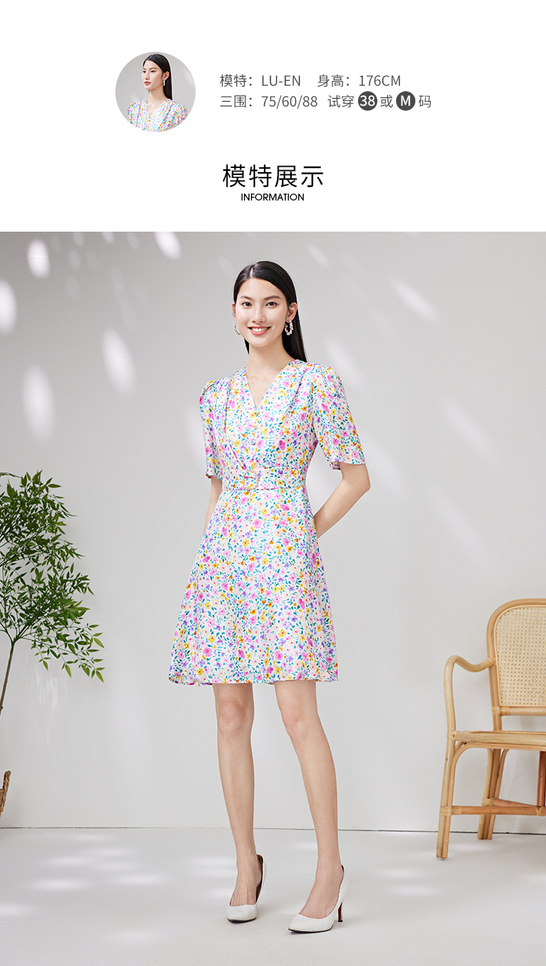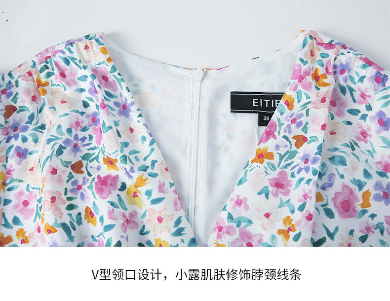 EITIE爱特爱夏款新品100%桑蚕丝显瘦V领舒适印花连衣裙7007767