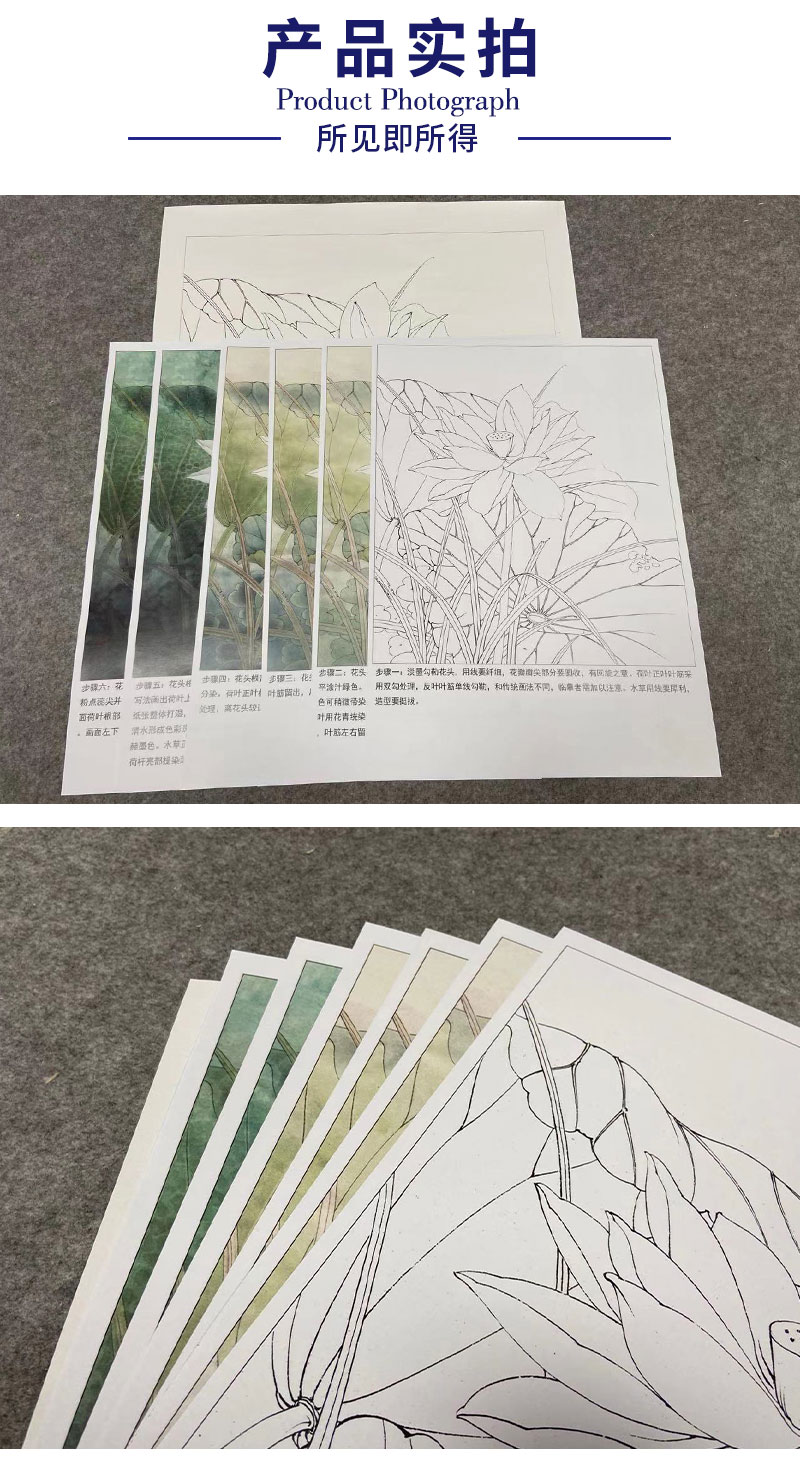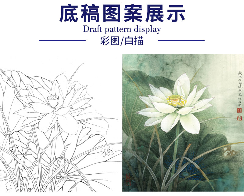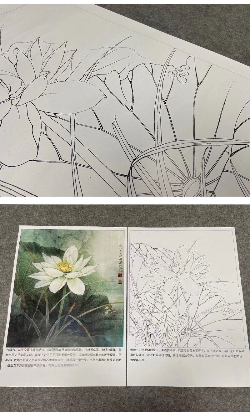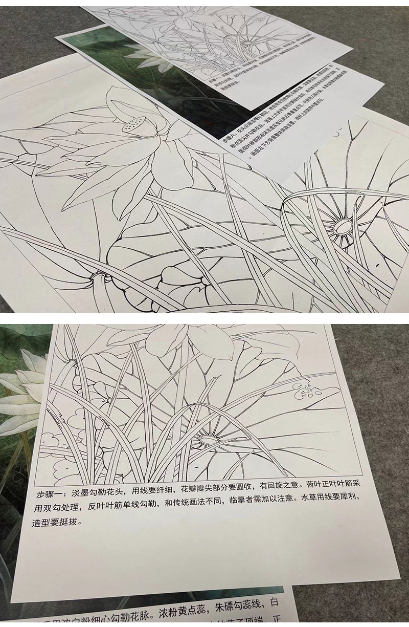 【有步骤、大彩图】李晓明工笔画白描底稿《荷韵》荷花初学者临摹花鸟线稿KE17