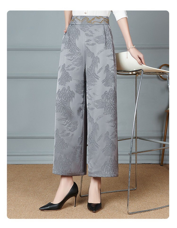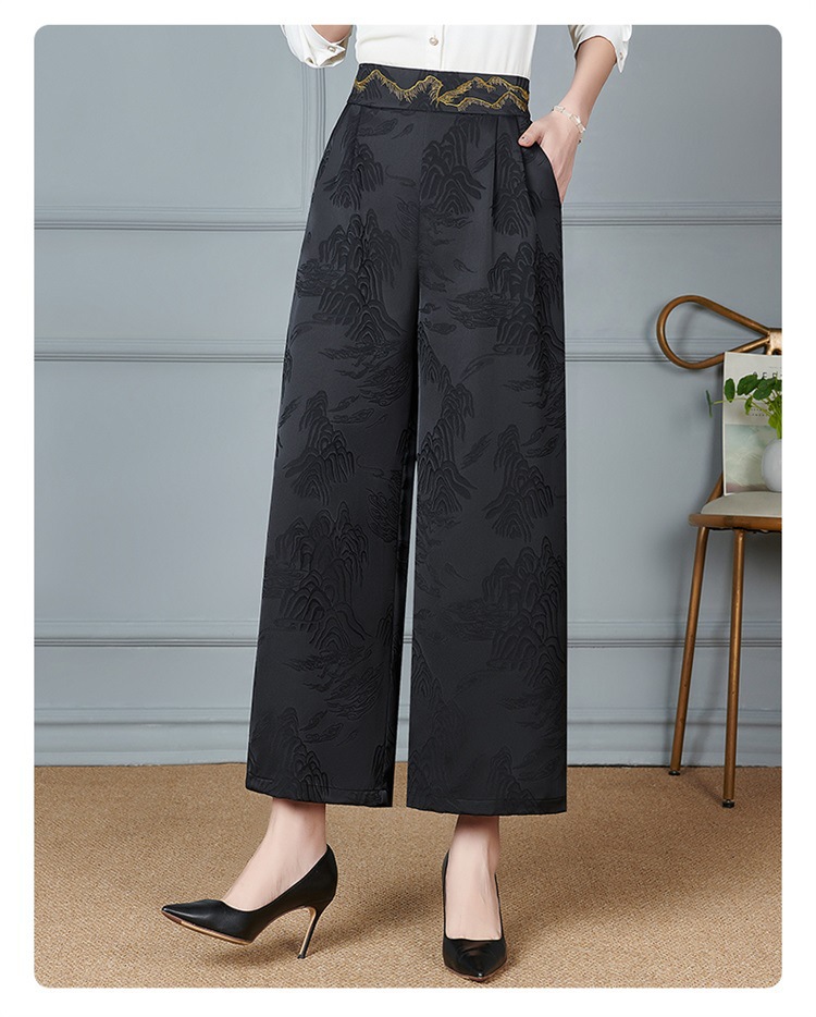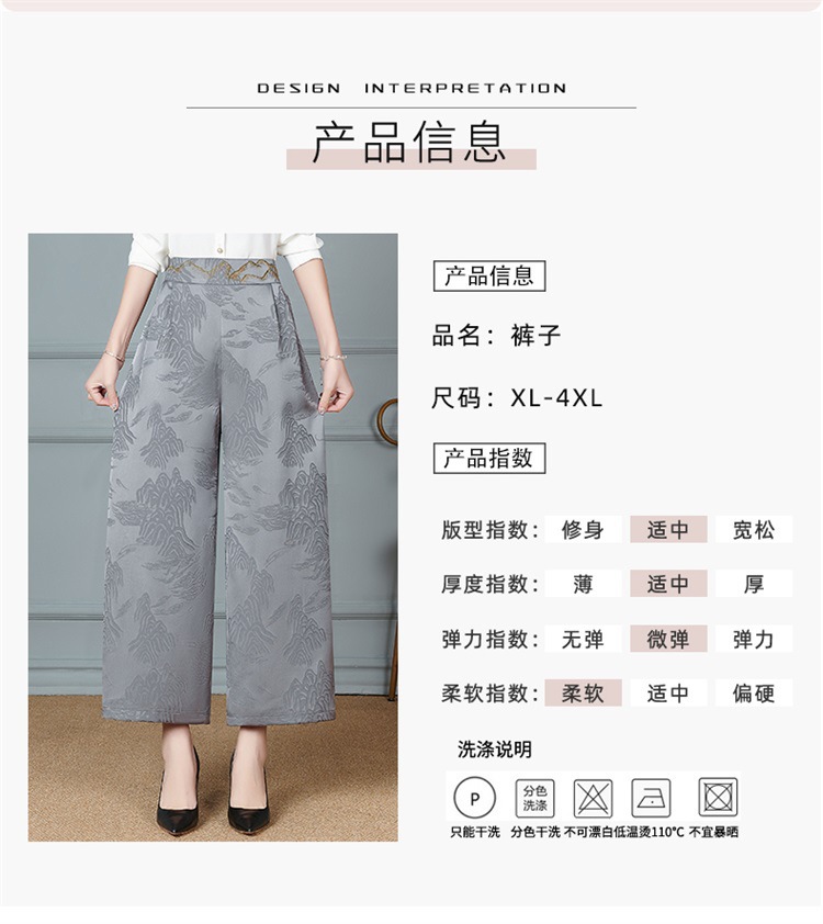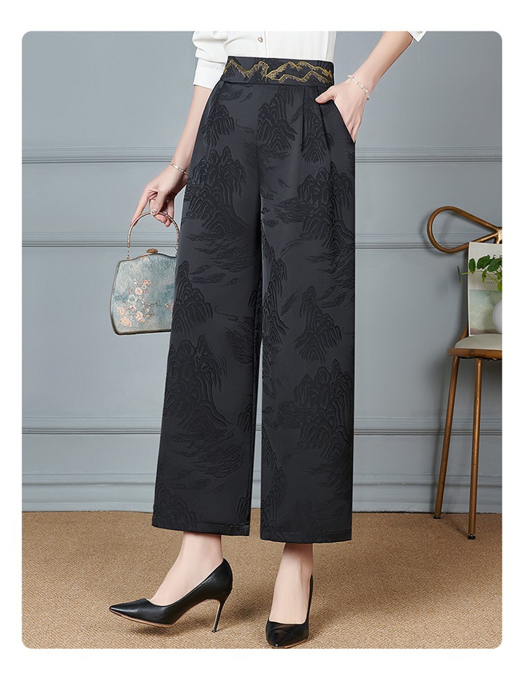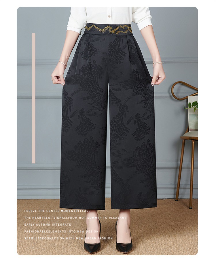 妈妈大码新款提花百搭高腰阔腿裤夏季休闲宽松中老年时尚国风裤子