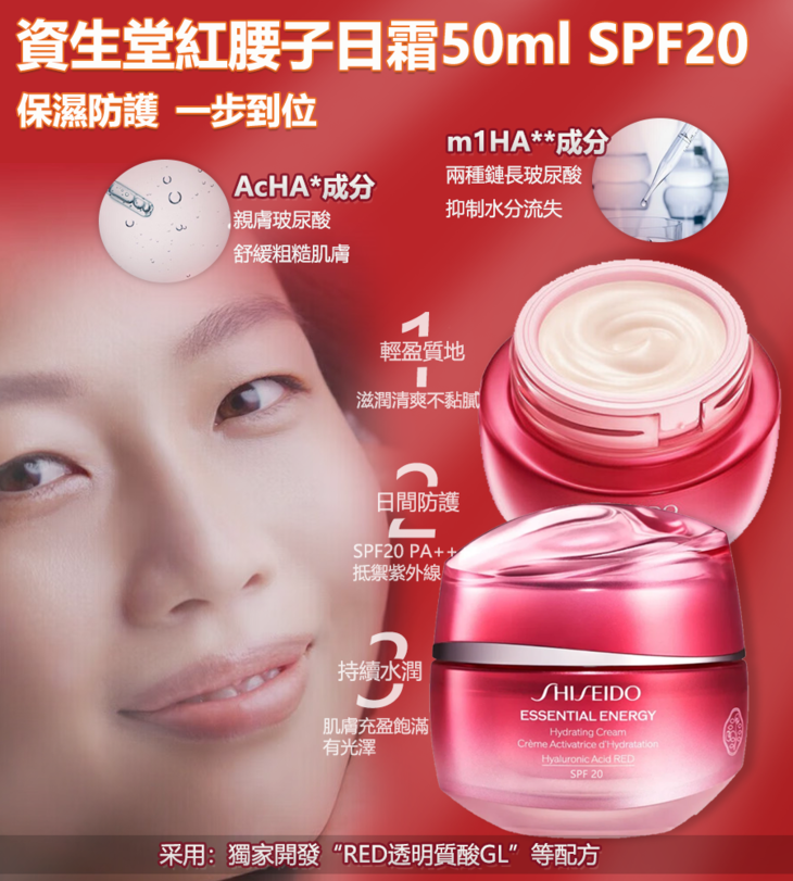 👑资生堂红腰子日霜50ml SPF20 👍皮肤粗糙、干燥缺水、暗沉,用它准没错! 💡采用:独家开发“RED透明质酸GL”等配方 ✅有效:清透滋润、快速补水、日常防晒 🔥渗透到肌肤深层,抚平干燥细纹,让肌肤柔软有弹性 ⭐自带SPF 20,日常防晒,出门都不怕 ✨不厚重,不致痘,对混油皮非常友好!