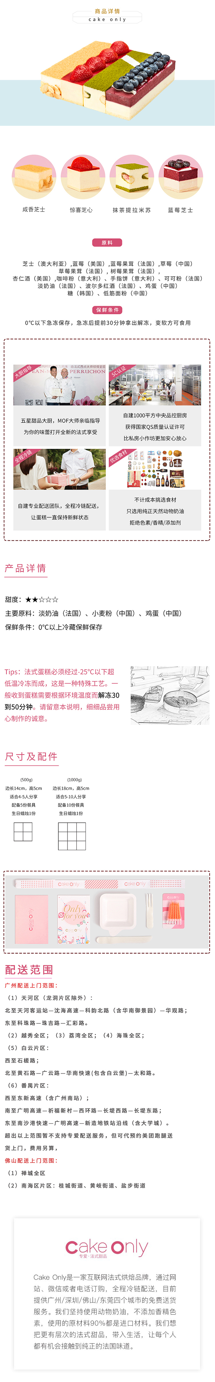 - Cake Only采用动物奶油、法国芝士等进口原料,并搭配时令新鲜水果等优质食材,制作出更有层次的法式甜品。通过网络或电话订购,全程冷链配送,目前支持广州/佛山免费送货服务。