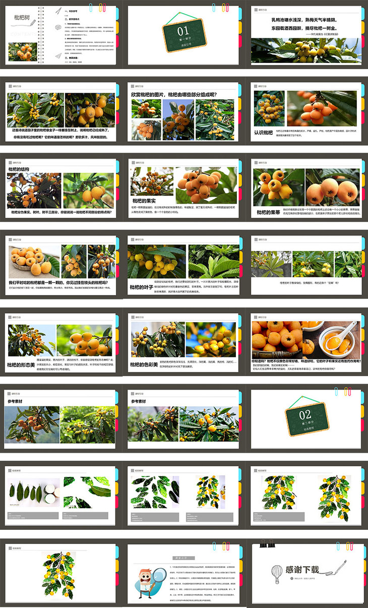 通过参考枇杷树的素材,观察它的形态和色彩变化,枇杷的形状虽然简单,但是大小的枇杷组合在一起,形成了前后的遮挡关系,同时在表现枝叶上我们也应当注意形与线条之间的遮挡、穿插,形成画面丰富的空间感和层次感,可以通过自主创作表现出枇杷树的造型,注意画面的疏密结合。
