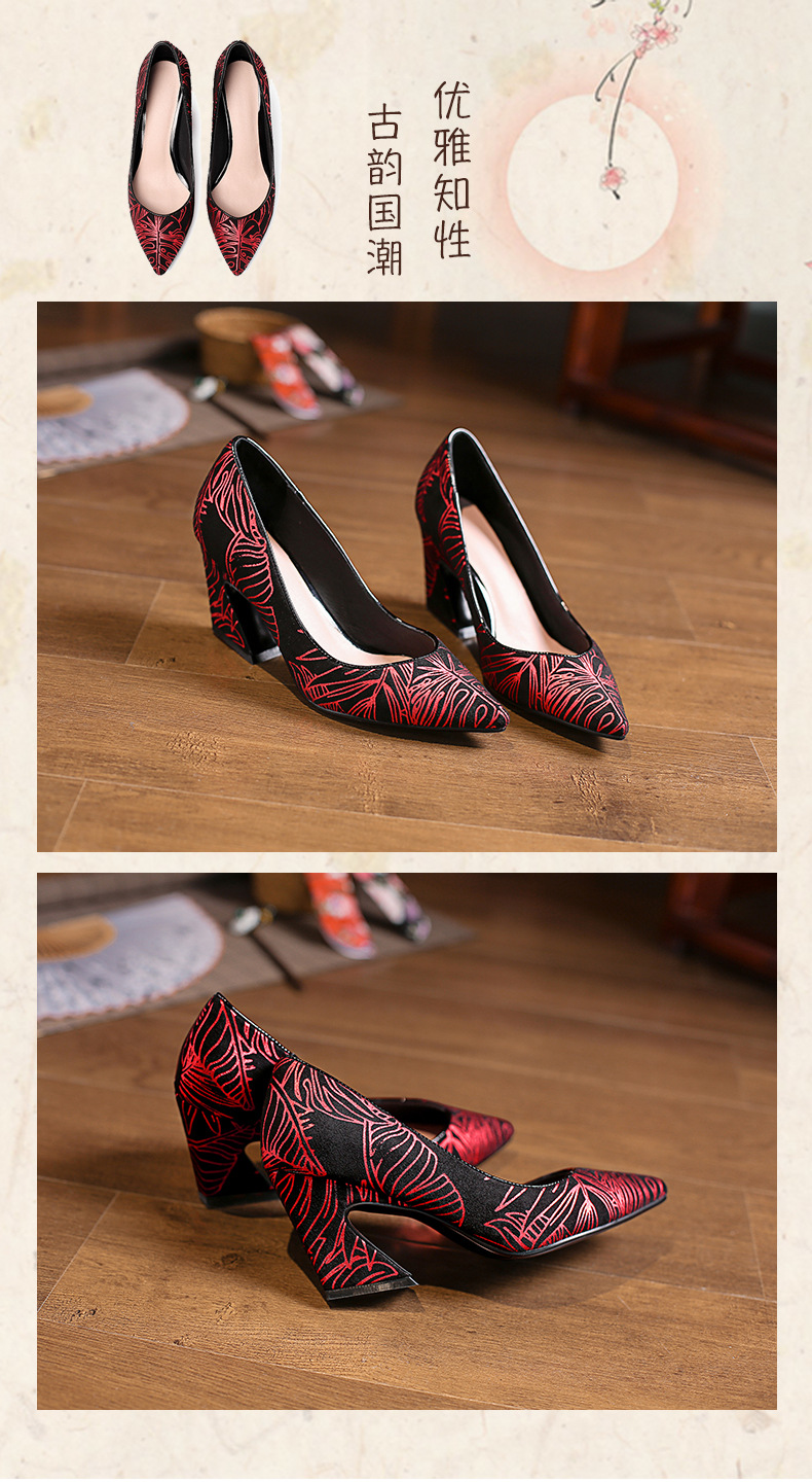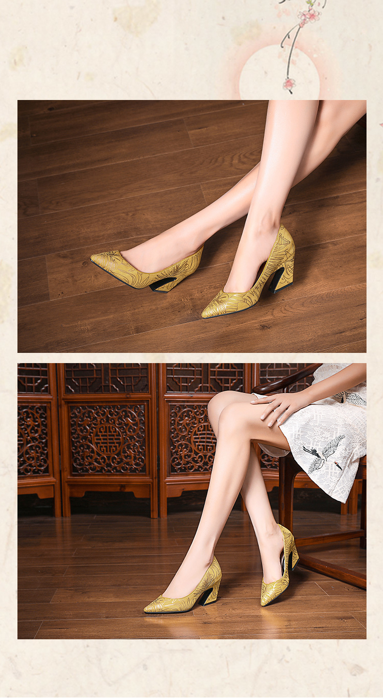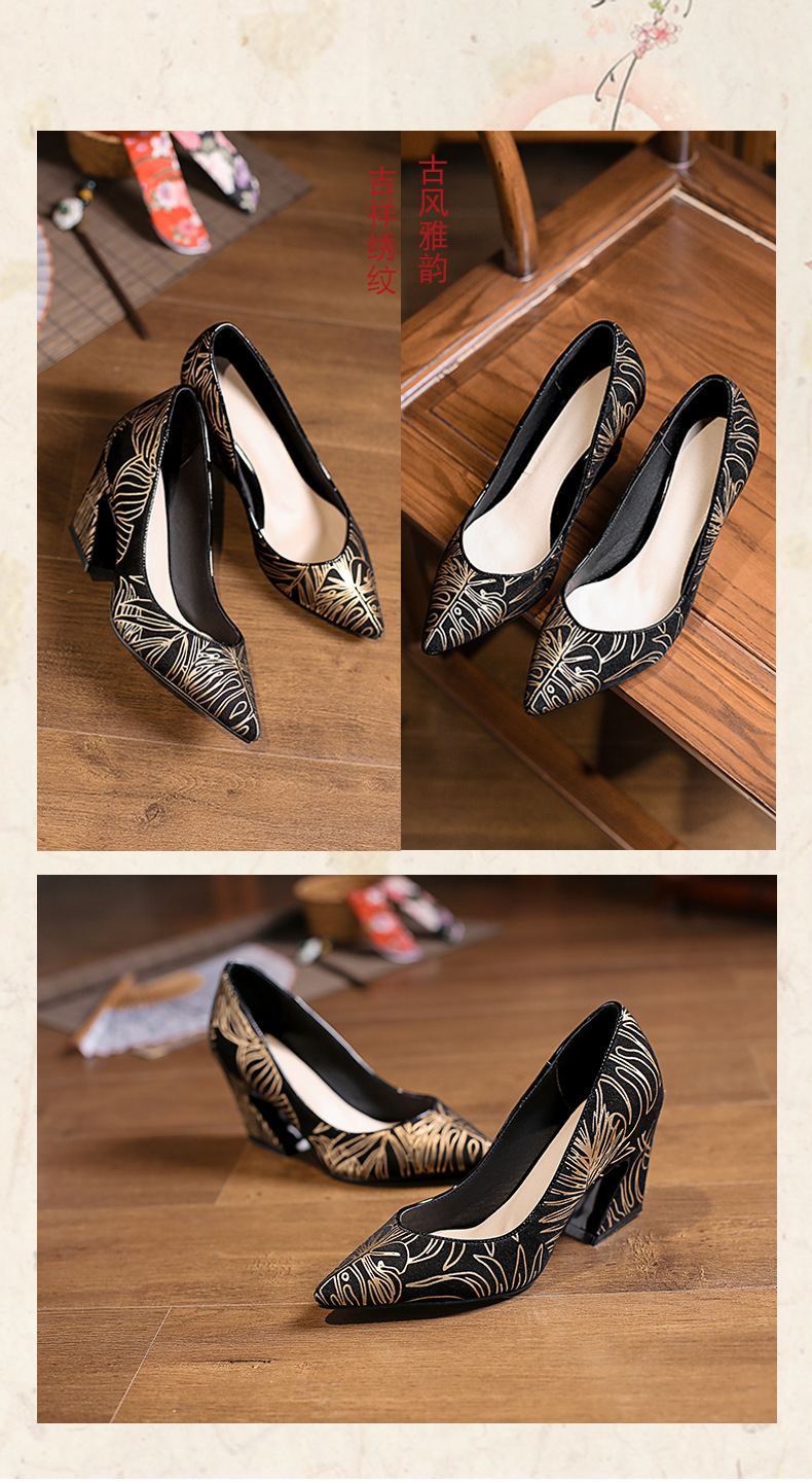 XYSM-D37-2B新款尖头复古印花真皮马蹄跟粗跟旗袍鞋