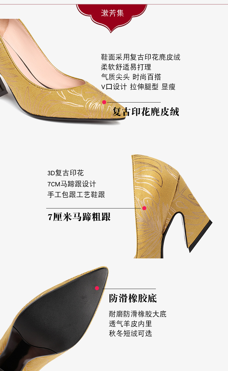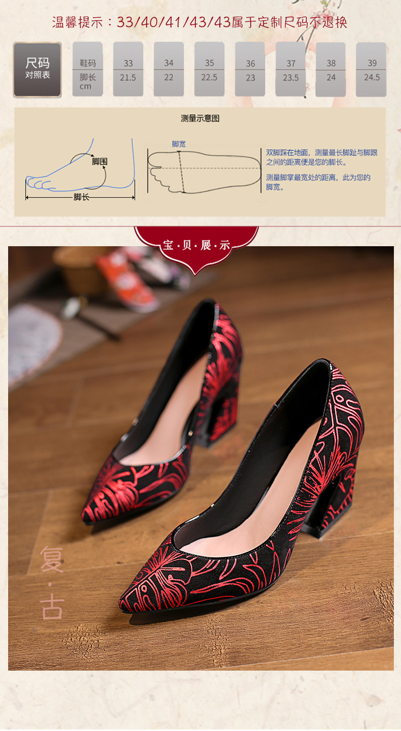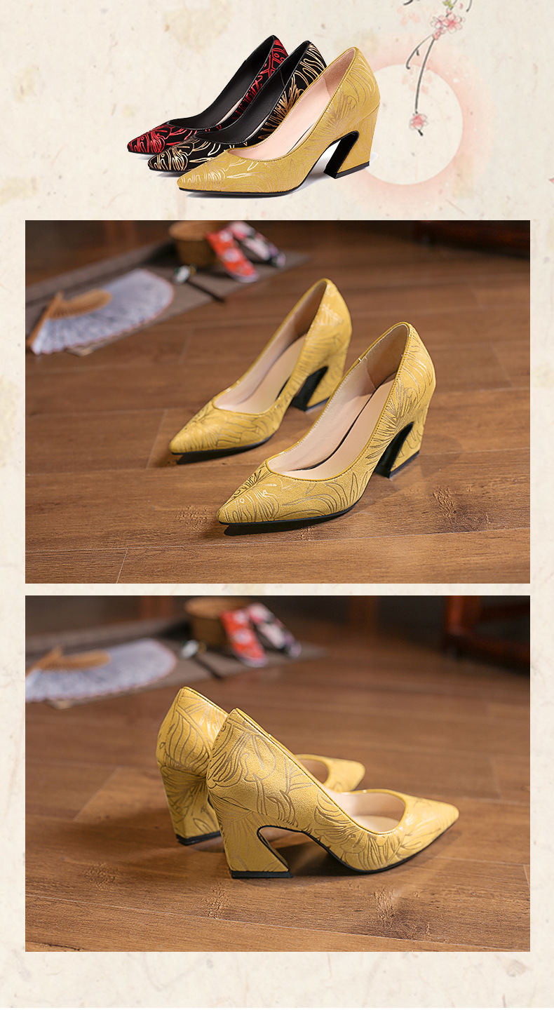 XYSM-D37-2B新款尖头复古印花真皮马蹄跟粗跟旗袍鞋