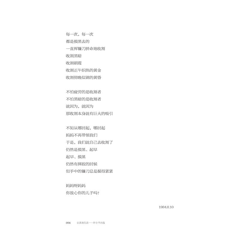 当了近四十年的编辑,我现在越来越看重诗歌与人生的相互印证,否则写诗就会沦落为一种词语组合修辞游戏,智能机器人也可以做到。叶小平是一个真正的诗人,他的一生就在诗中呈现,有着人诗互证的意义。同时,他的诗歌完整地记录了他生活的时代,因此也有了诗史互证的价值。