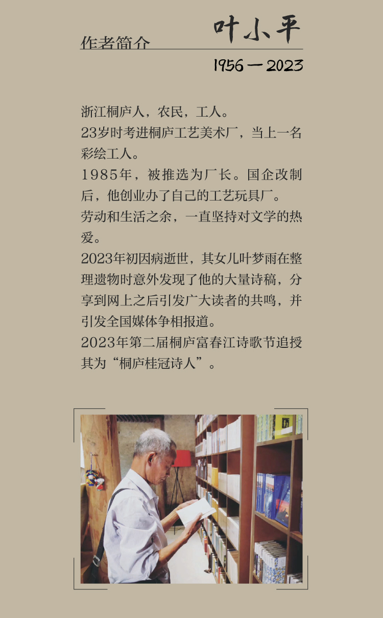 叶小平(1956—2023),浙江桐庐人,农民,工人。23岁时考进桐庐工艺美术厂,当上一名彩绘工人。1985年,被推选为厂长。国企改制后,他创业办了自己的工艺玩具厂。劳动和生活之余,一直坚持对文学的热爱。2023年初因病逝世,其女儿叶梦雨在整理遗物时意外发现了他的大量诗稿,分享到网上之后引发广大读者的共鸣,并引发全国媒体争相报道。2023年第二届桐庐富春江诗歌节追授其为“桐庐桂冠诗人”。