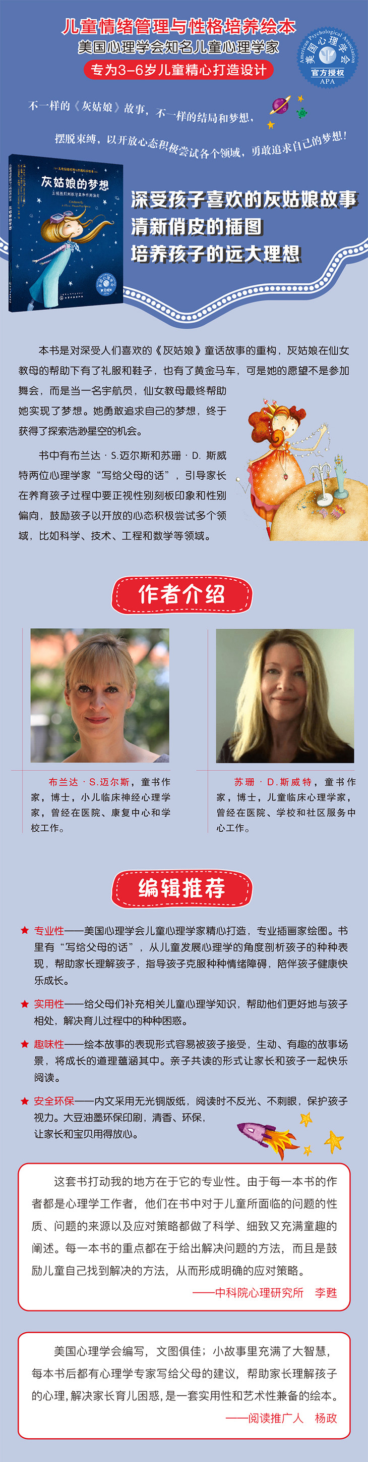 灰姑娘的梦想不都是舞会和王子,也可以是宇航员!就像本书的主人公一样,她不想参加舞会,也不想 遇见王子,即使有水晶鞋和马车,她还是要追逐自己的梦想。本书通过改写经典童话故事,鼓励孩子尤其是女孩子要勇敢追逐自己的梦想,更加符合尊重孩子梦想的现代教育观。 书后有写给父母的话,告诉家长,孩子的梦想不应该受性别刻板印象的阻碍,女孩子也可以在科学上有所建树。