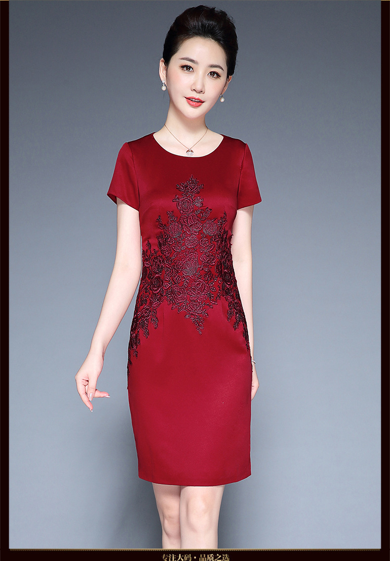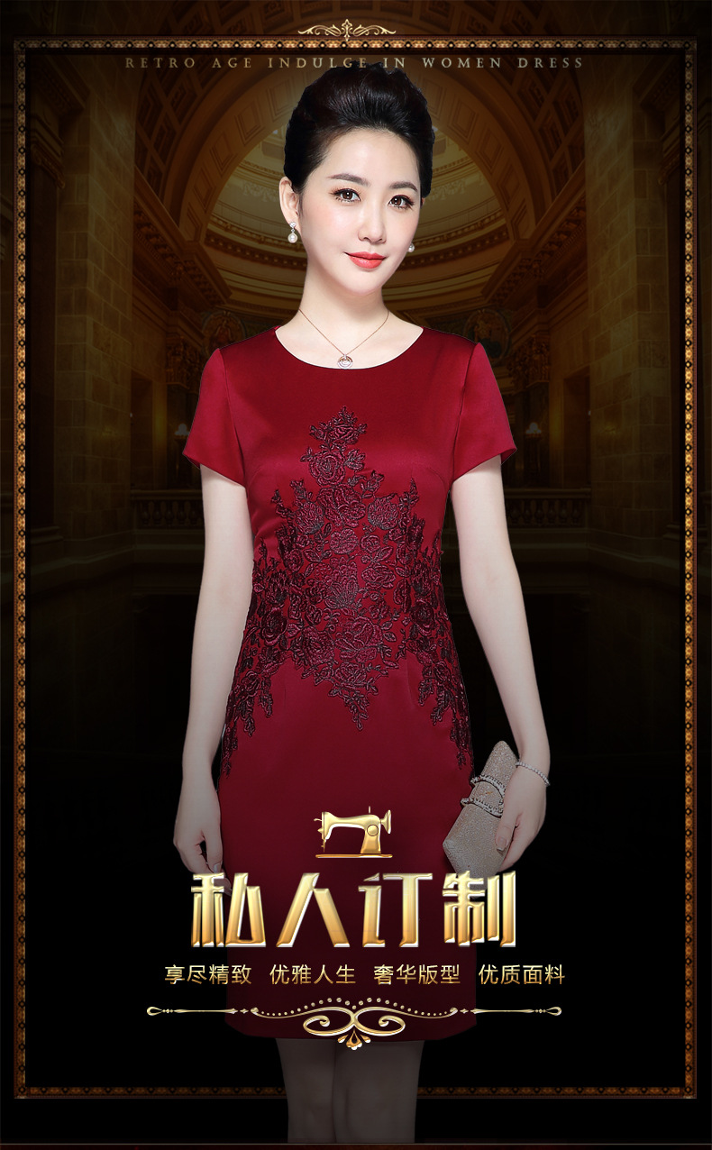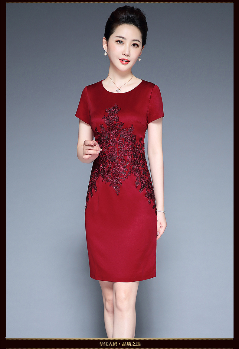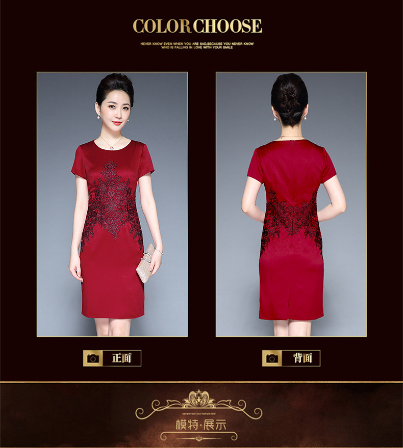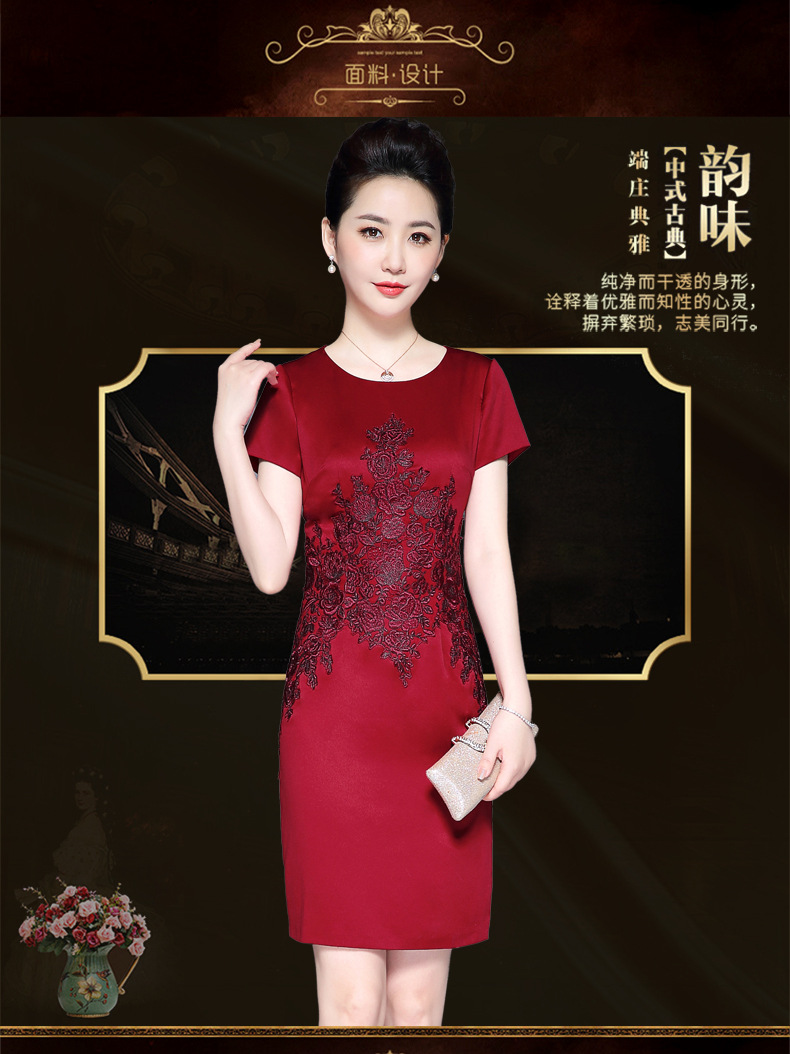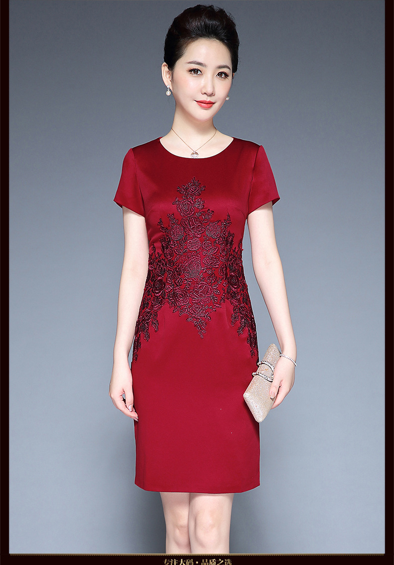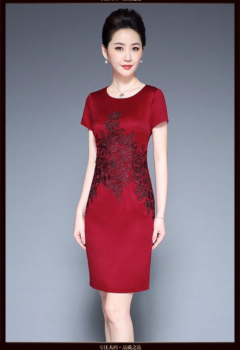 LC-2061新款短袖刺绣连衣裙婚礼服妈妈装喜婆婚宴服修身中长裙