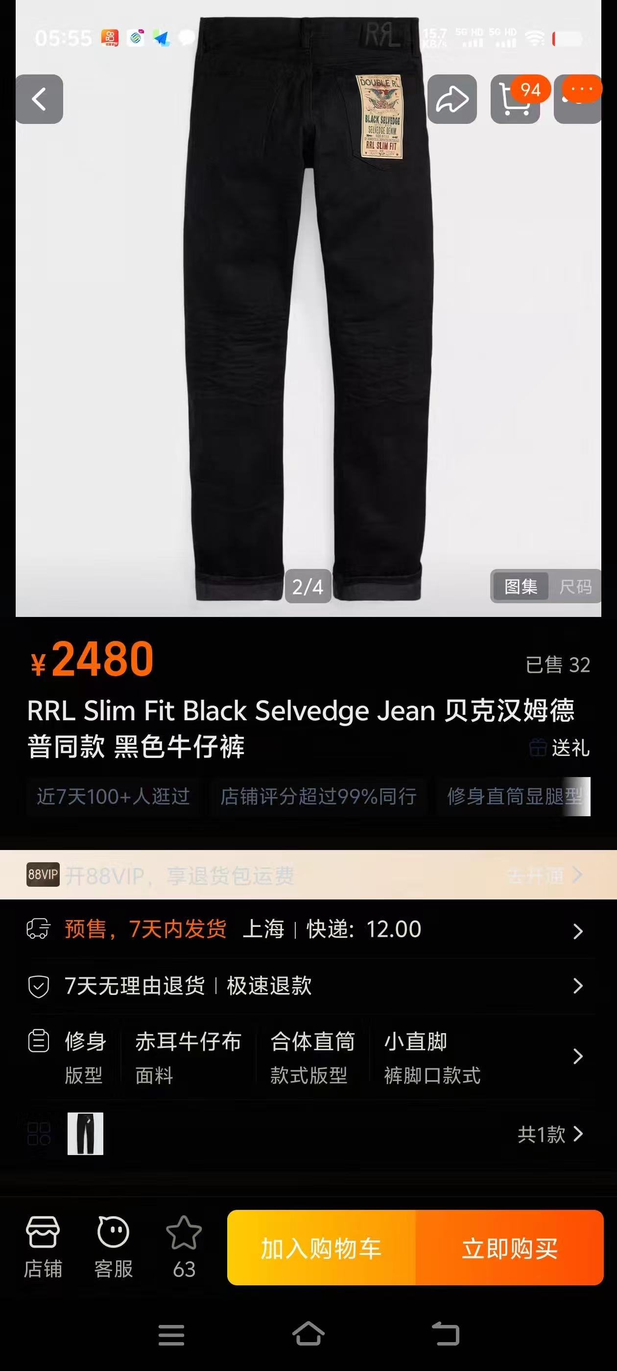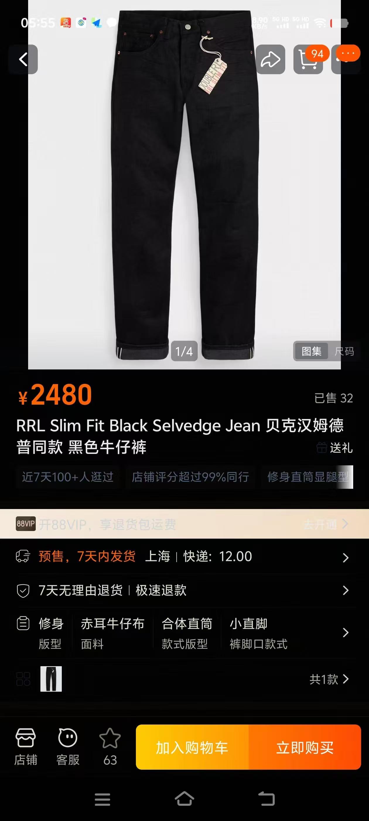 RRL Slim Fit Black Selvedge Jean 贝克汉姆德普同款 黑色牛仔裤