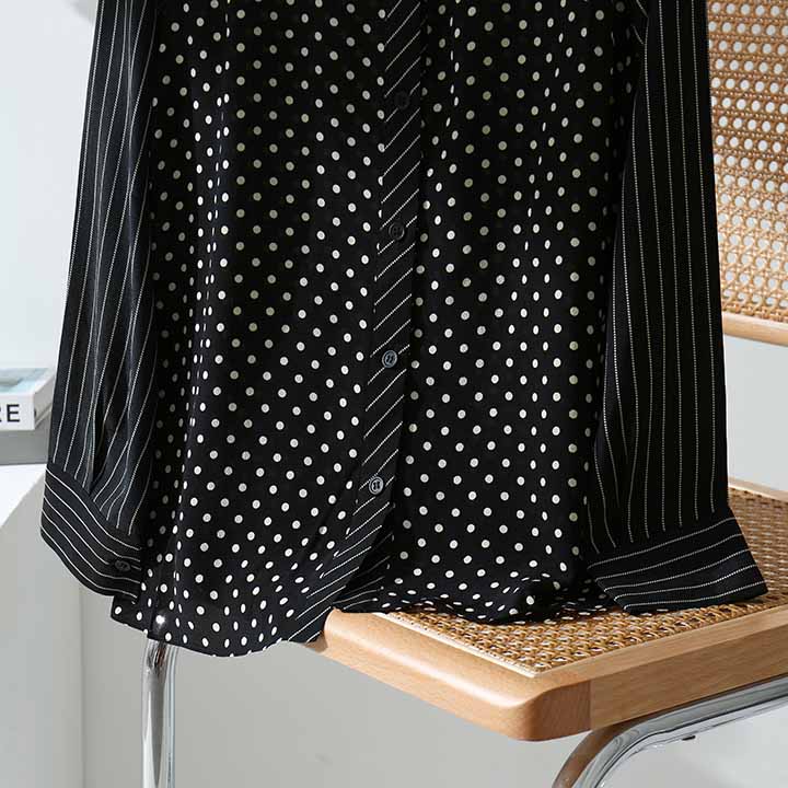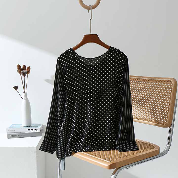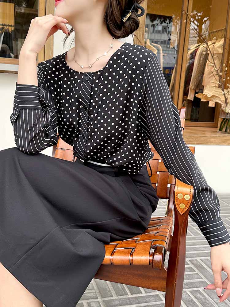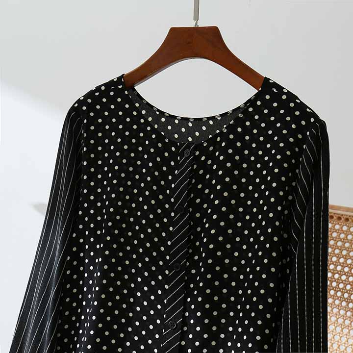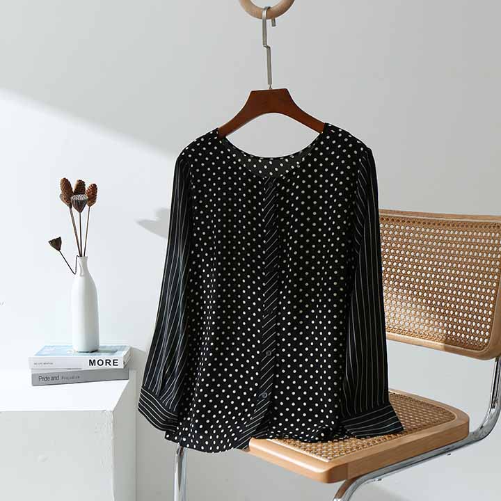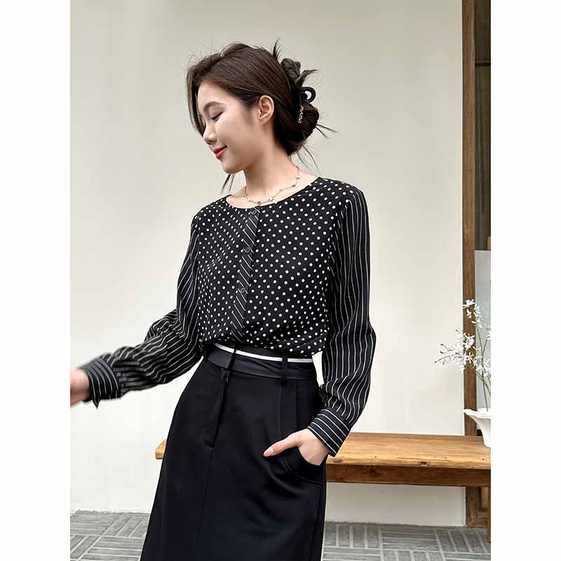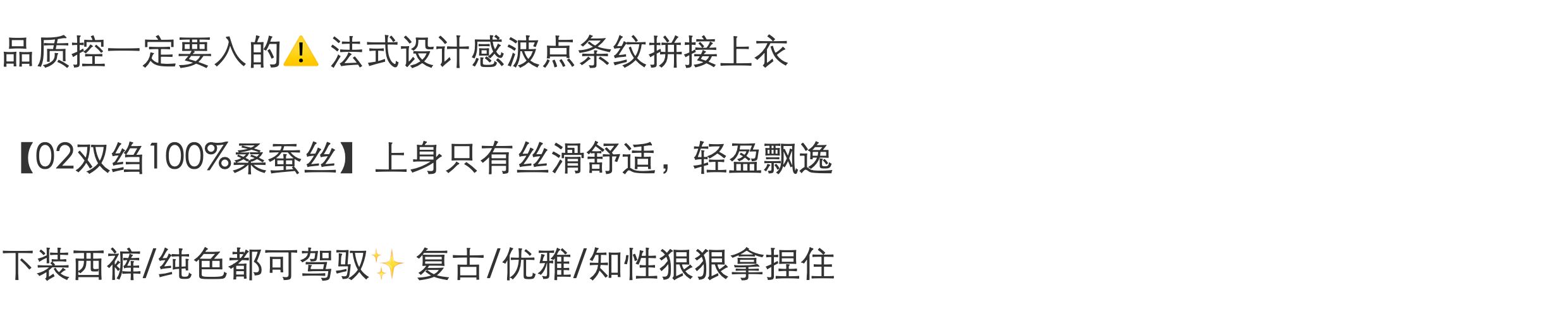 顺丰包邮洛诗琳03921法式设计感波点条纹拼接圆领真丝上衣2835