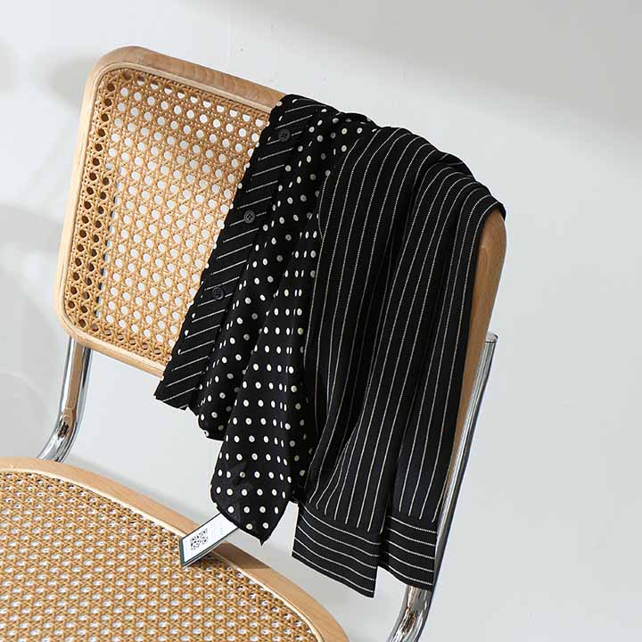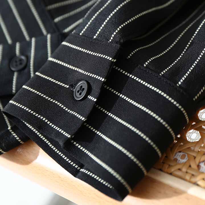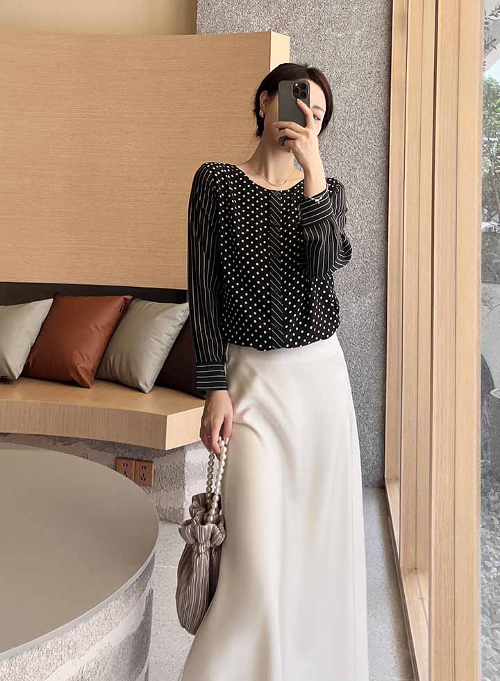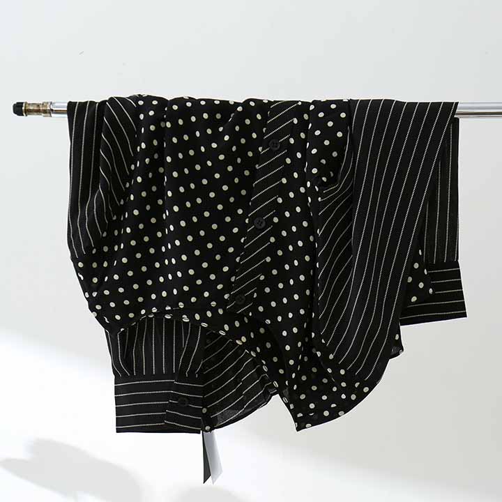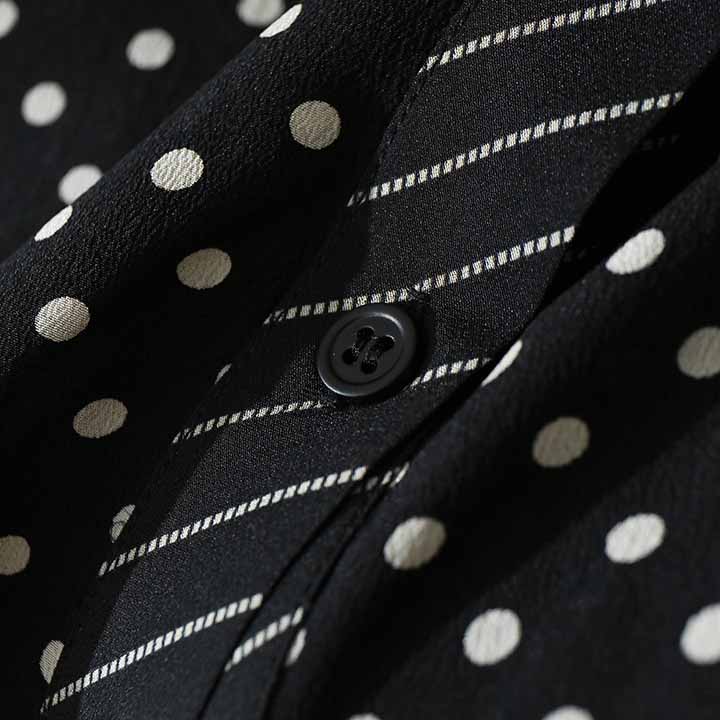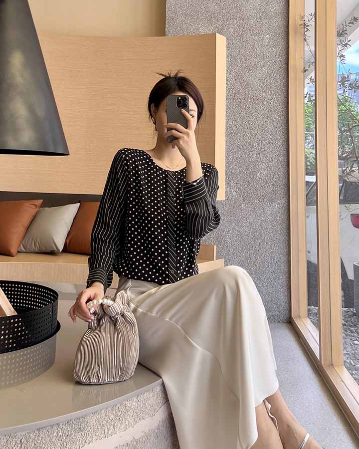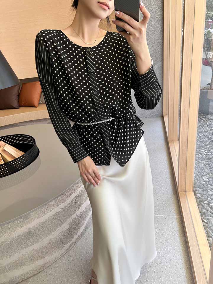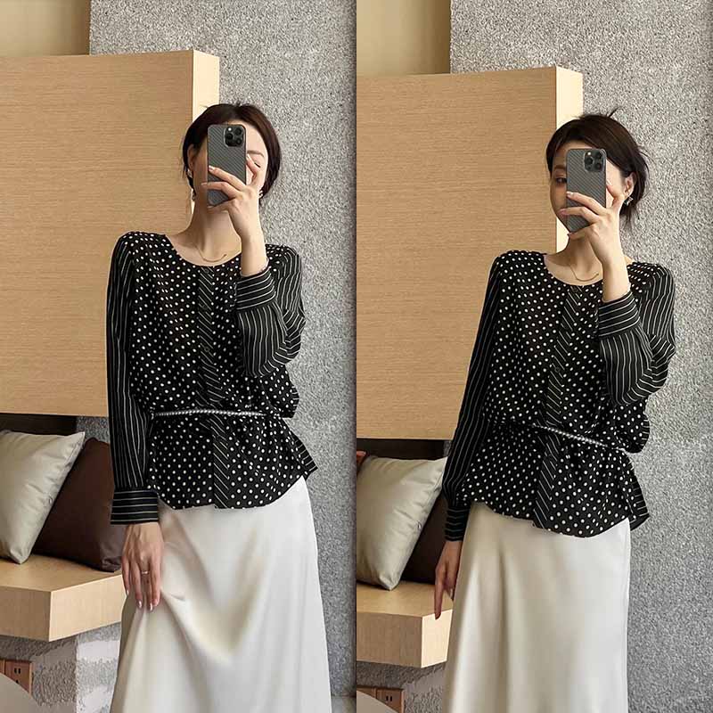 顺丰包邮洛诗琳03921法式设计感波点条纹拼接圆领真丝上衣2835