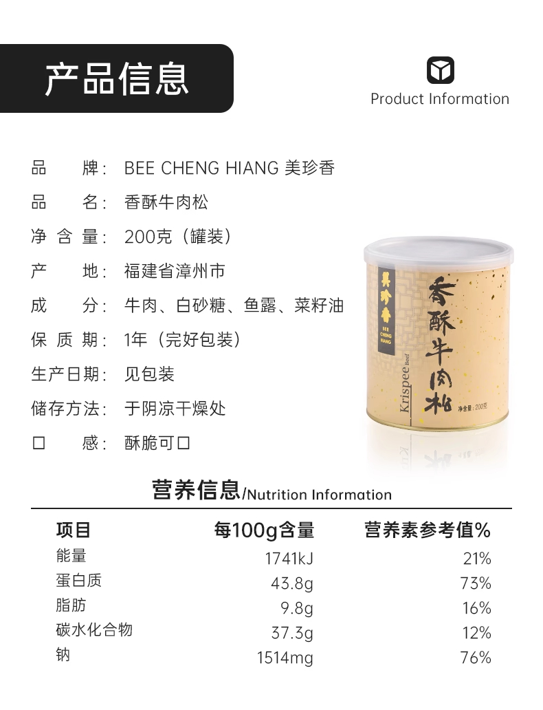 美珍香香酥牛肉松200g拌粥夹面包烘焙寿司营养健康零食罐装锁味