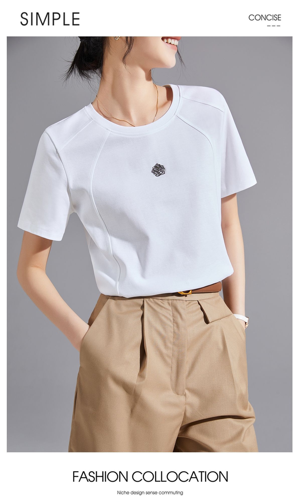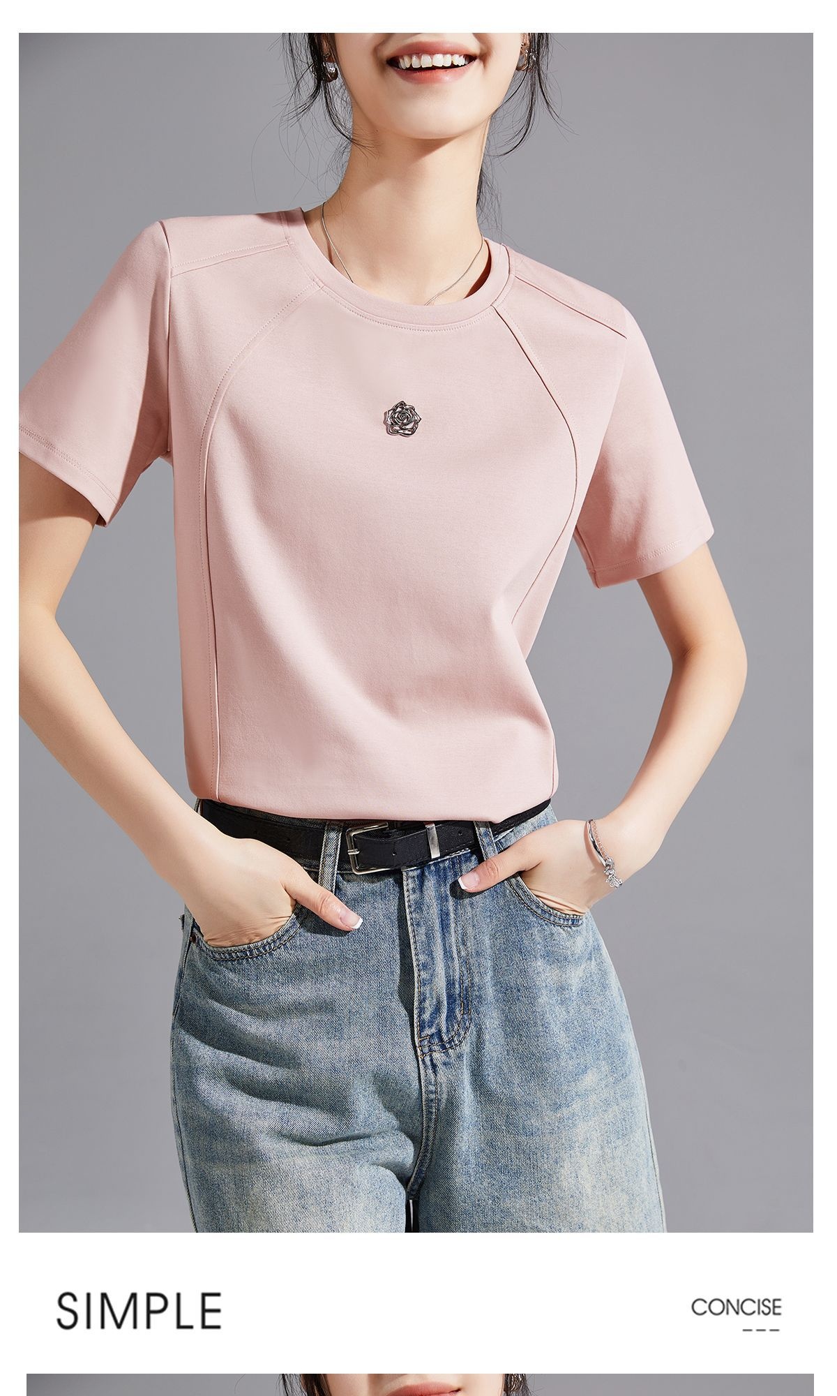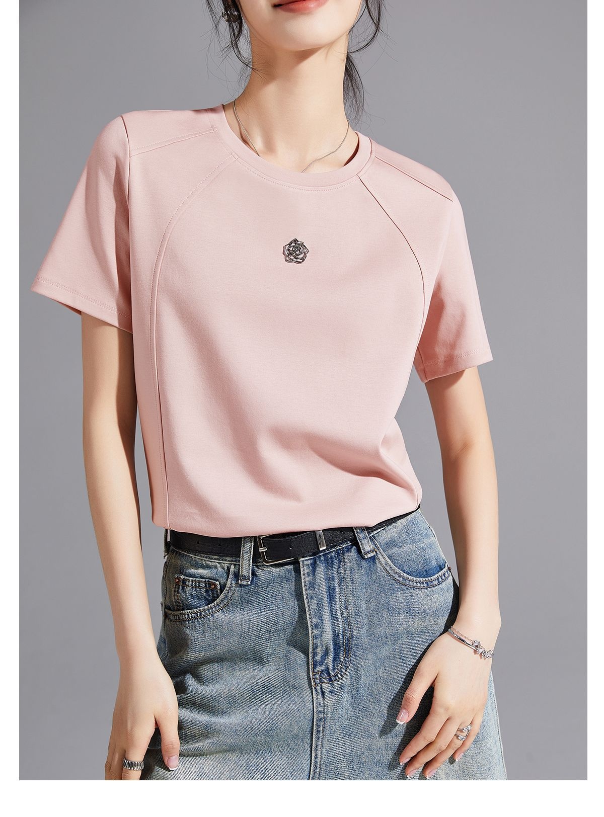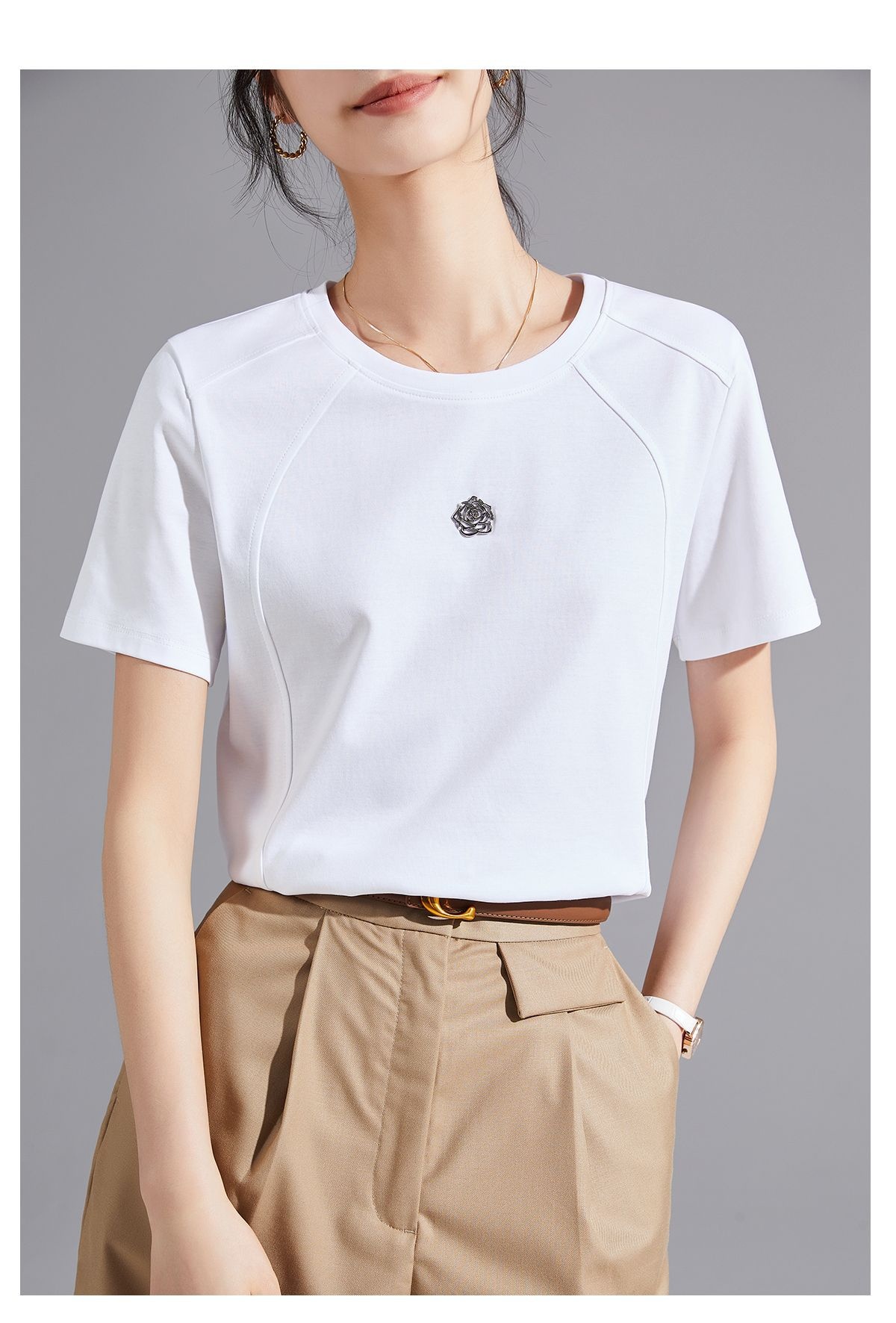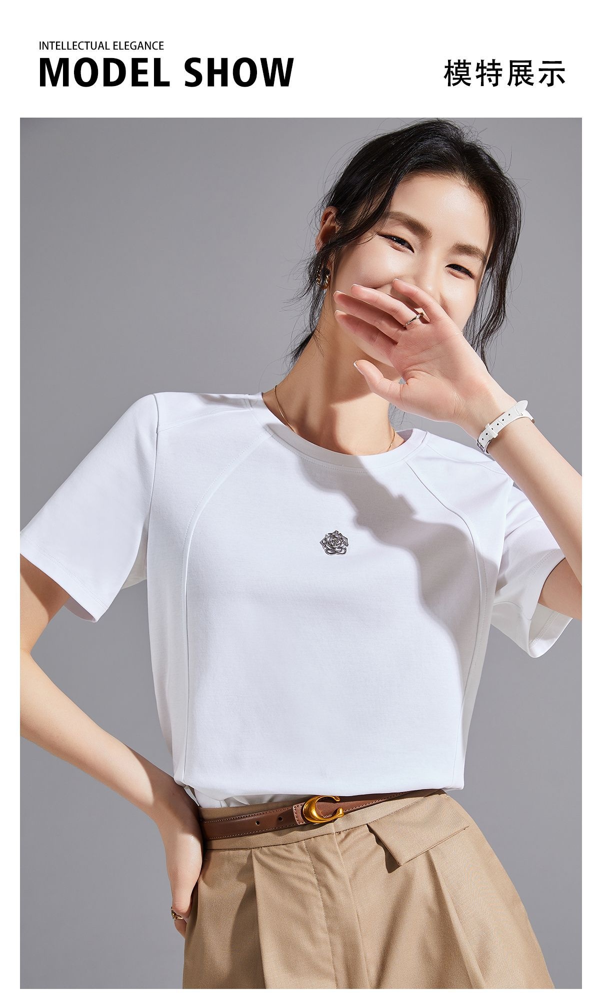「自」全新升级【铂金会员109/天猫149/差价40】(74948)洛诗琳夏季丝光棉t恤2025夏季正肩夏圆领山茶花短袖上衣女