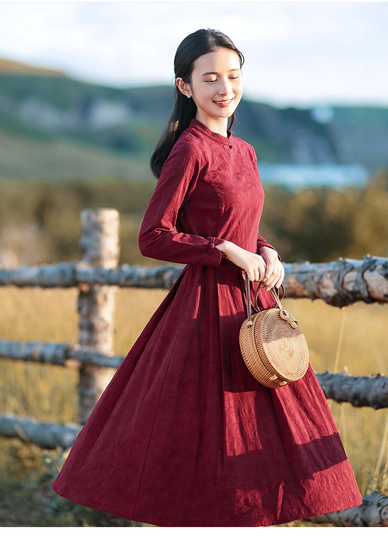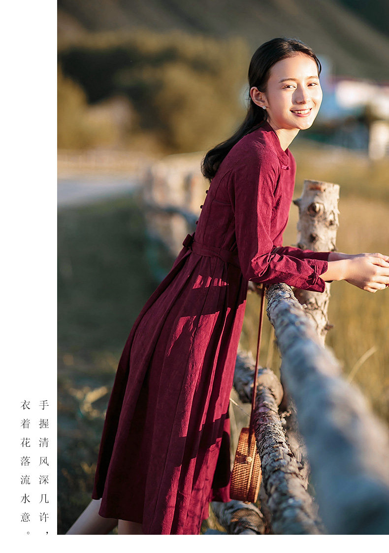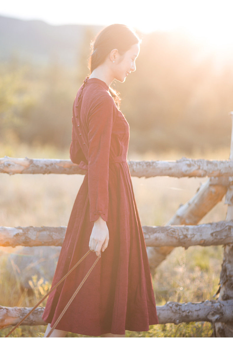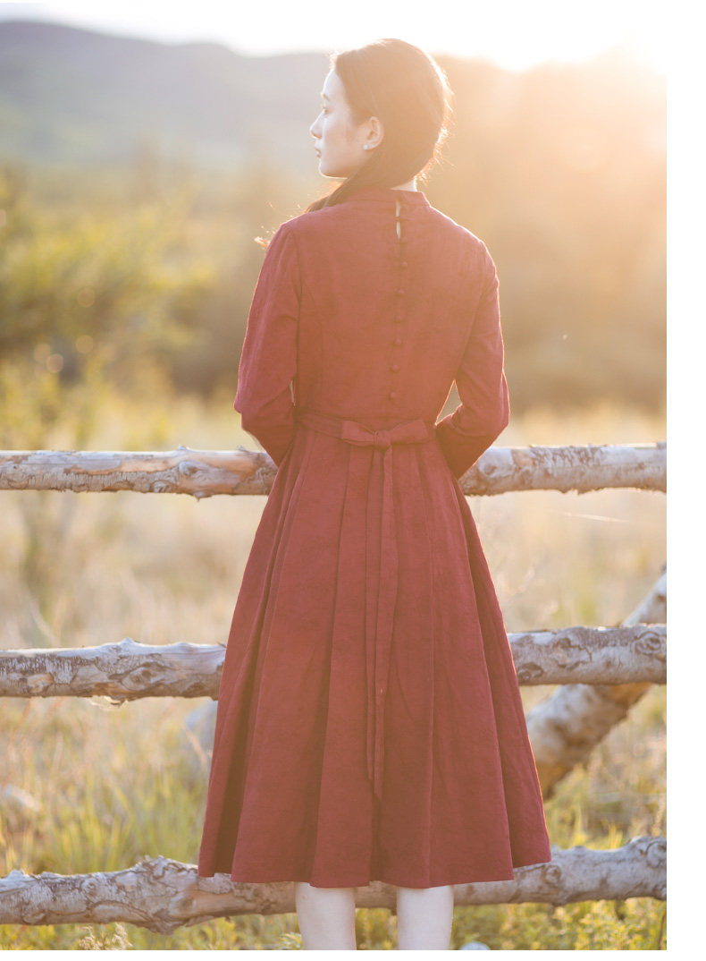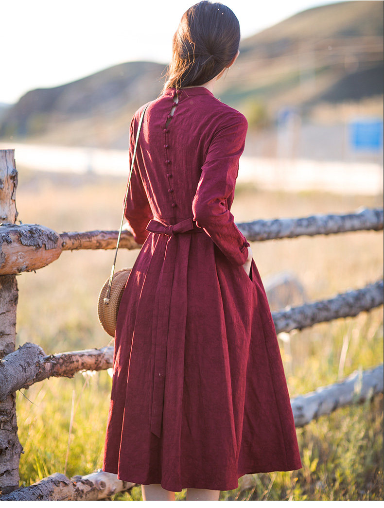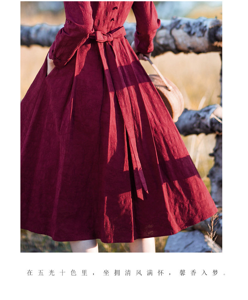 红色棉麻连衣裙中长款女装2025秋装新款春秋休闲气质长袖裙子