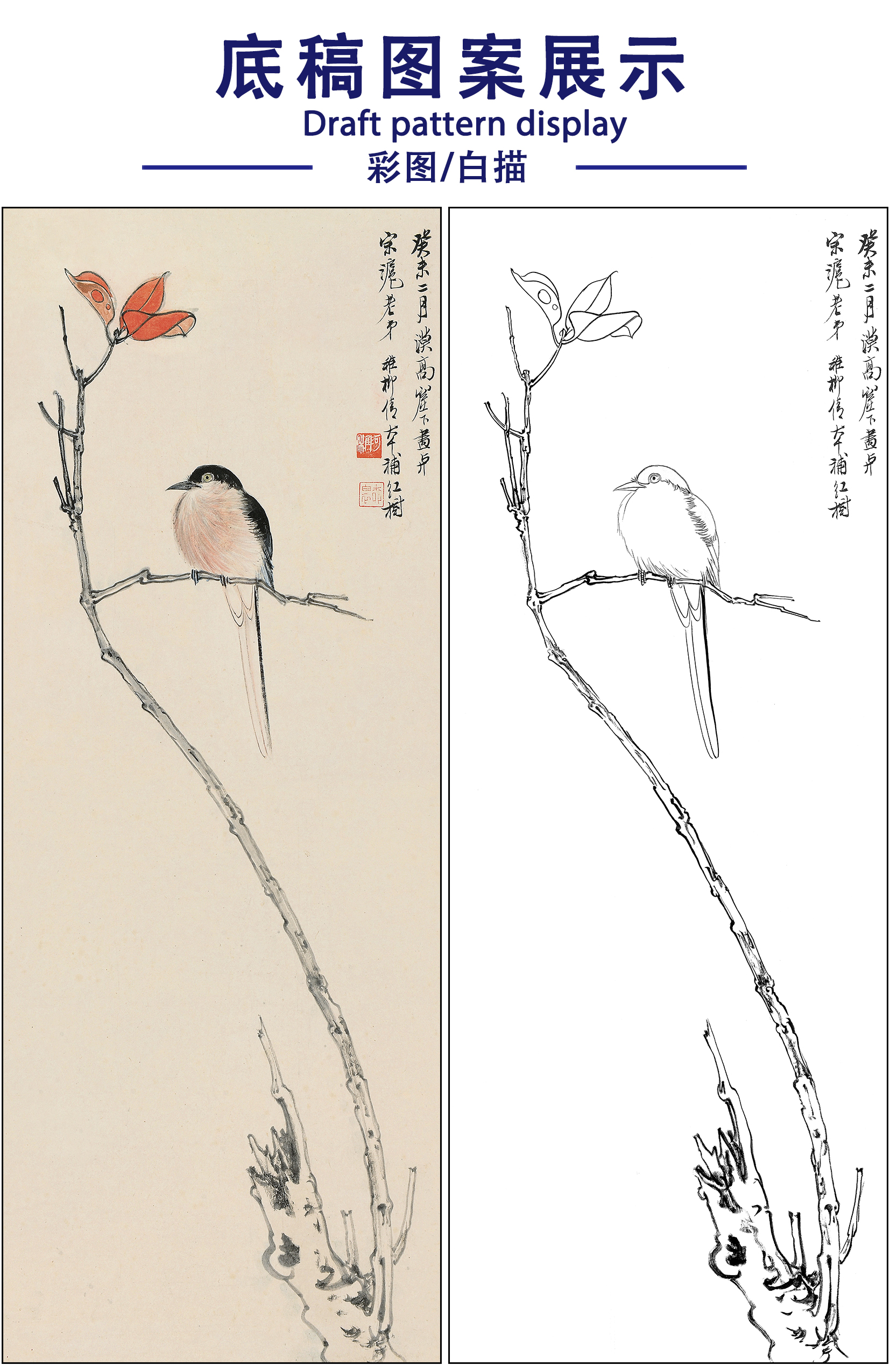 谢稚柳花鸟工笔画白描底稿《红枫小鸟》临摹勾线高清打印稿XZ53