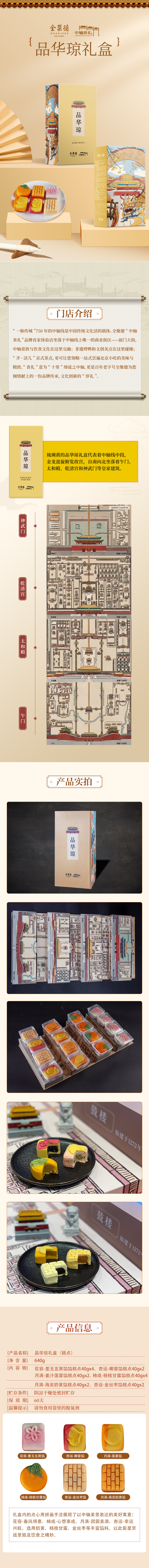“中轴食礼”礼盒将中轴线的对称中和之美融入“古书竹简”理念,红黄蓝三色卷轴分别对应中轴线的南中北三段,展开卷轴即打开礼盒,三条卷轴首尾相连,从南至北以永定门为始,钟楼为末的12座建筑构建成的中轴线古貌跃然眼前。盒内盛装精心选材、富含寓意的美点,外部画面以烤制、上桌和品尝烤鸭的画面为主线,展现了京城百姓生活、京廷景致和自然人文的美好场景。