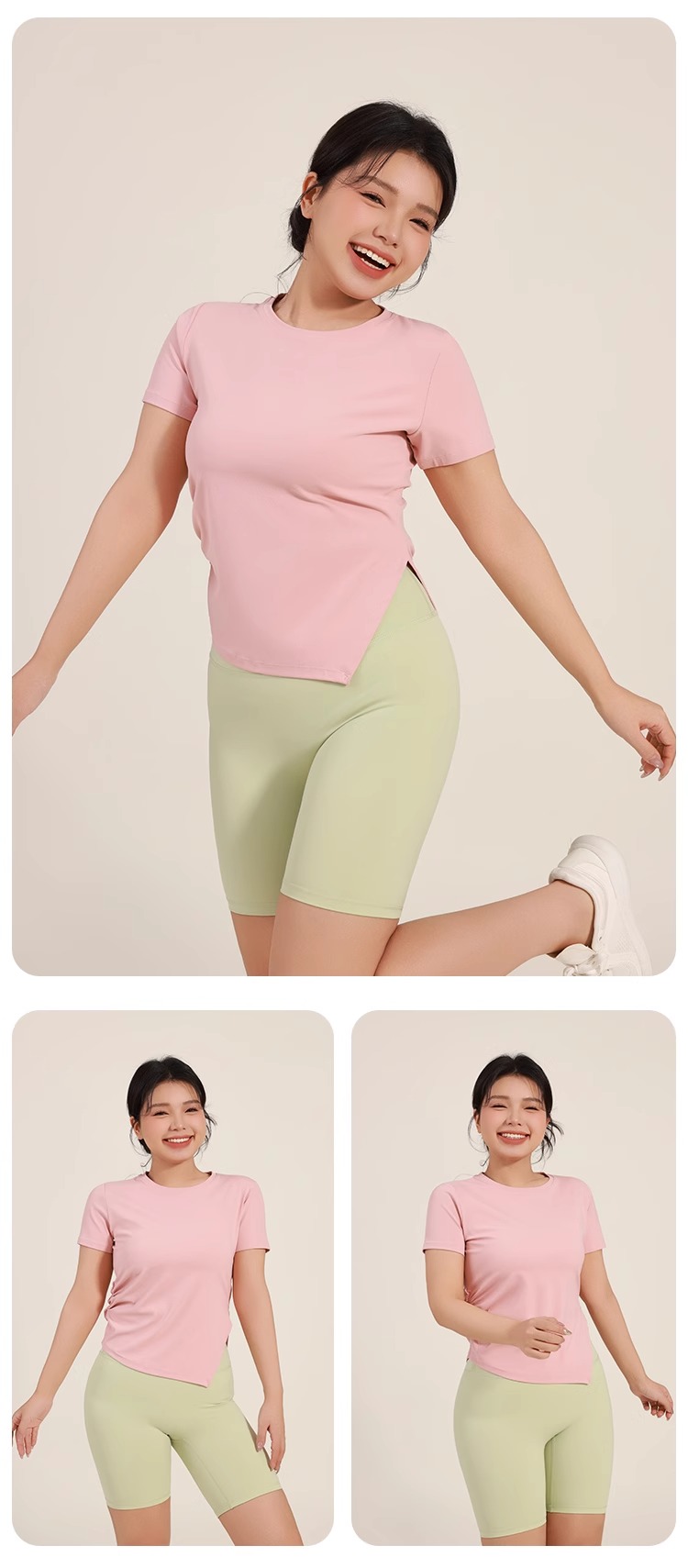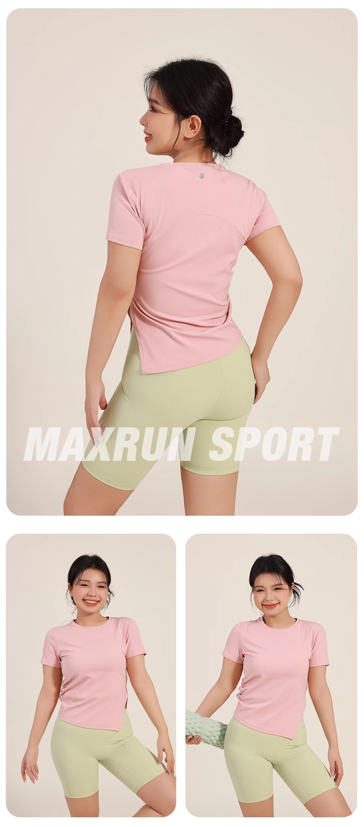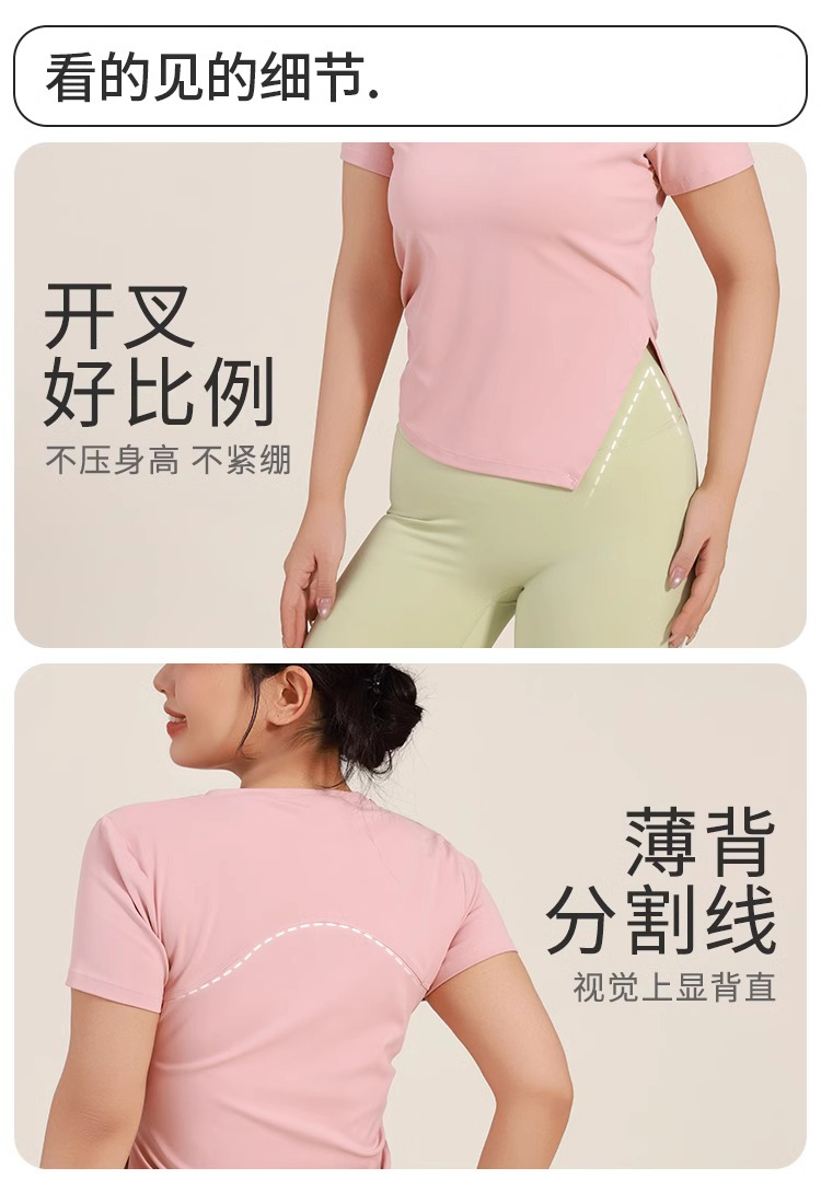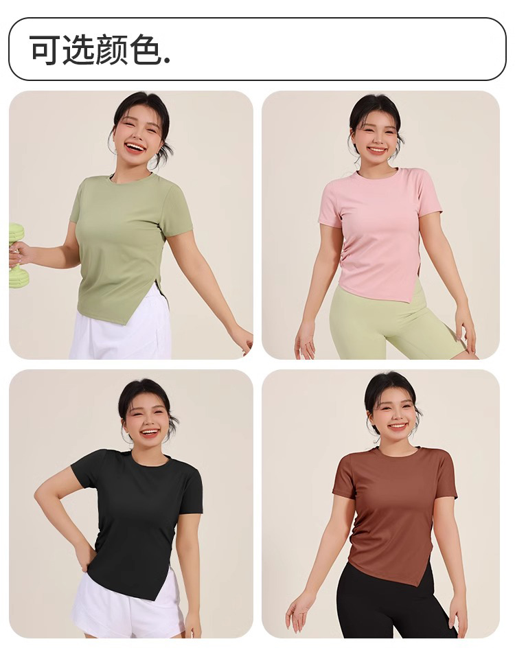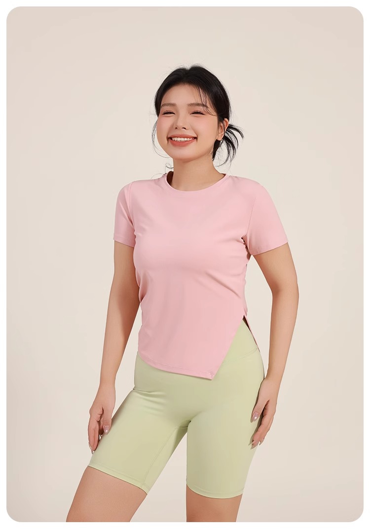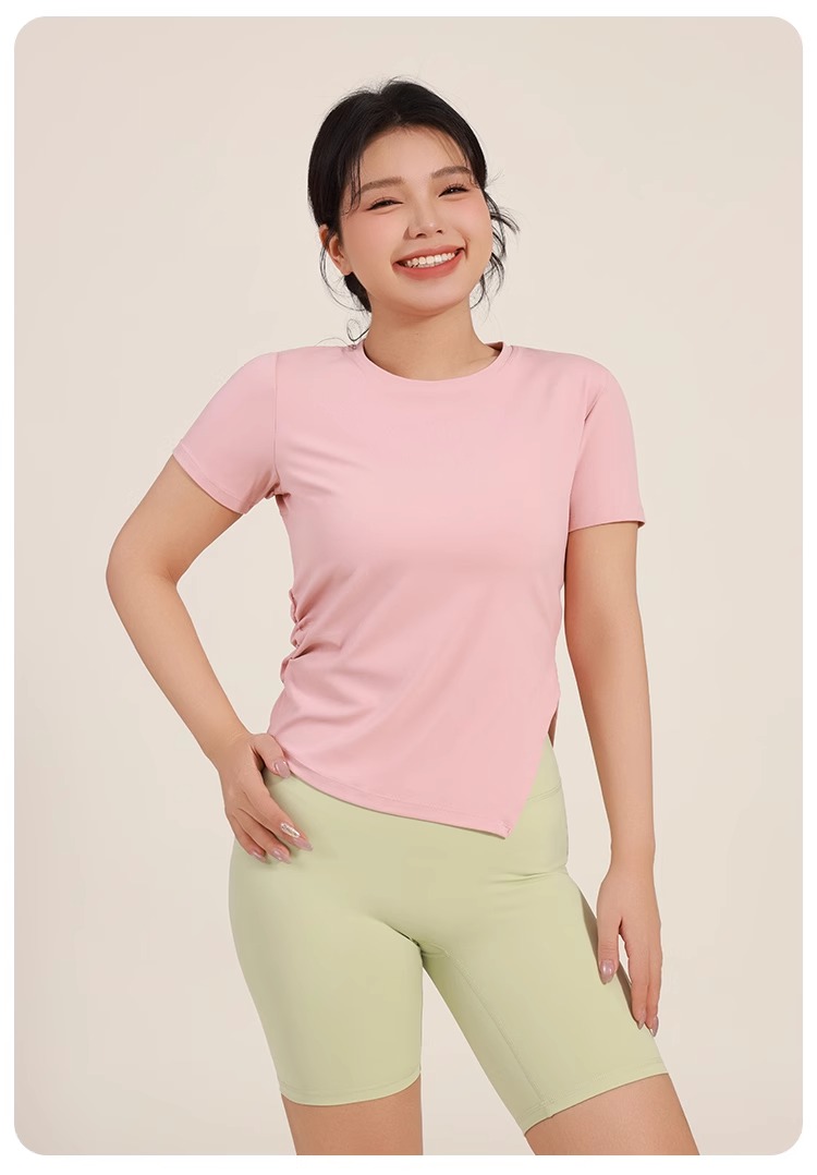 跃牌(呗咪纷纷系列)褶皱显瘦修身不规则开叉瑜伽服短袖圆领运动瑜伽T恤DX3012