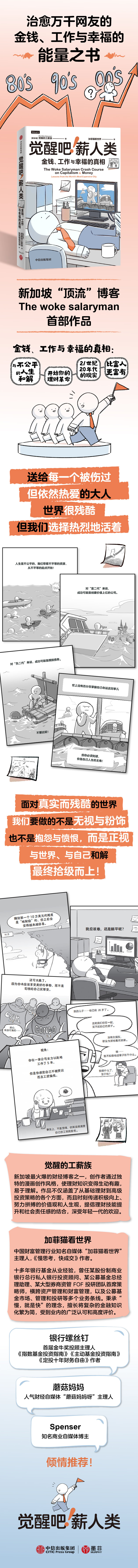 治愈万千网友的有关金钱、工作、幸福与人生的能量之书。新加坡具影响力的财经媒体之一“觉醒的工薪族”的理财漫画,帮助年轻人树立正确金钱观与价值观,开启财务革命!作者以辛辣幽默的文笔和温馨治愈的漫画,讨论了贫富差距、阶层固化、成功与幸福、财富积累、新手投资、消费降级、奋斗vs.躺平等当下年轻人关心的一些问题,并给出睿智的解答,引人深思。