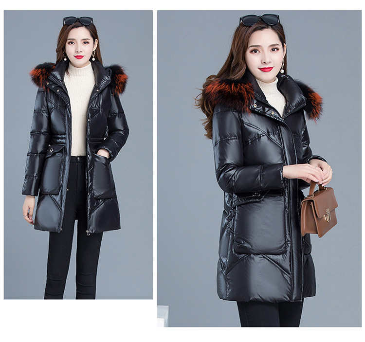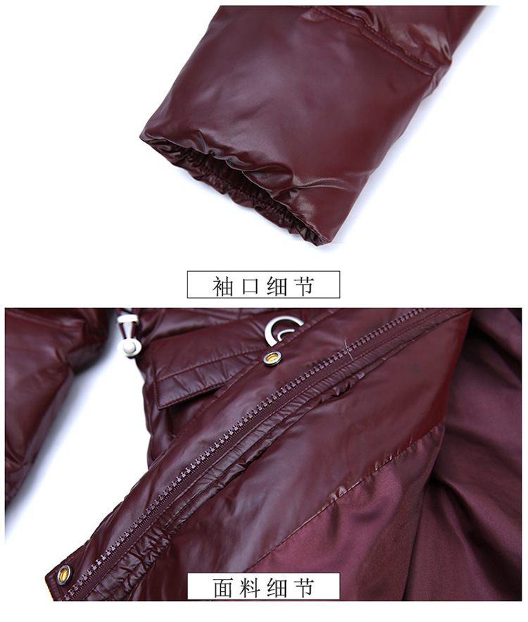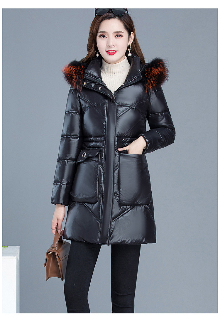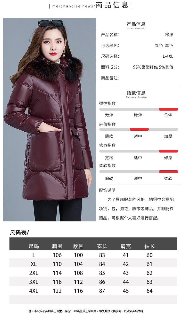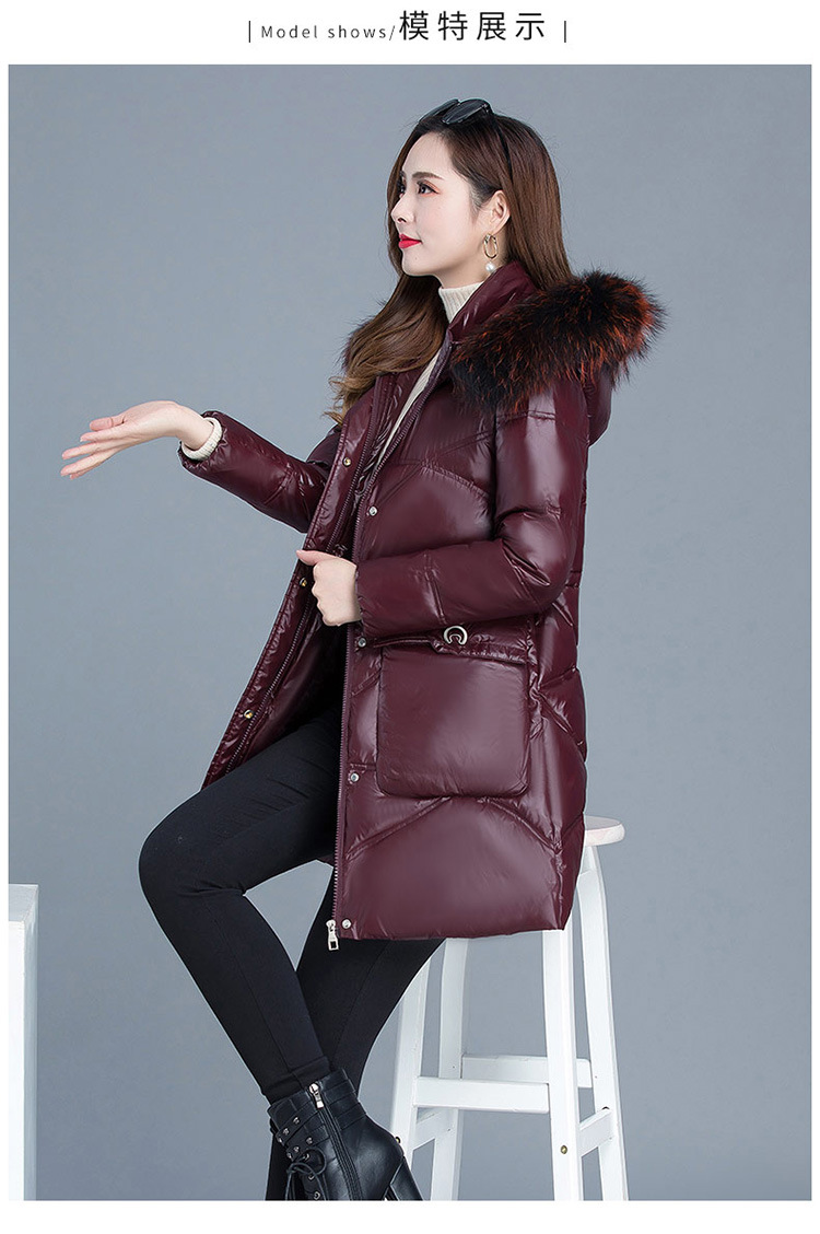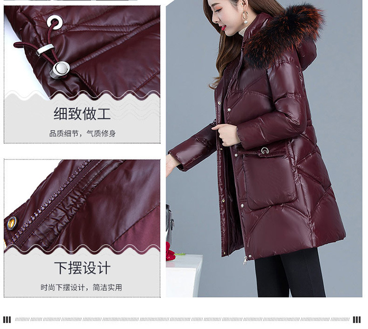 QYM-LLZ-FG817-Y新款时尚优雅气质毛领连帽中长款亮面加厚棉服外套