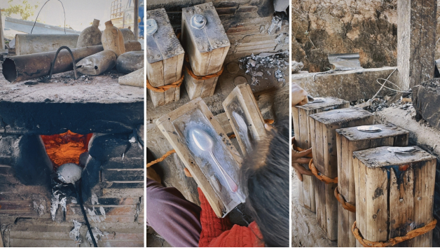 村民收集战争废料的金属铝铸造成勺子和各种形状的纪念品。